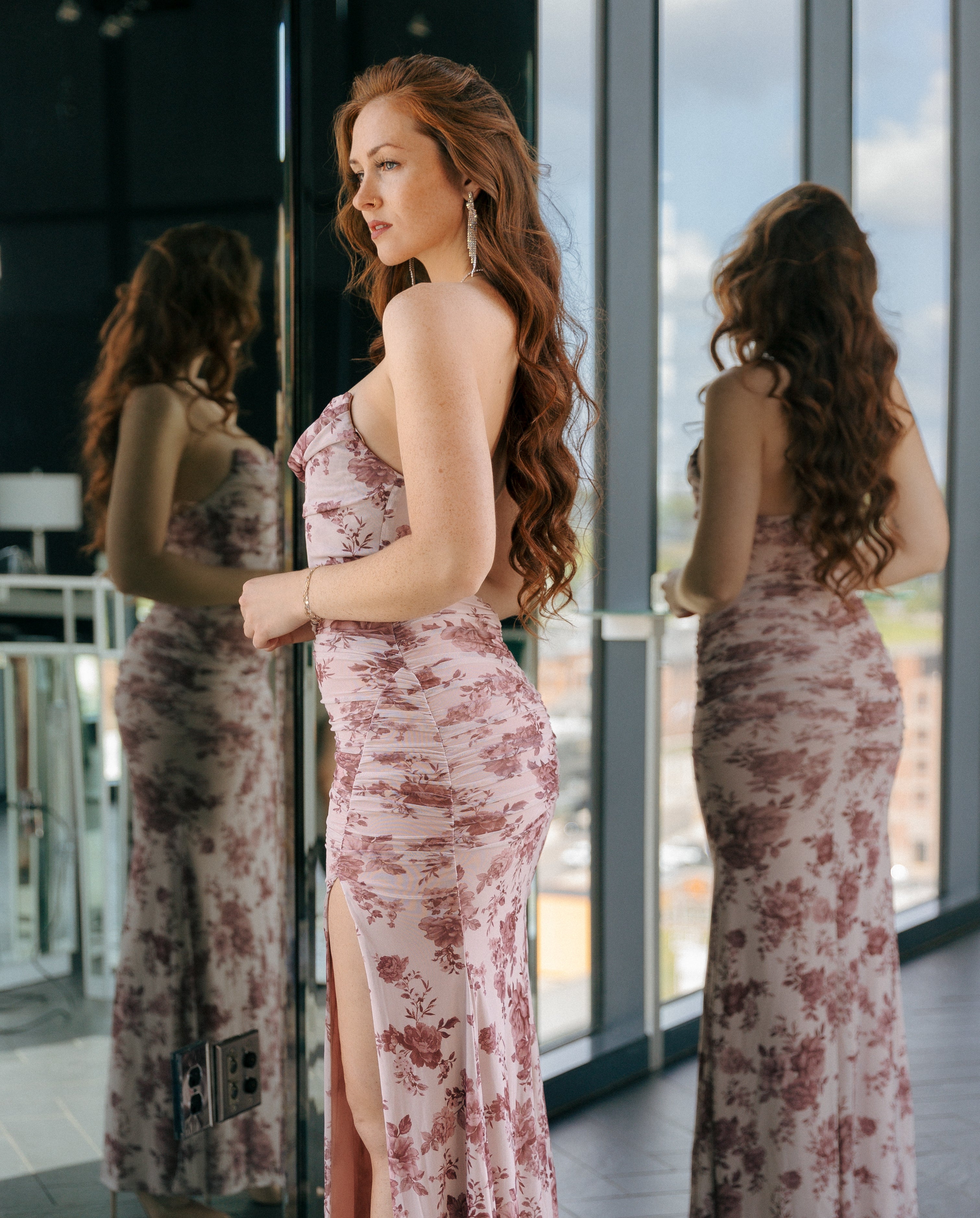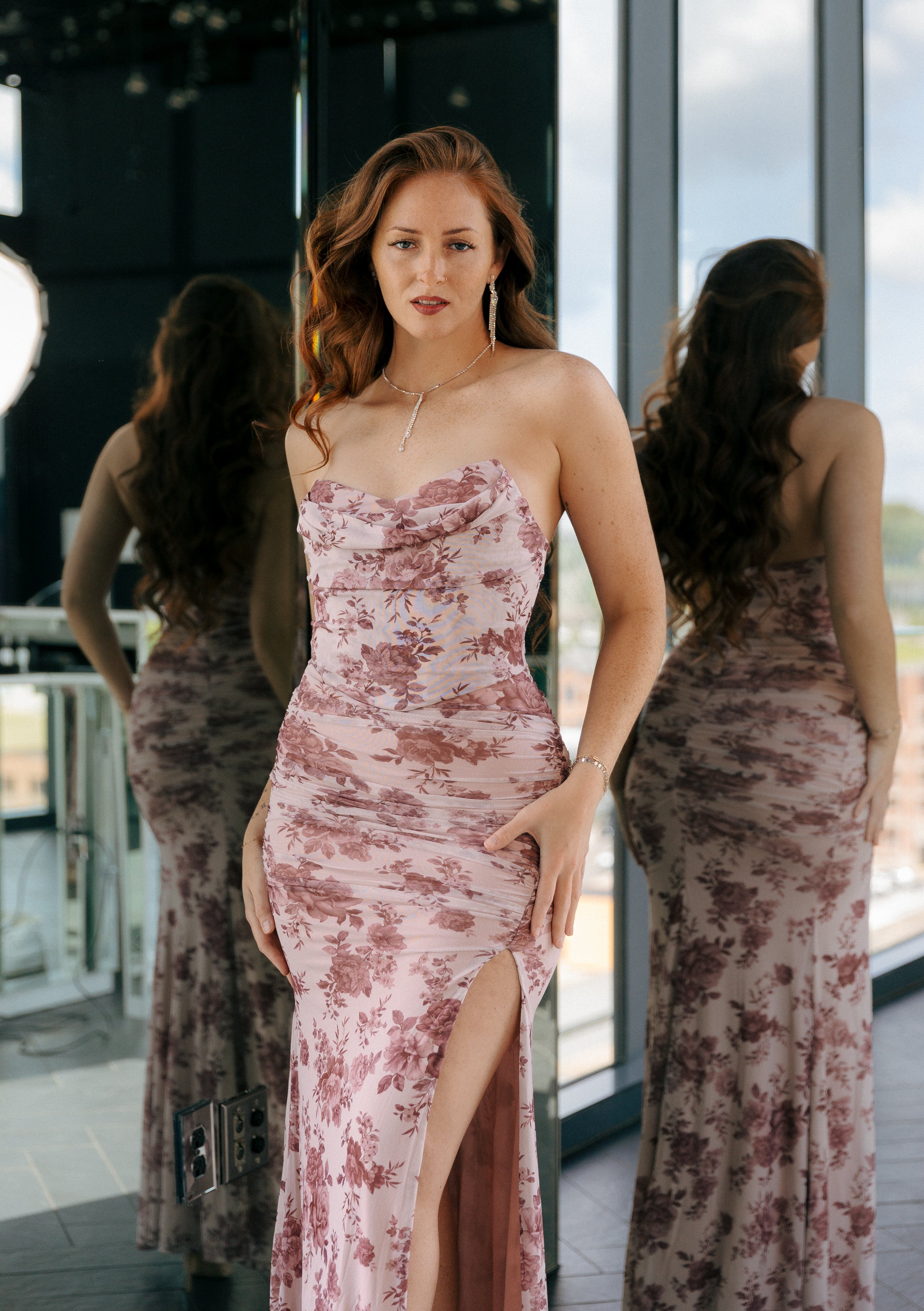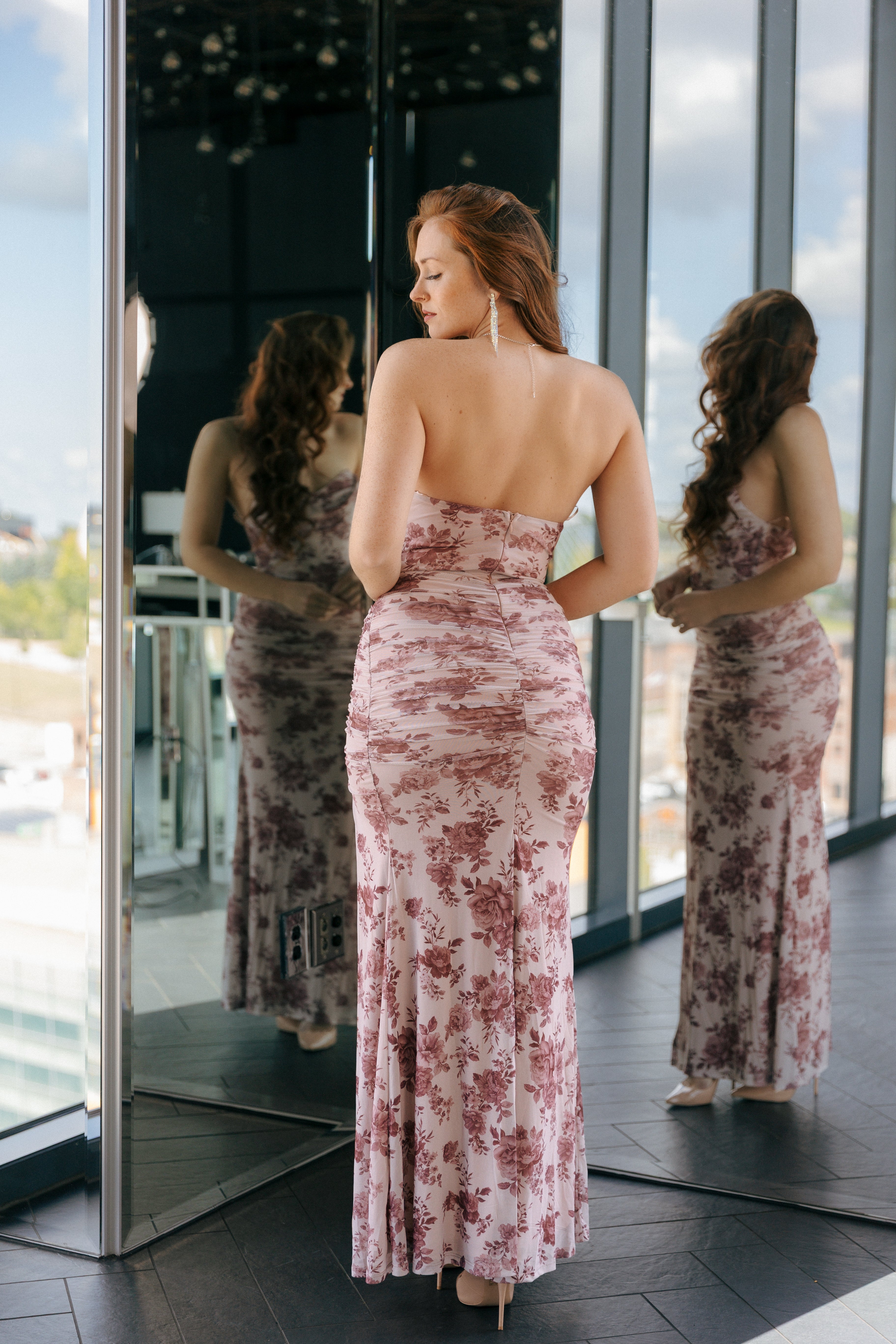 Make an elegant statement in this strapless floral maxi dress, designed with a softly draped neckline and all-over ruching for a figure-flattering fit. Crafted in a lightweight, flowy fabric, it offers effortless movement and a romantic floral print, perfect for weddings, garden parties, and evening occasions.