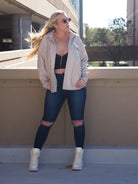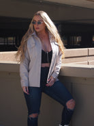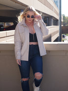 This vegan leather jacket features double-breasted front pockets and is the perfect capsule piece. The oversized fit and snap-down closure are super easy to style. Detailed with side hidden pockets for easy access to your all your essentials. Fully lined and super easy to style.