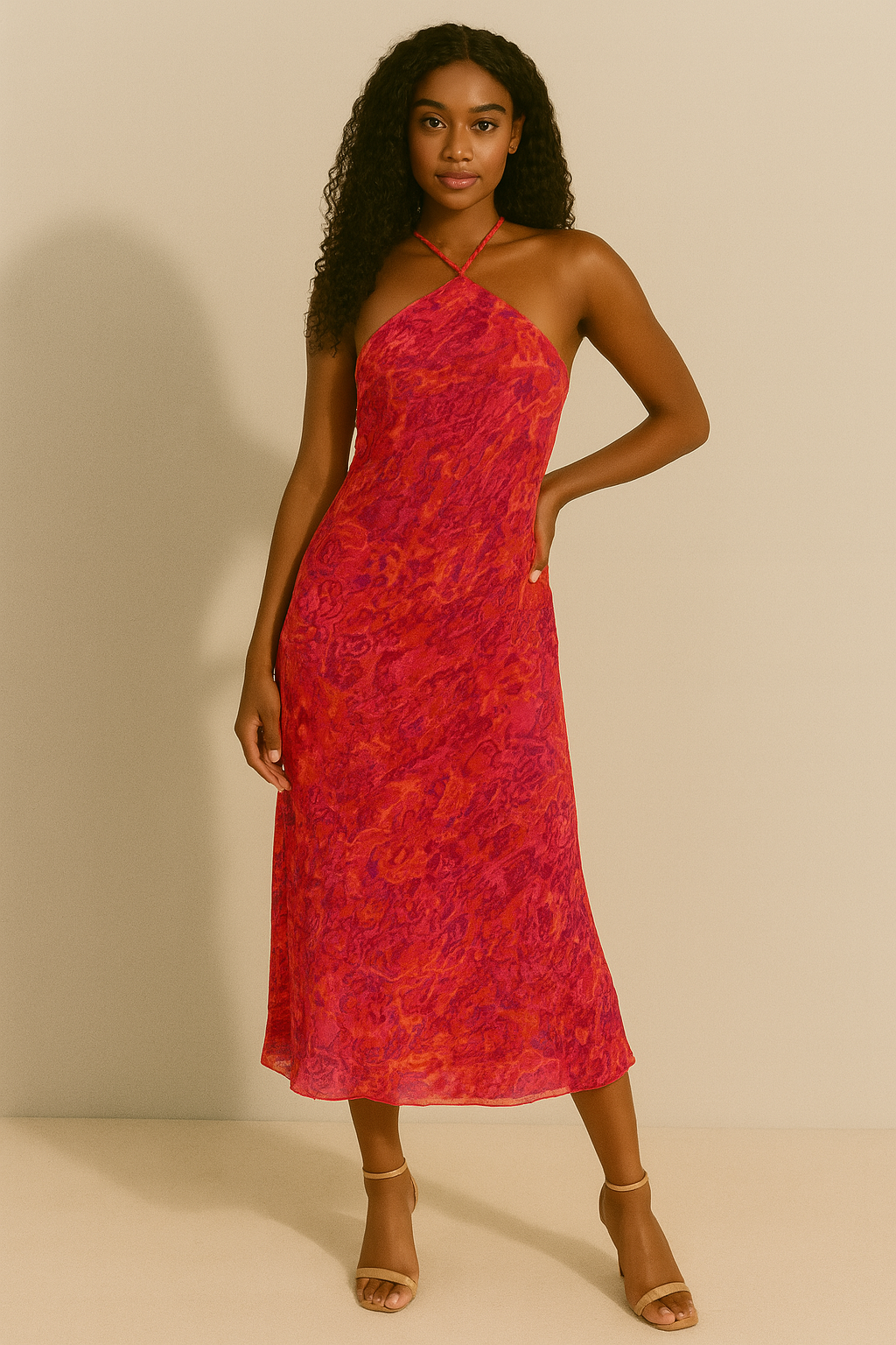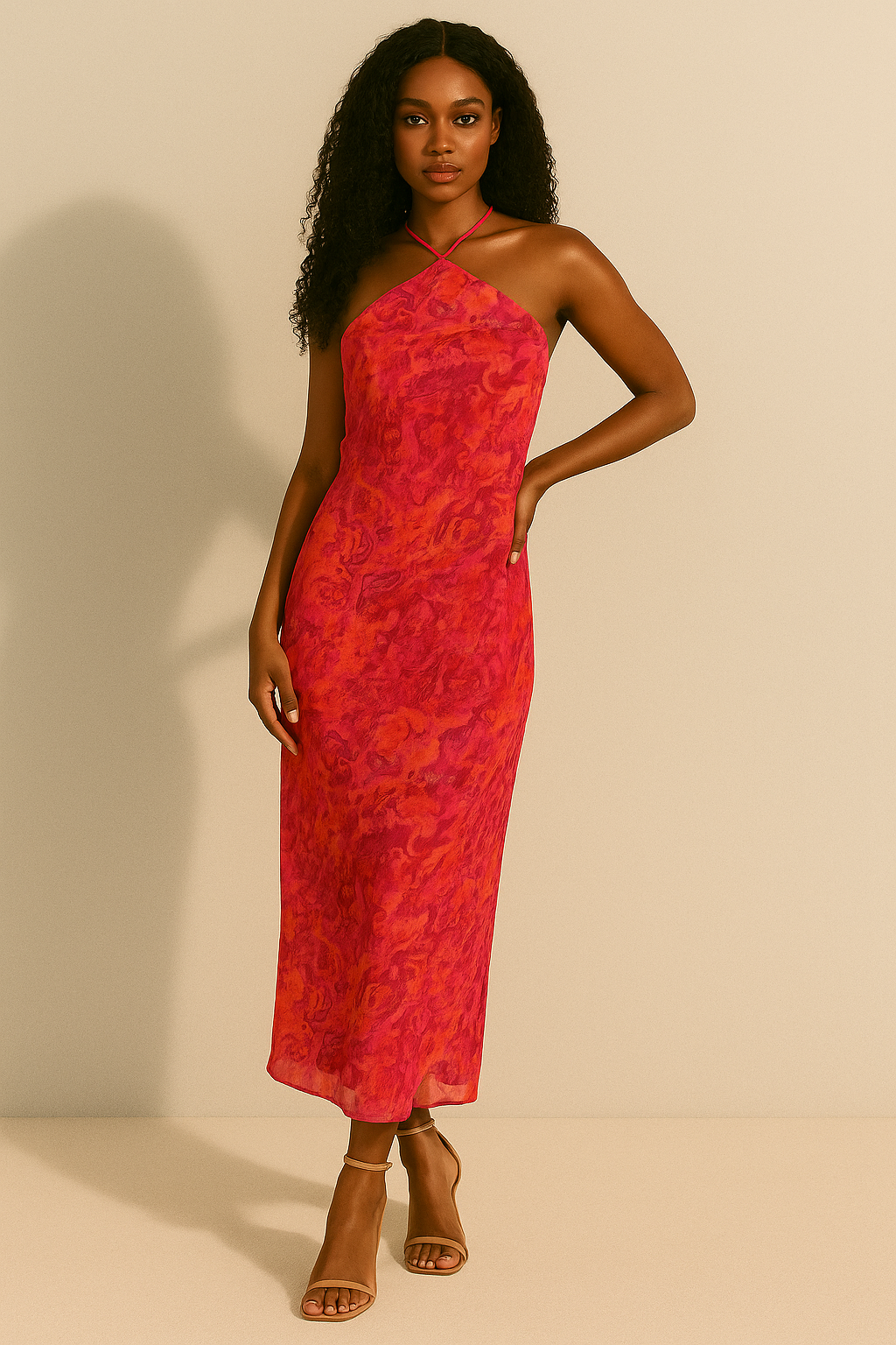 Make an unforgettable entrance in the Crimson Sunset Halter Midi Dress. This vibrant piece features a striking abstract print in fiery reds and pinks, perfect for turning heads at any event. The sleek triangle halter neckline with delicate straps adds a modern, flirty touch, while the straight, ankle-grazing silhouette drapes beautifully for an effortlessly chic look. Crafted from lightweight, silky fabric, it’s ideal for everything from sunset dinners to nights out on vacation. Pair with strappy heels for a show-stopping ensemble.