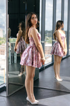 Make a romantic statement in this fit-and-flare mini dress, designed with a soft floral overlay and a subtle shimmer throughout. The structured bodice features underwire-style contouring for added shape and support, while double spaghetti straps and a full gathered skirt create a flirty silhouette. Perfect for date nights, garden parties, or any event that calls for a touch of sparkle.