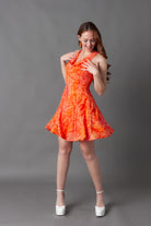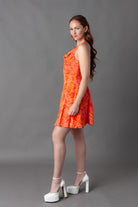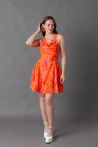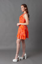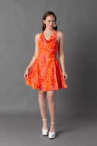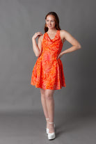Discover the flirty and playful Giza Printed Cowl Neck Mini Dress. The striking tangerine color and adjustable cross back straps make it a perfect, super feminine choice for a summer event. Add a touch of fun and style to your wardrobe with this mini dress.