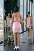 This intricately detailed mini dress features shimmering sequin embroidery in an ornate pattern, paired with a flattering square neckline and slim shoulder straps. The fitted silhouette is enhanced by a lace-up corset back, offering both structure and adjustability. A standout choice for events, parties, or any moment that calls for sparkle.