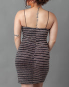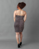 This rose gold glitter mini dress is the perfect addition to your wardrobe. It features a sparkly rose gold and black glitter metallic striped fabric and is lined for comfort and durability. The spaghetti straps and stretchy fabric provide an effortless fit, making it perfect for any event or party.