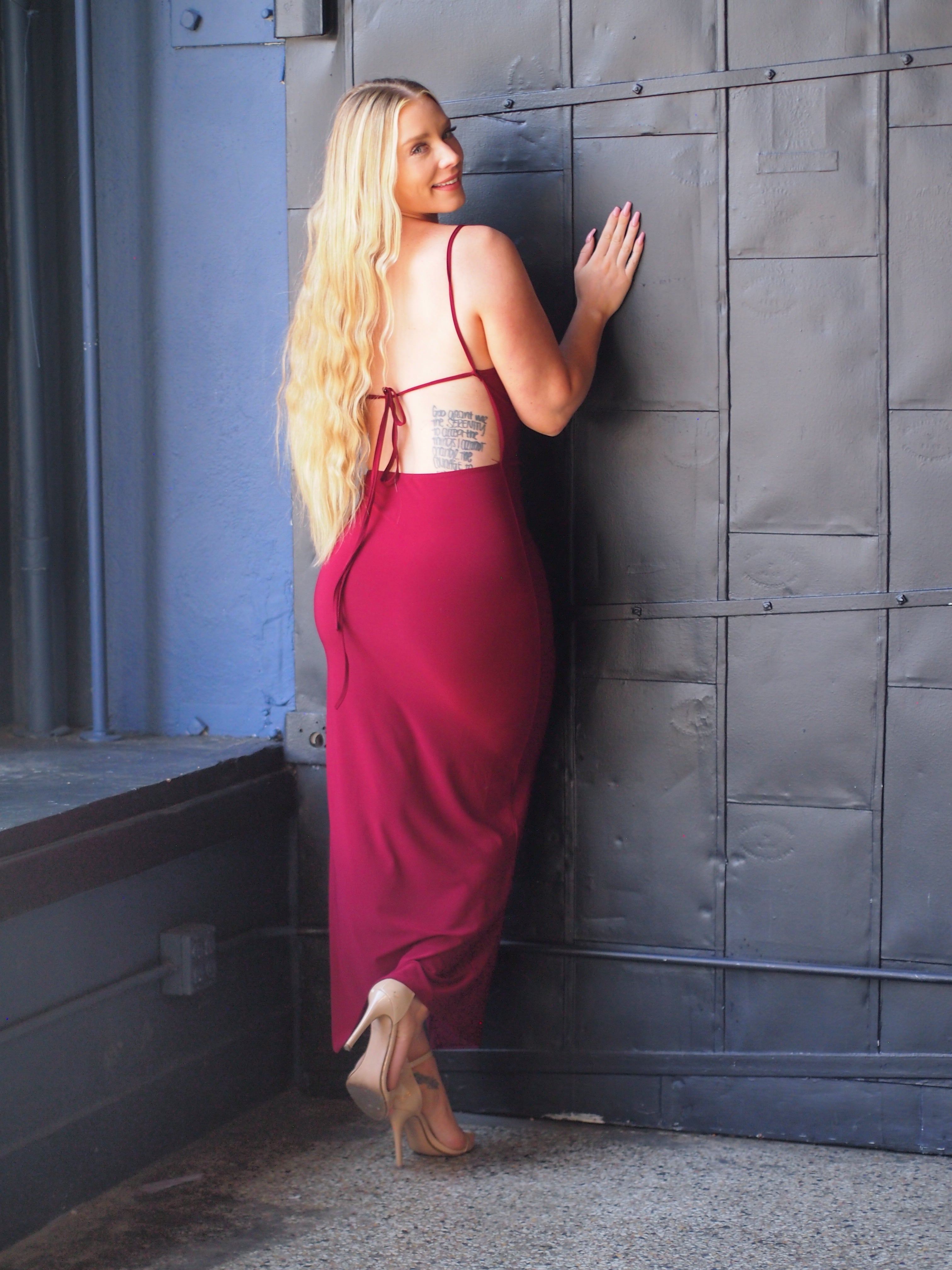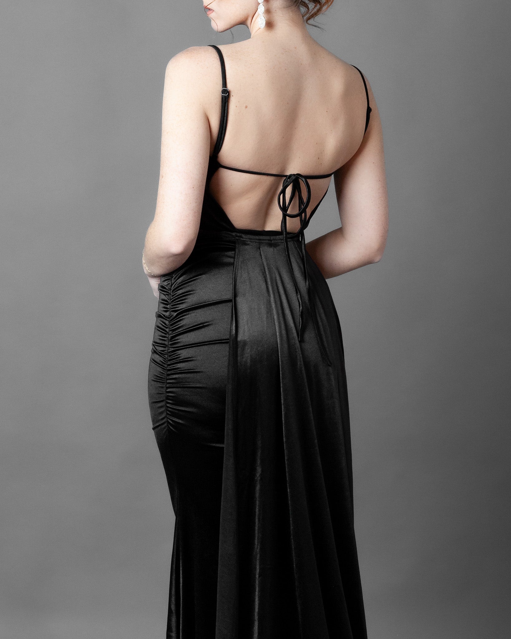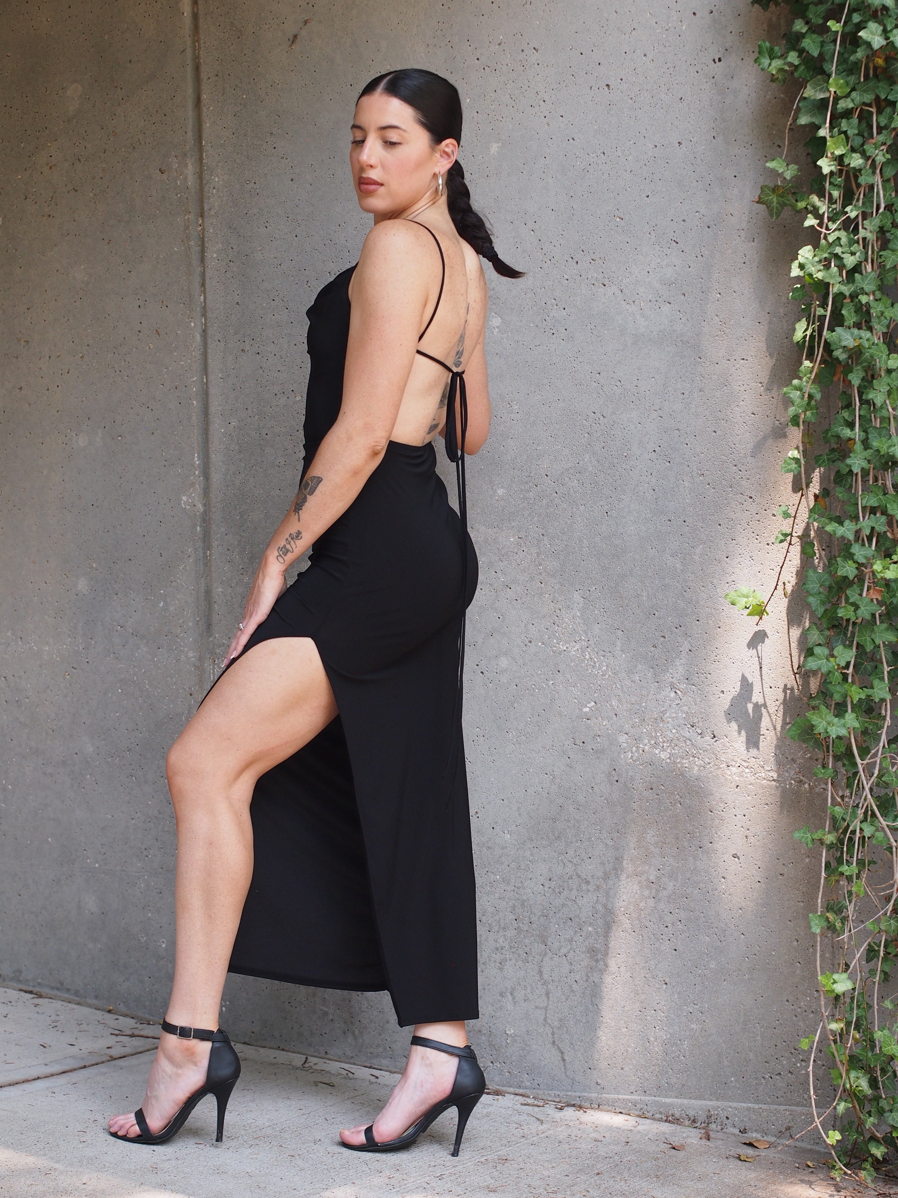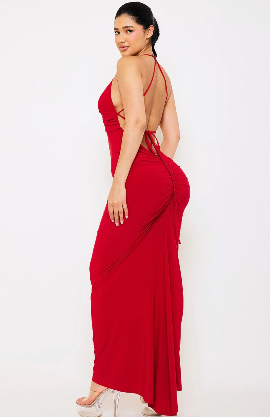 Cowl Neck Open Tie Back Maxi Dress + Thigh Slit