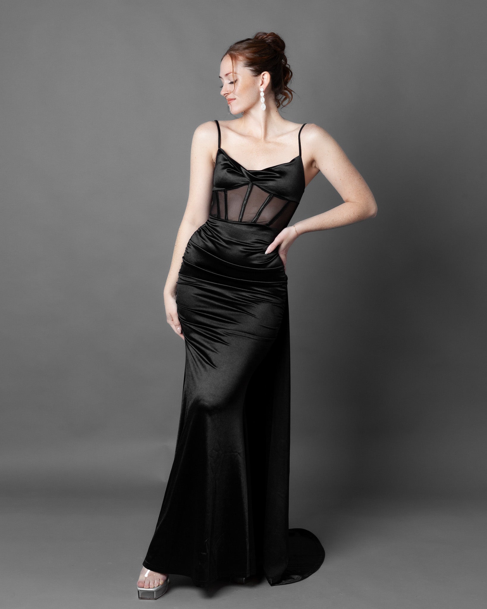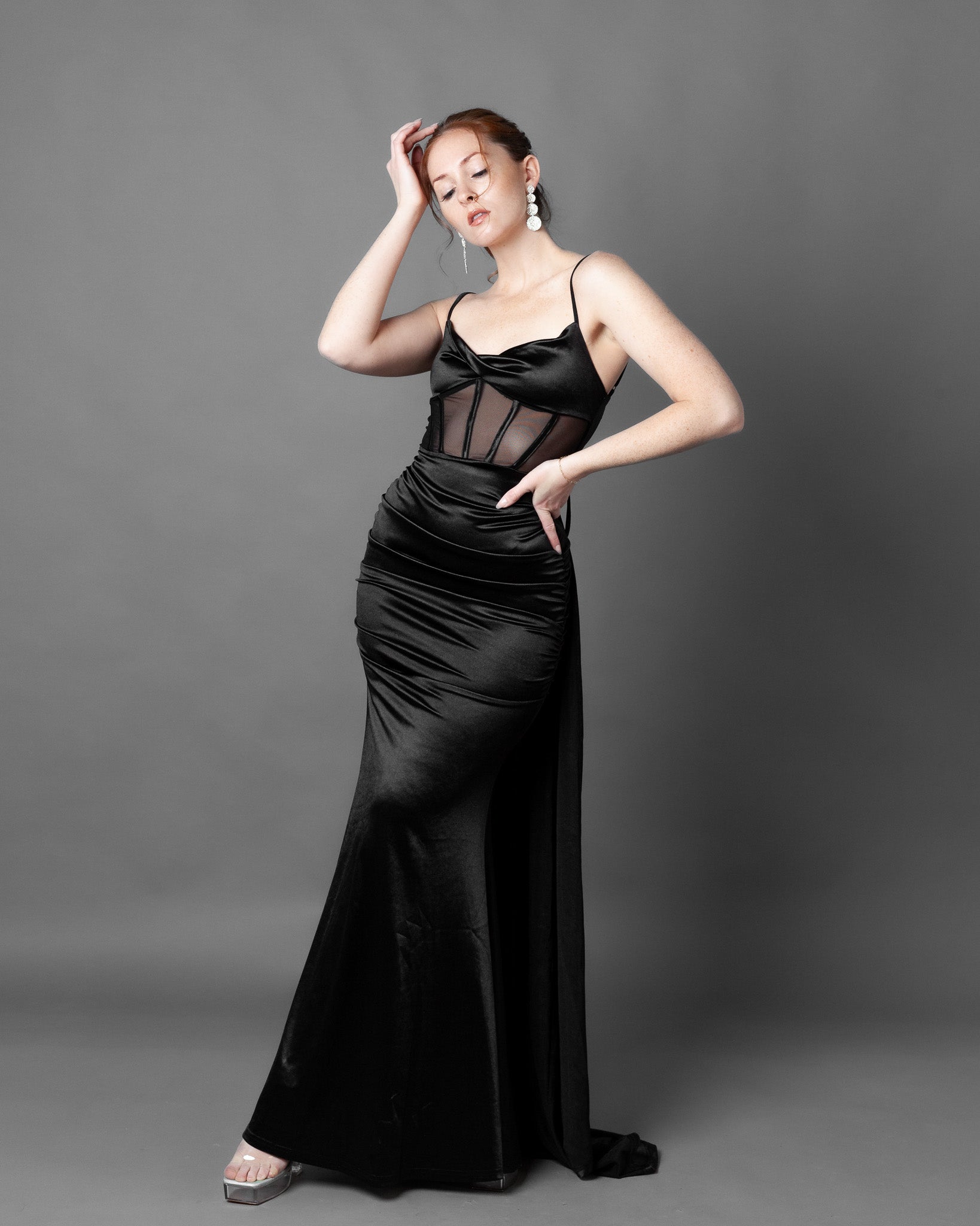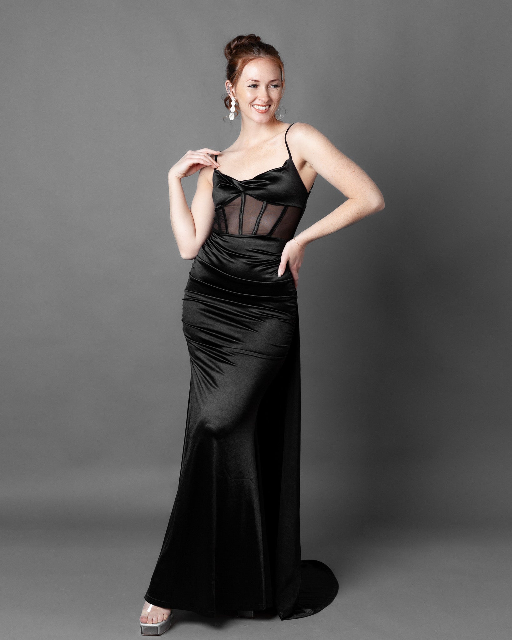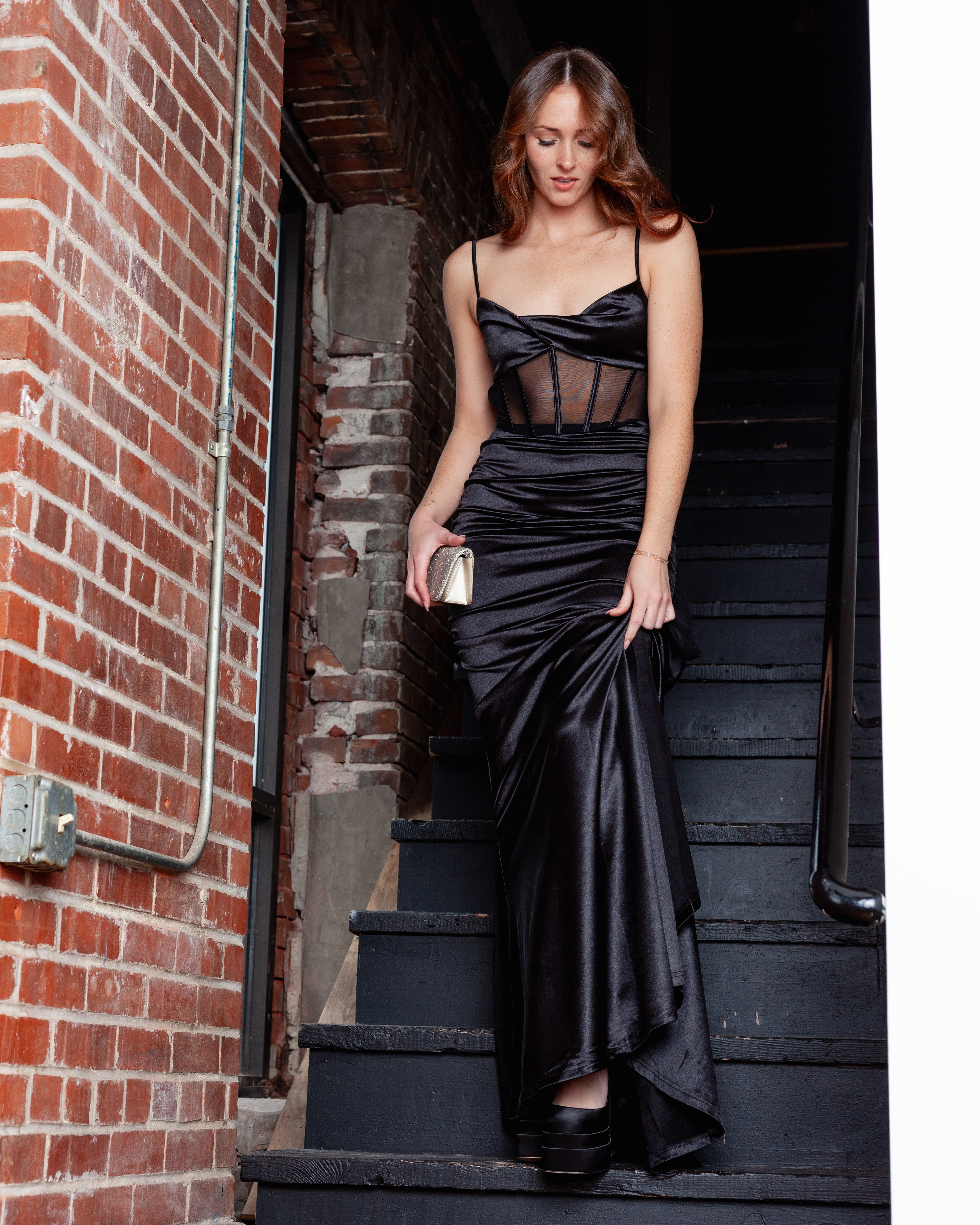 London Corset Satin Maxi Dress + Train