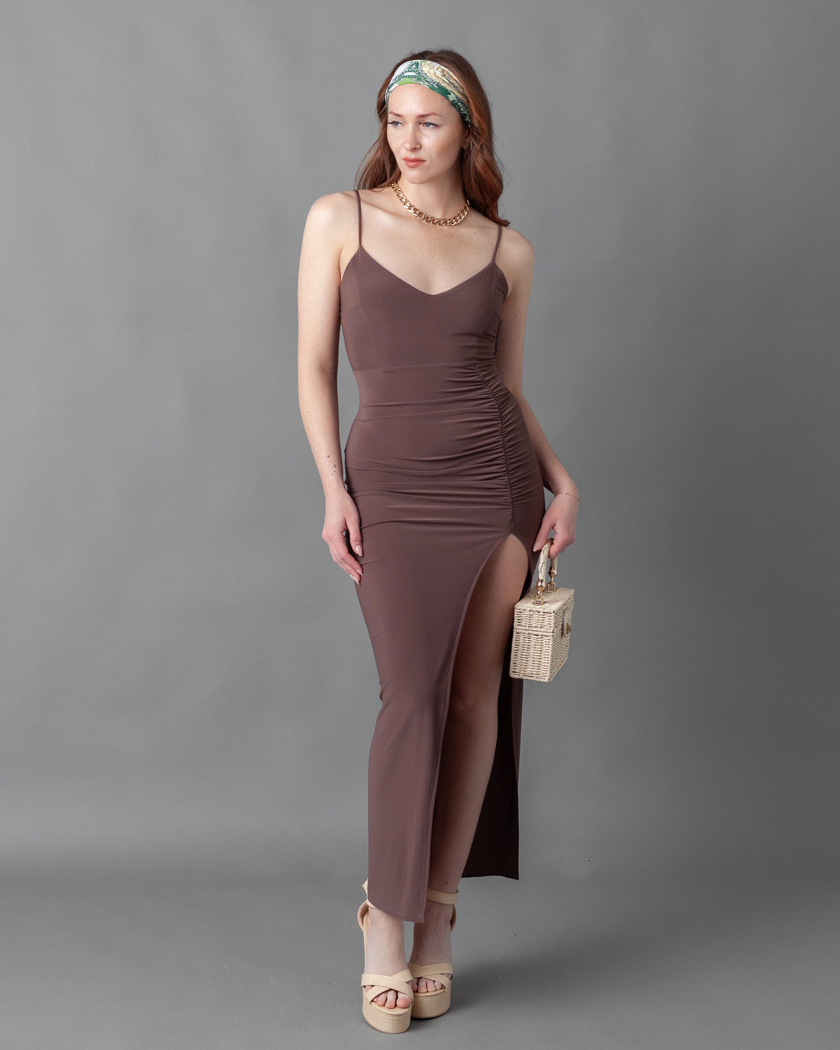 Budapest Maxi Spaghetti Strap Dress With Front Rouched Thigh Slit