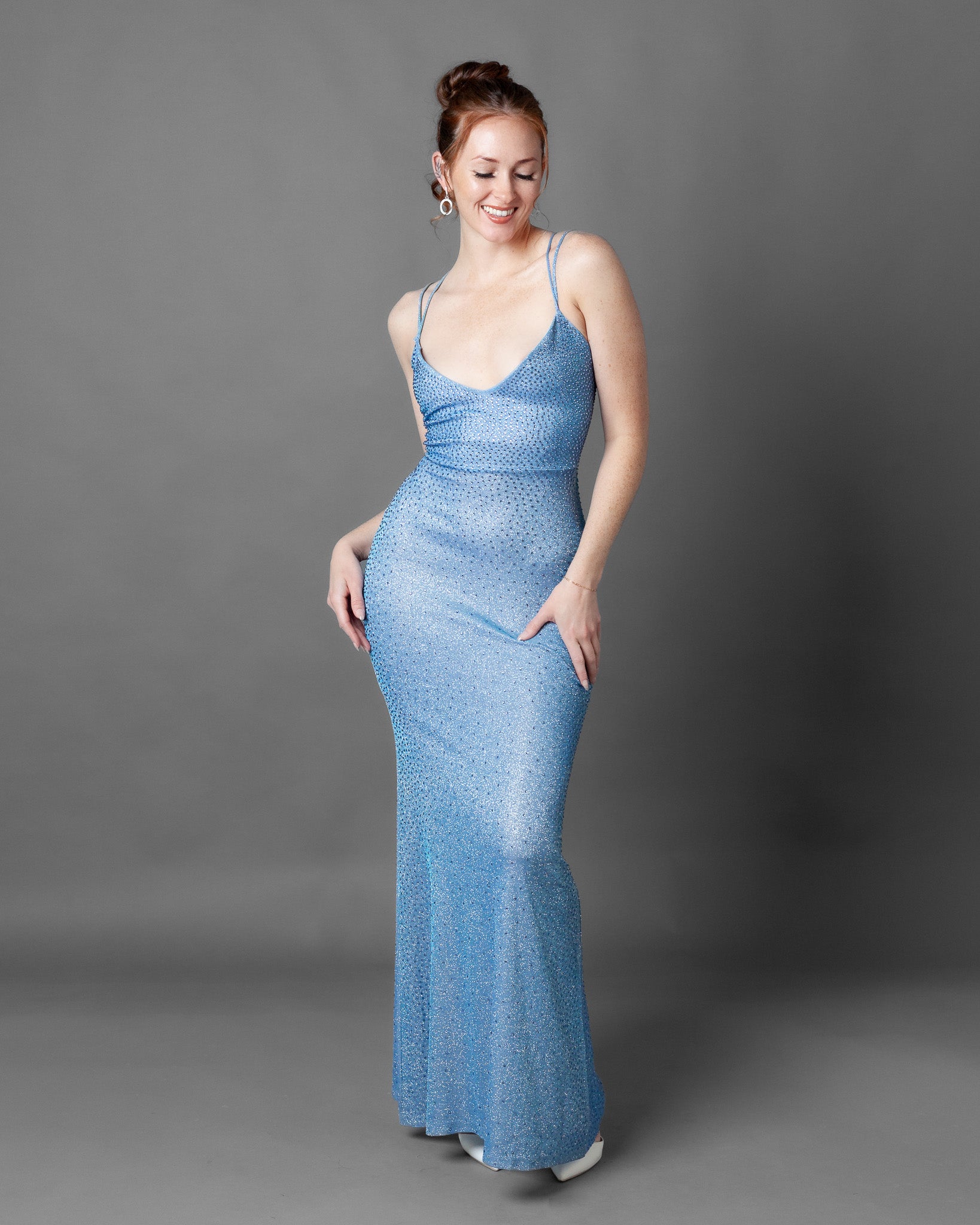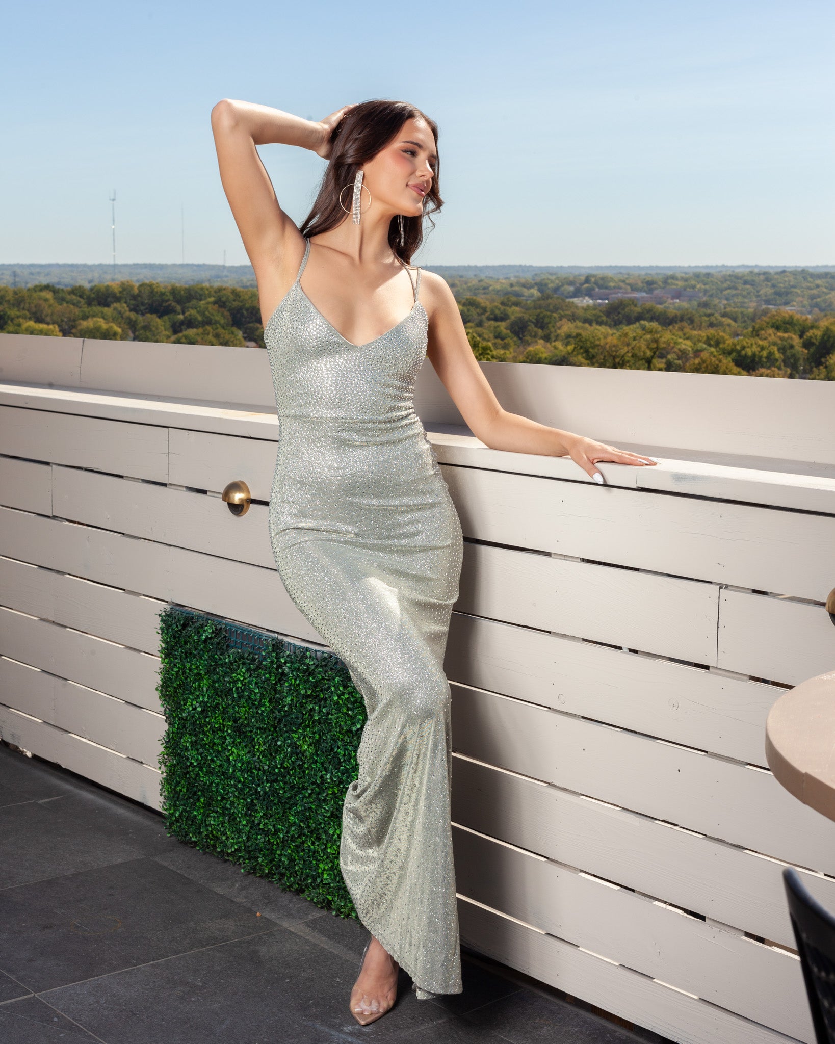 Sydney Ruched Foil Mermaid Cut Maxi Dress + Spaghetti Straps