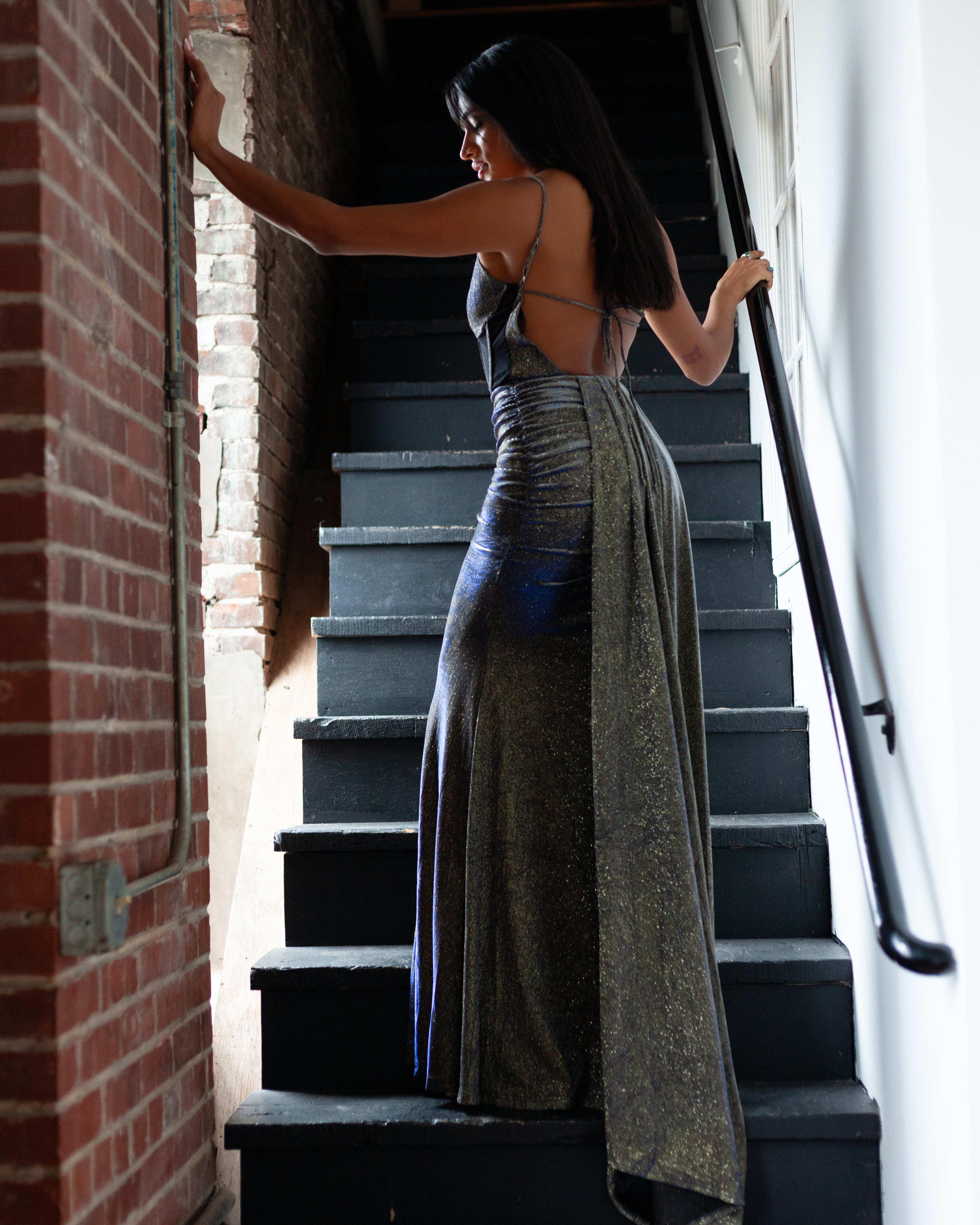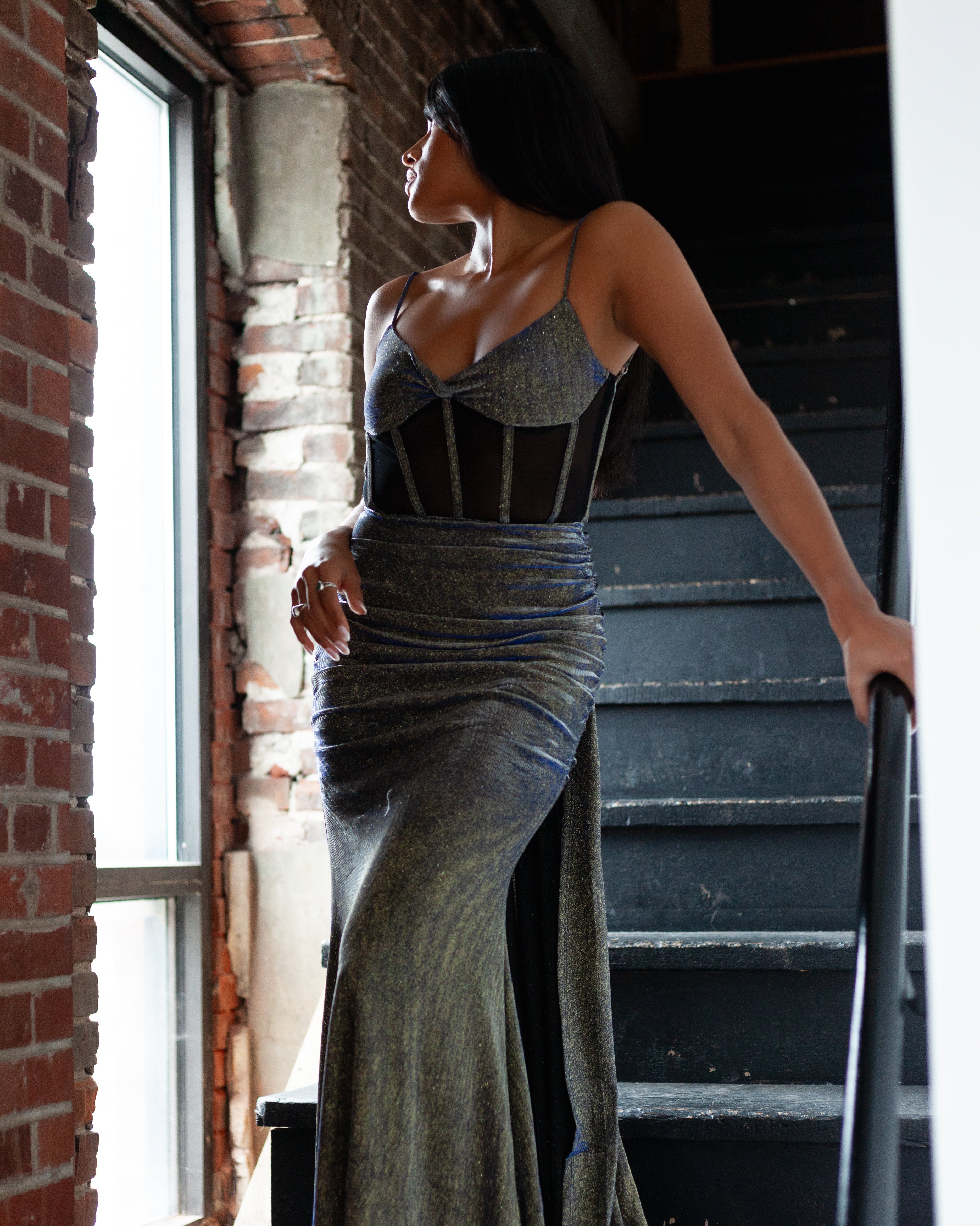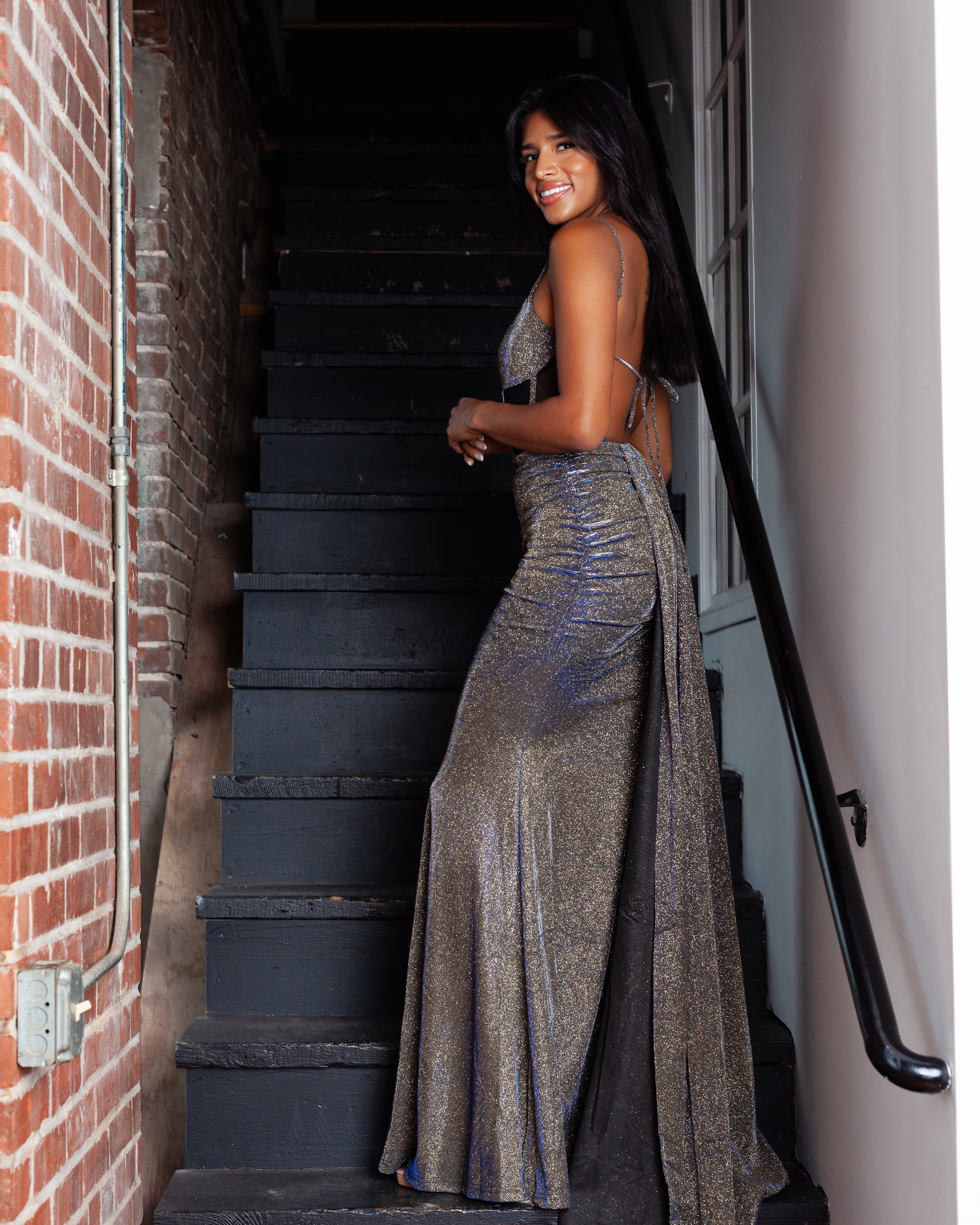 Glitter Tie Back Spaghetti Strap Maxi Dress + Thigh Slit