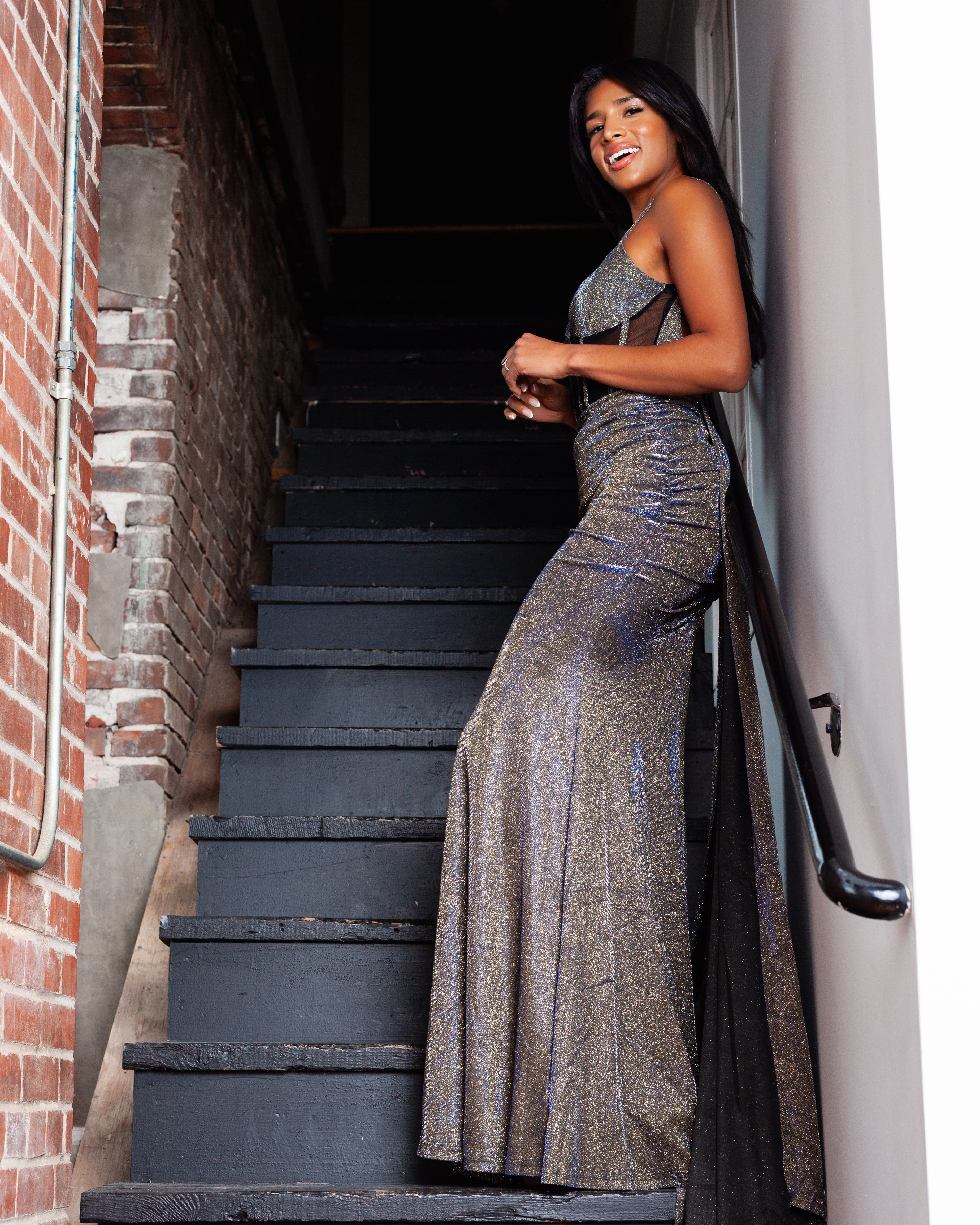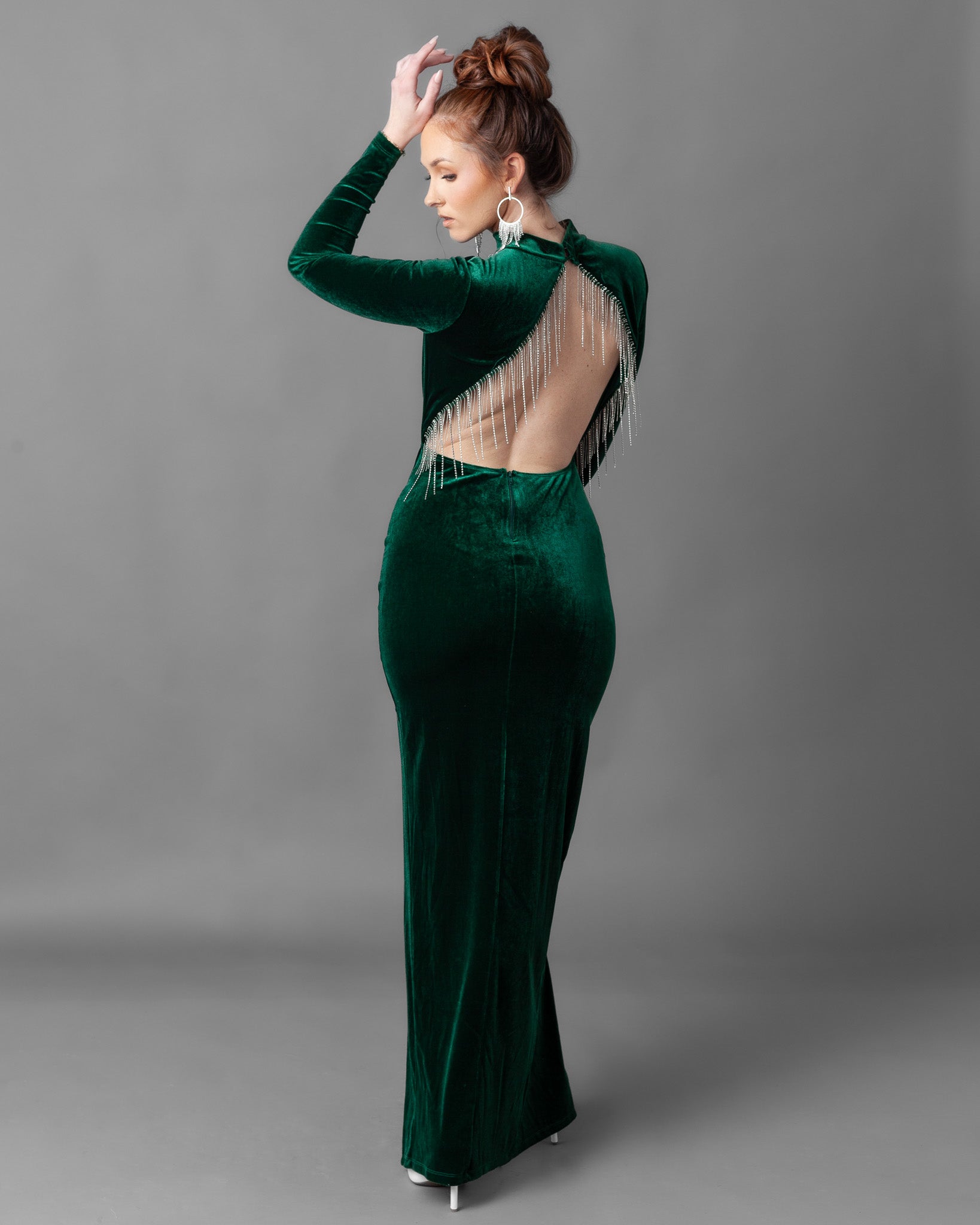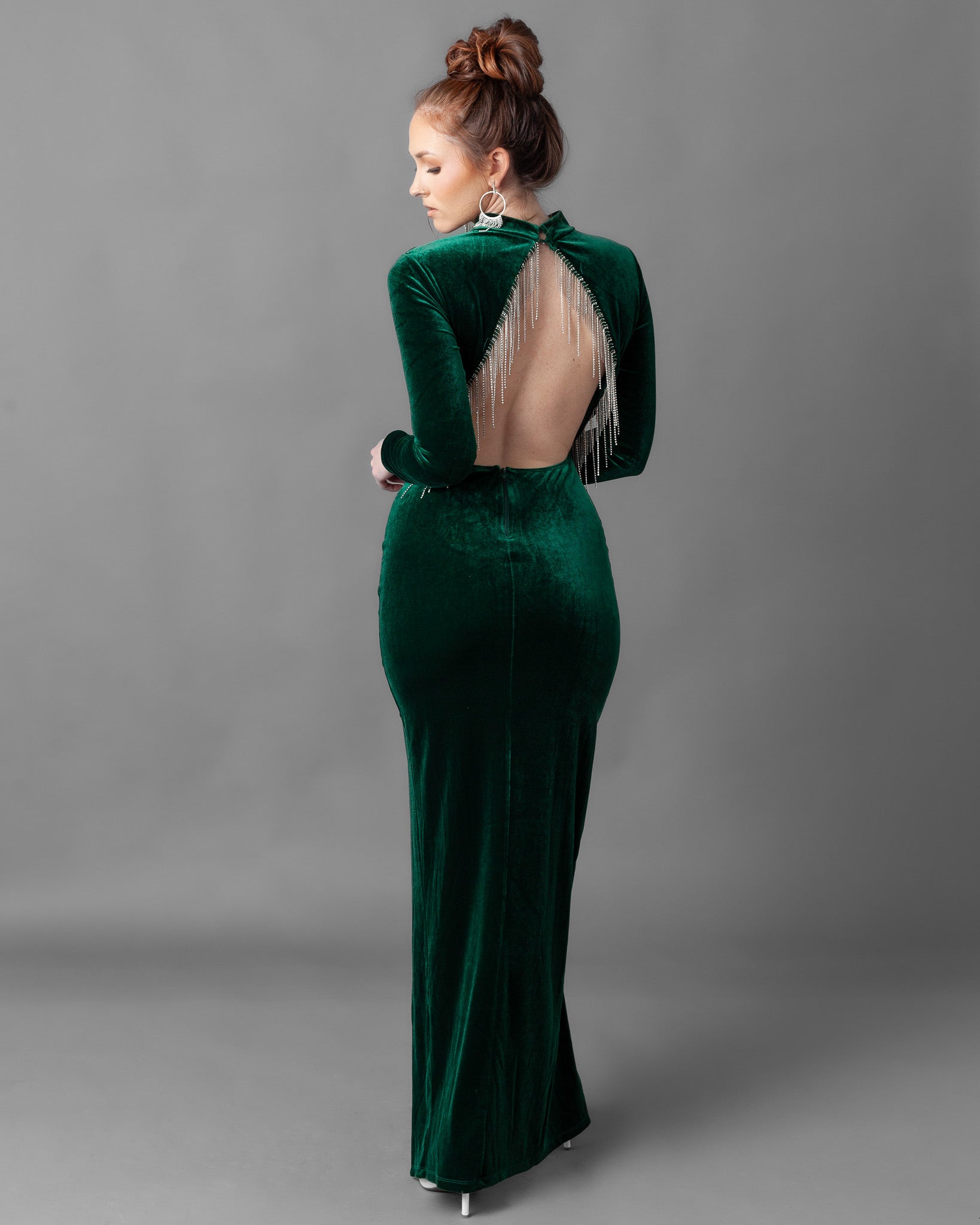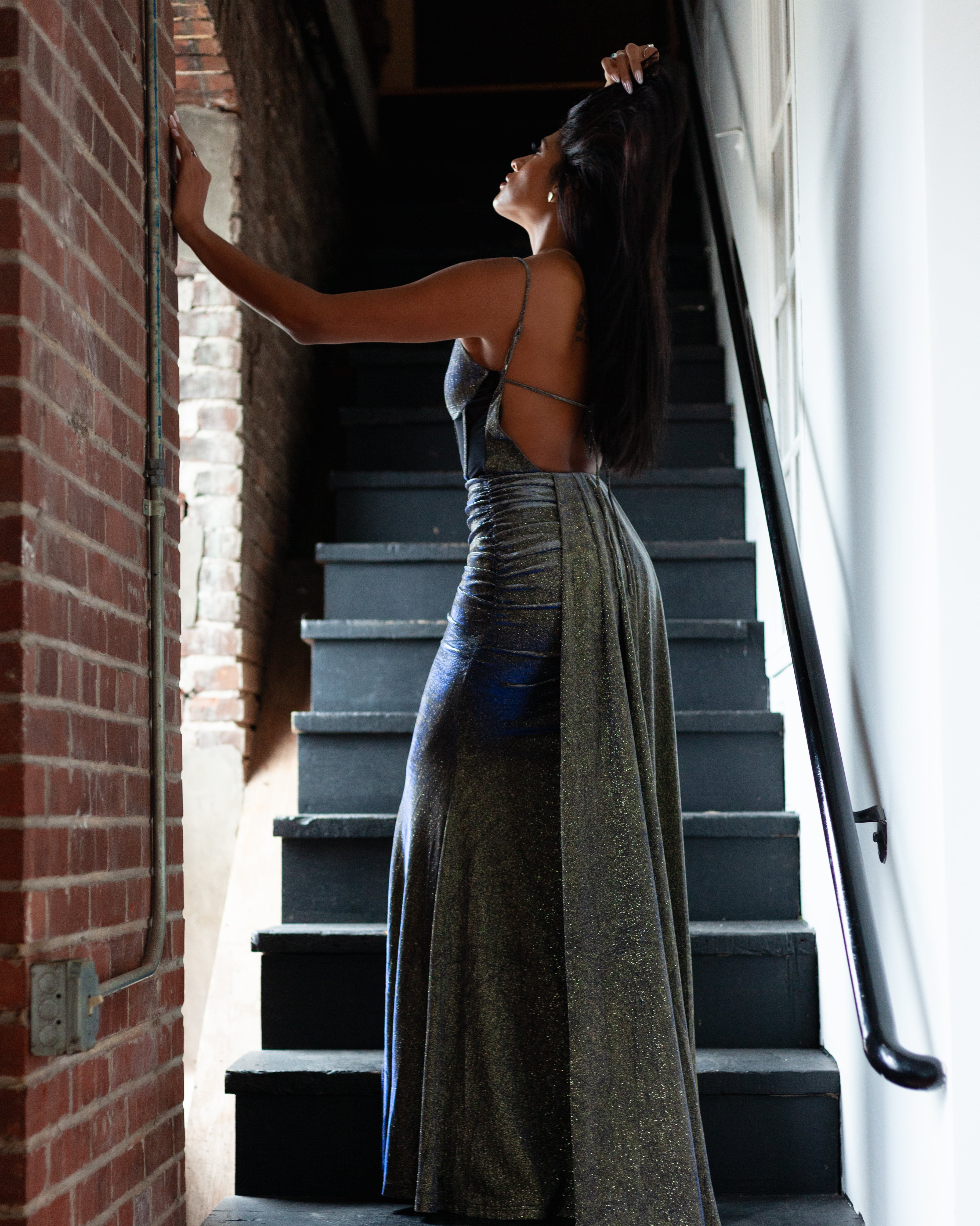 Glitter Tie Back Spaghetti Strap Maxi Dress + Thigh Slit