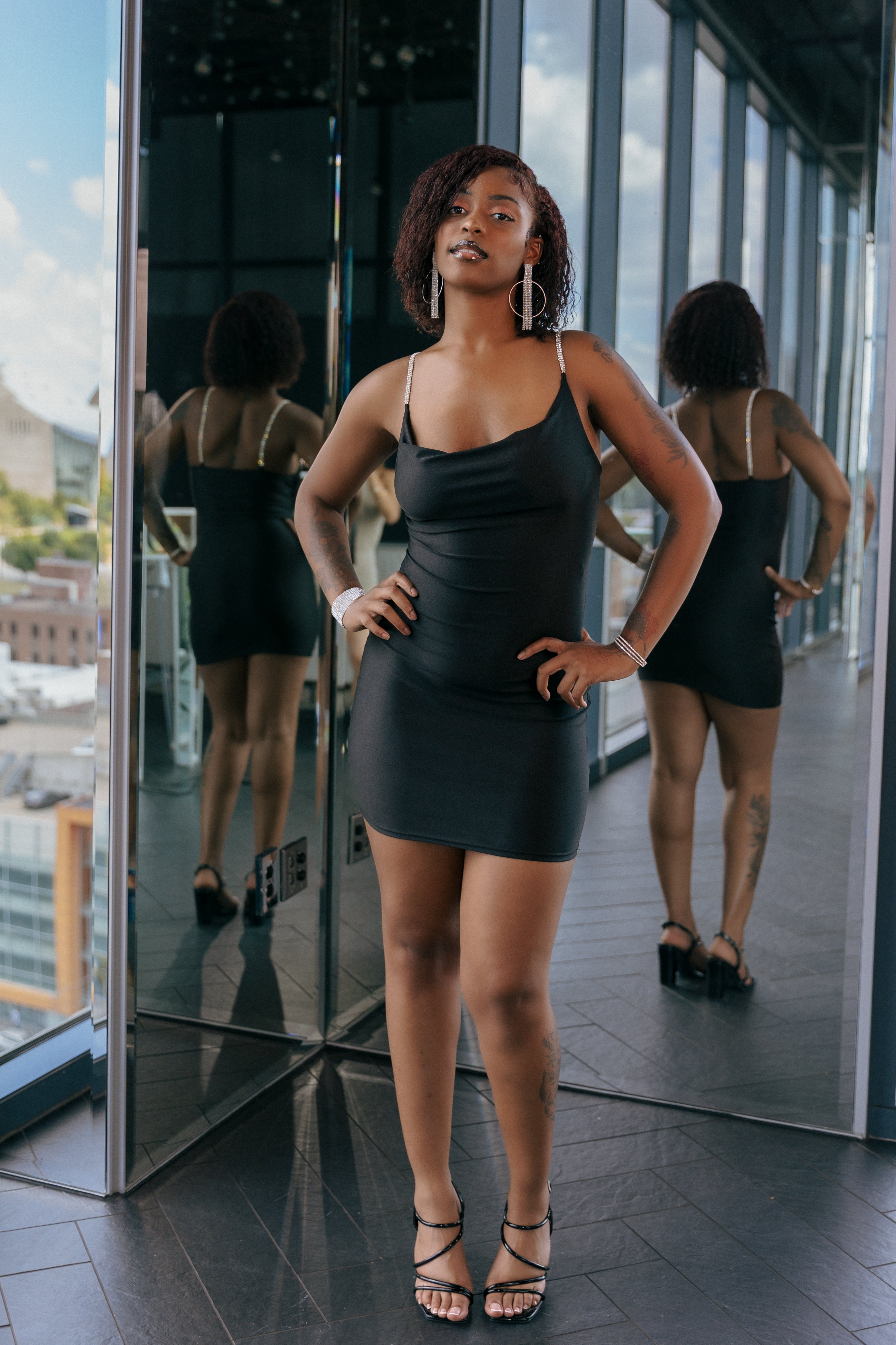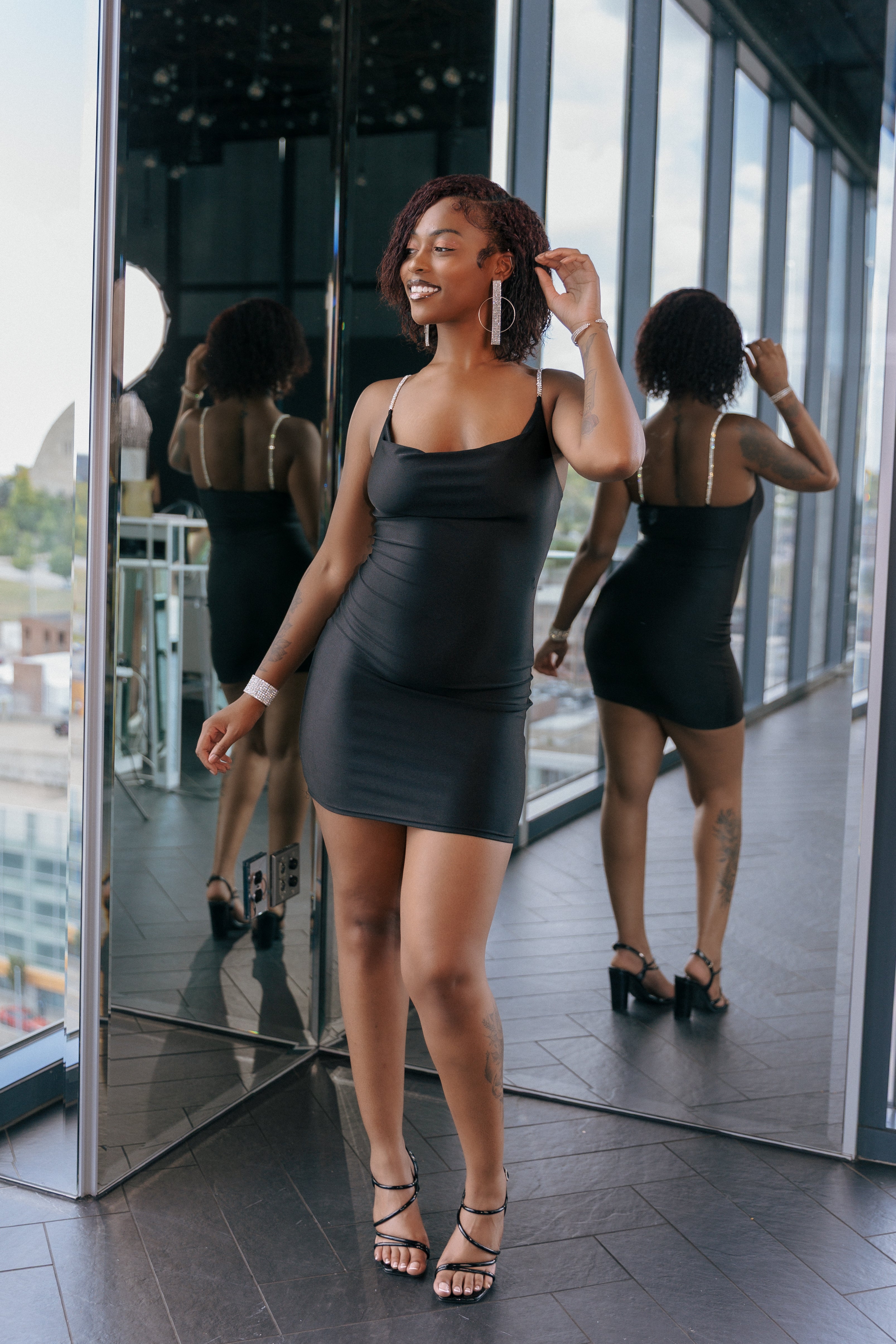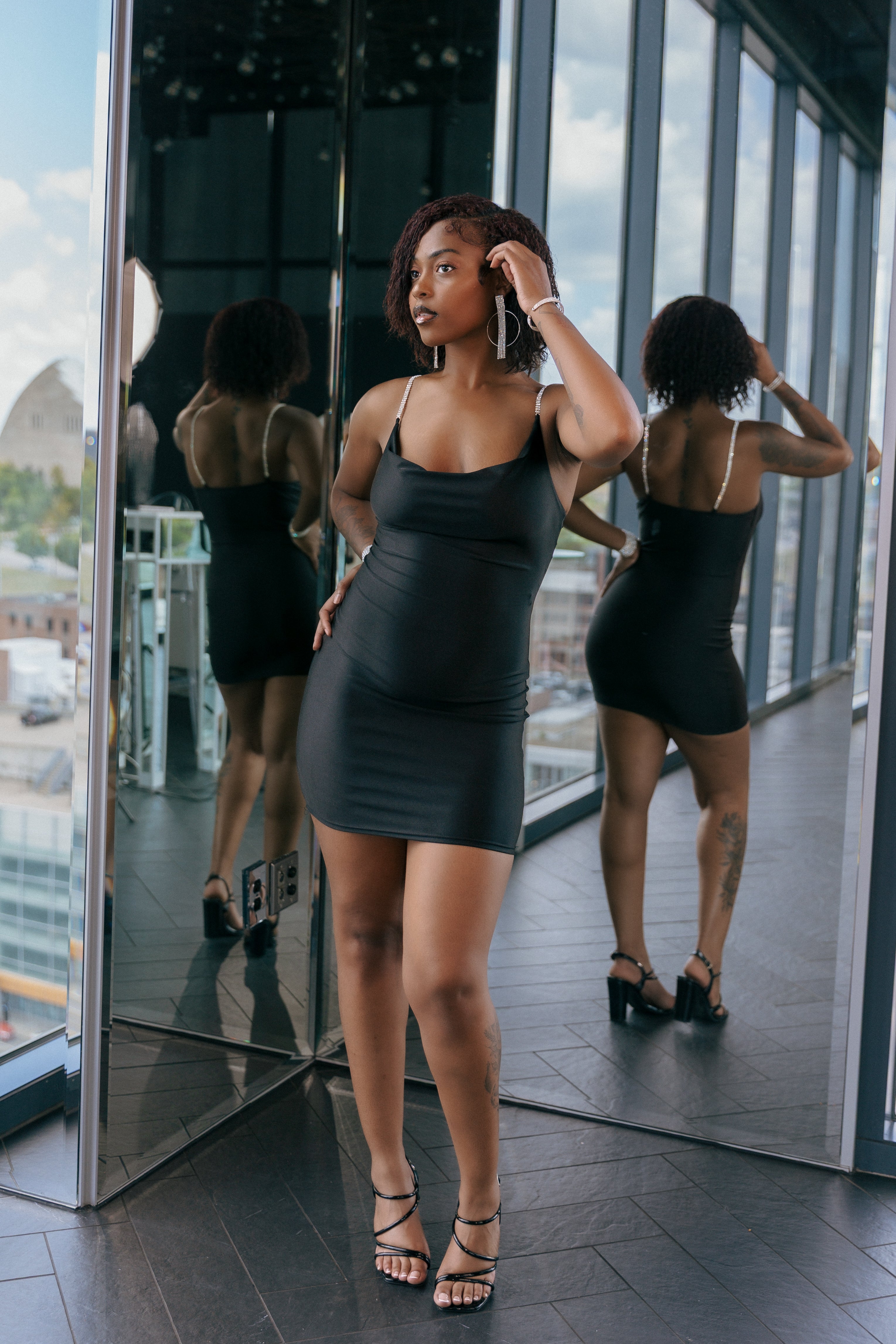 Cairo Glitter Spaghetti Strap Mini Dress + Thigh Slit