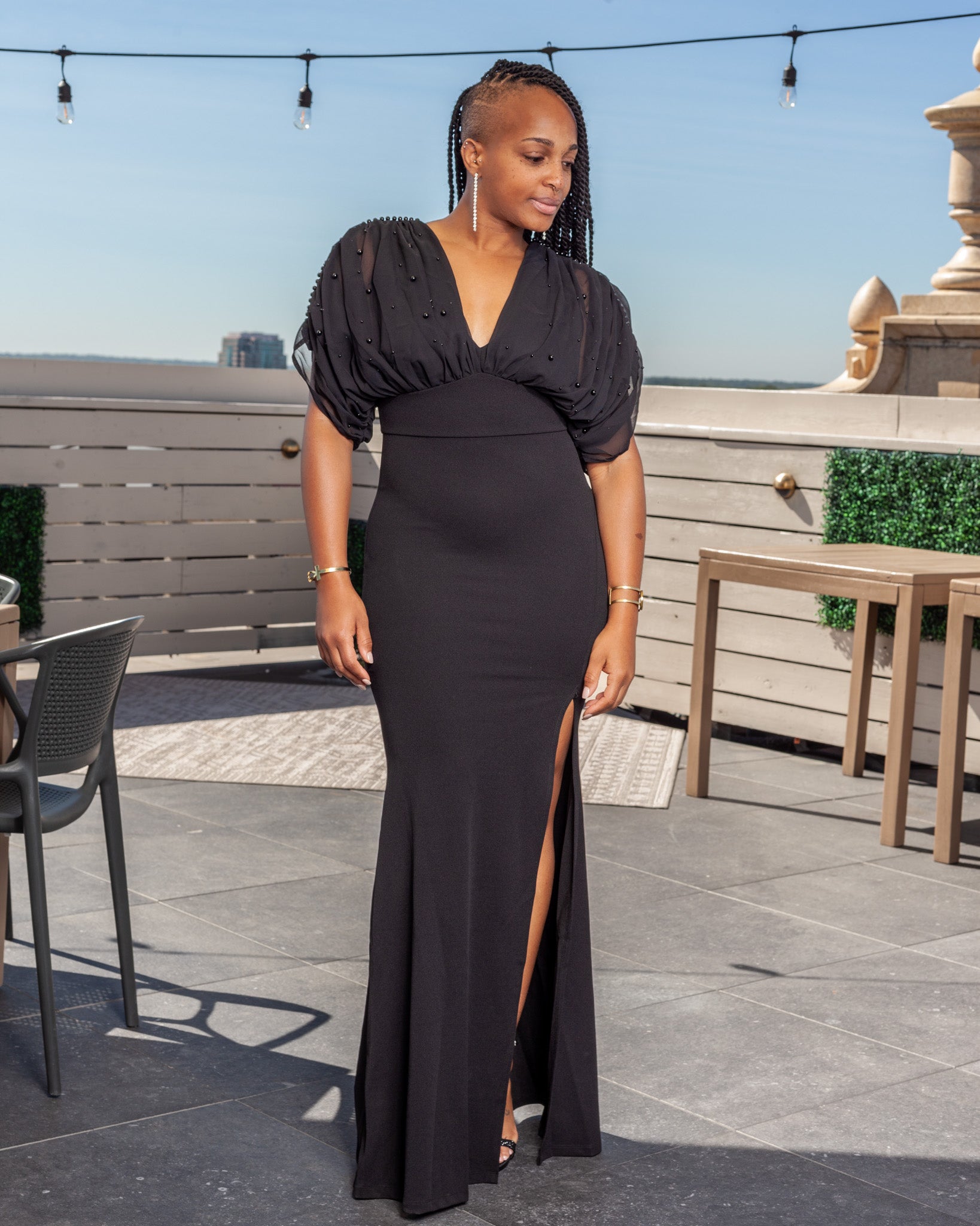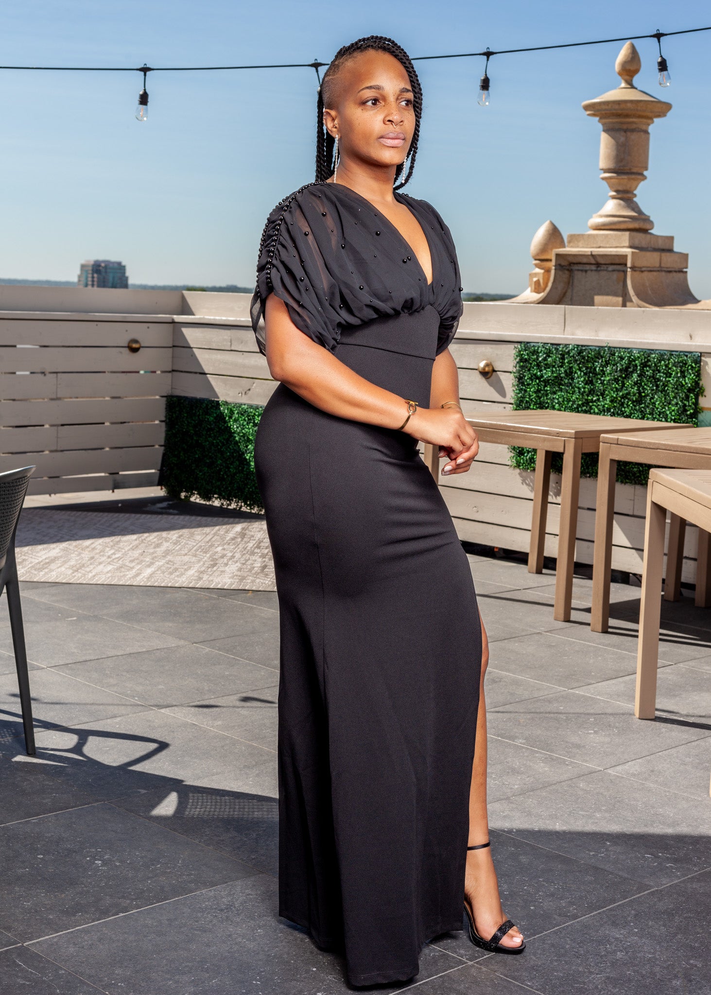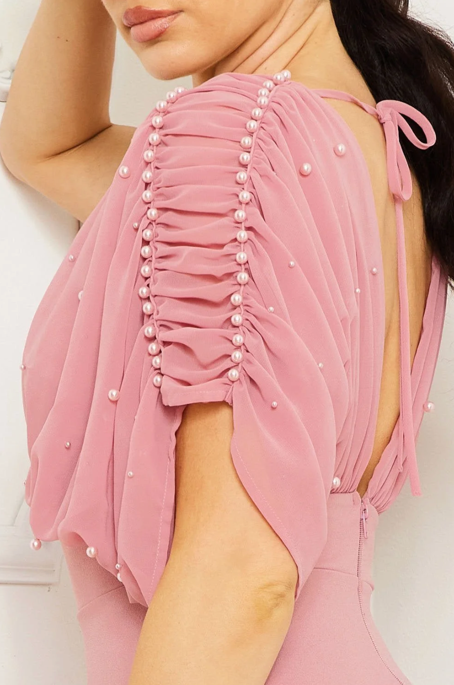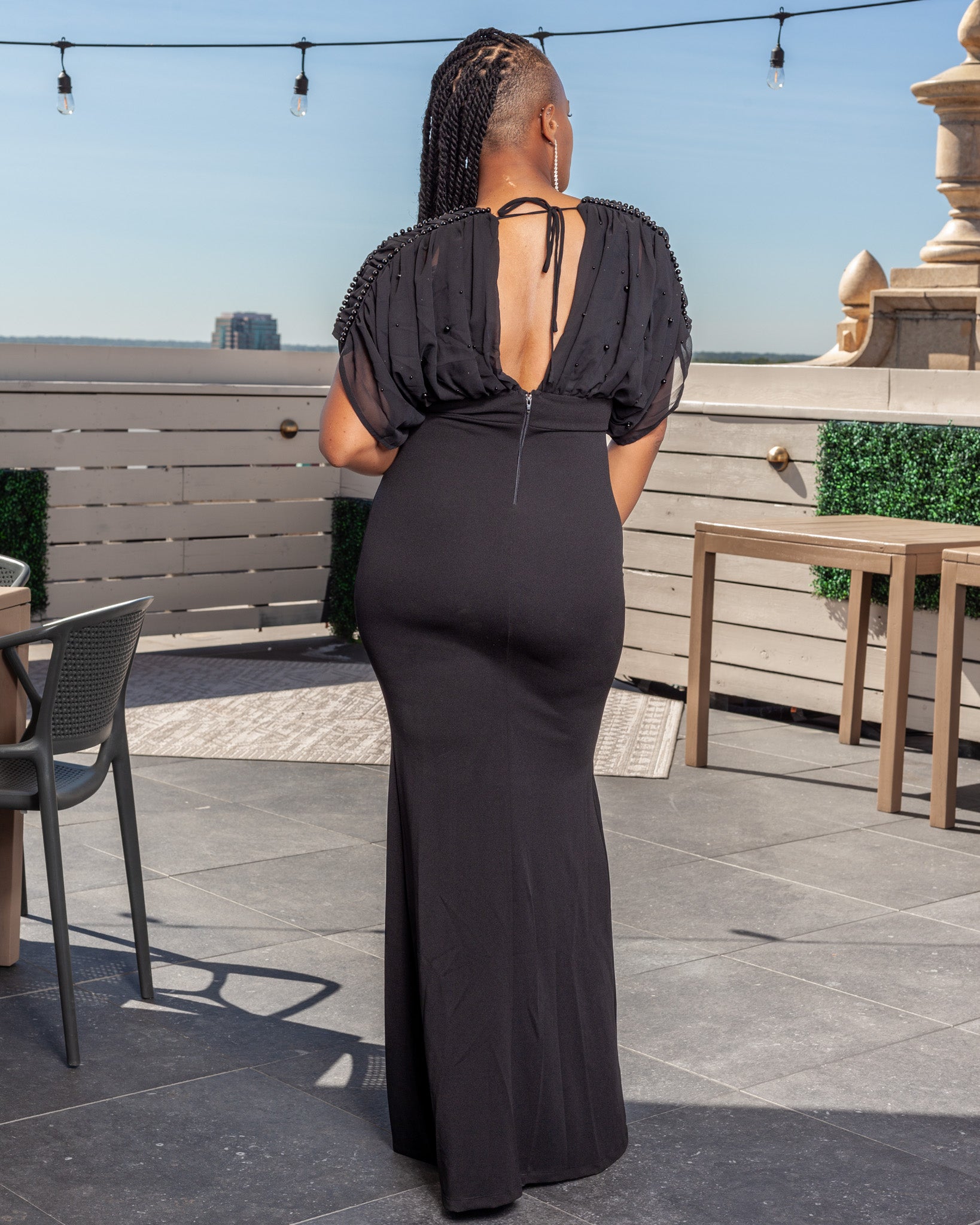 Pearl Draped Top Beaded Deep V Maxi Dress