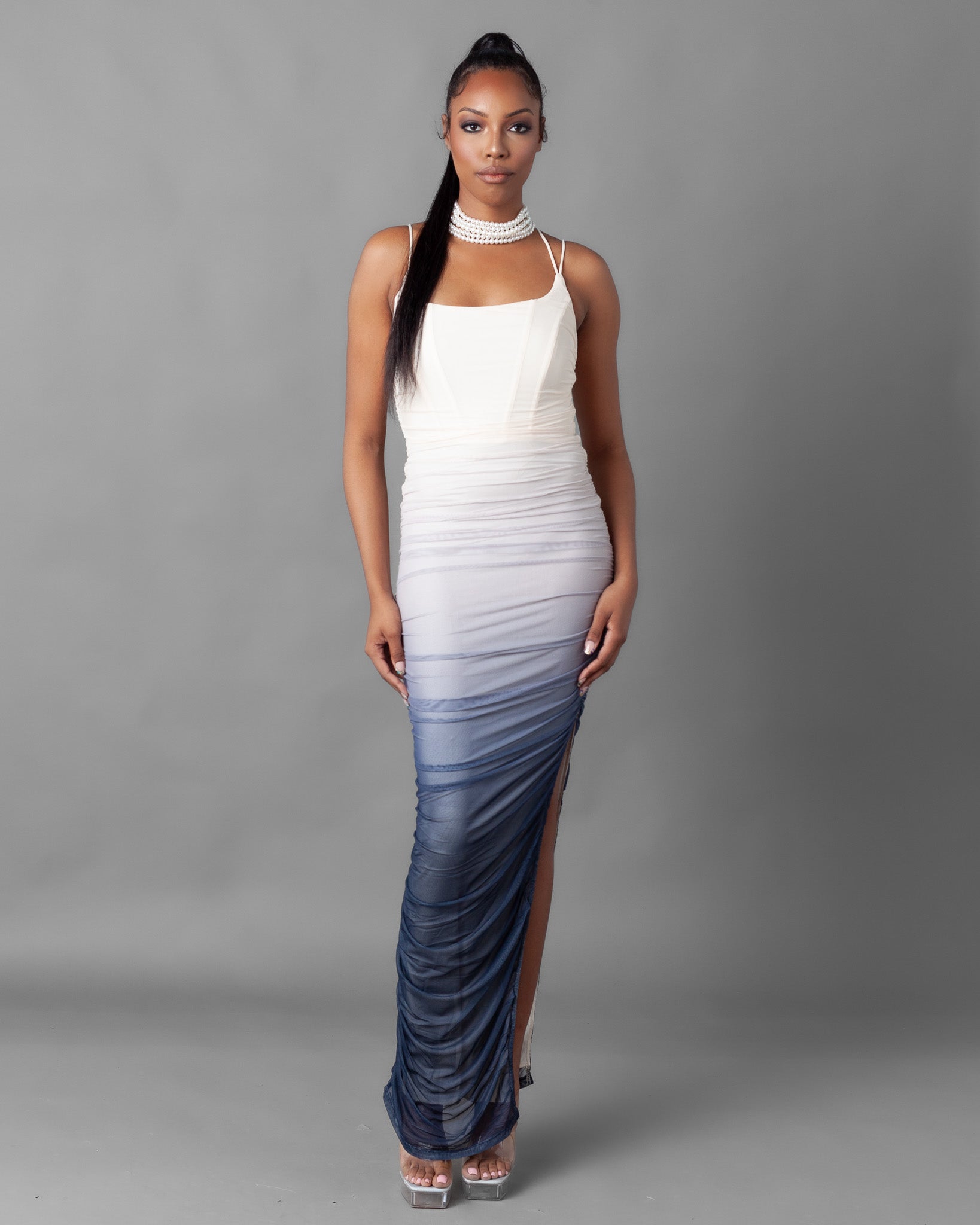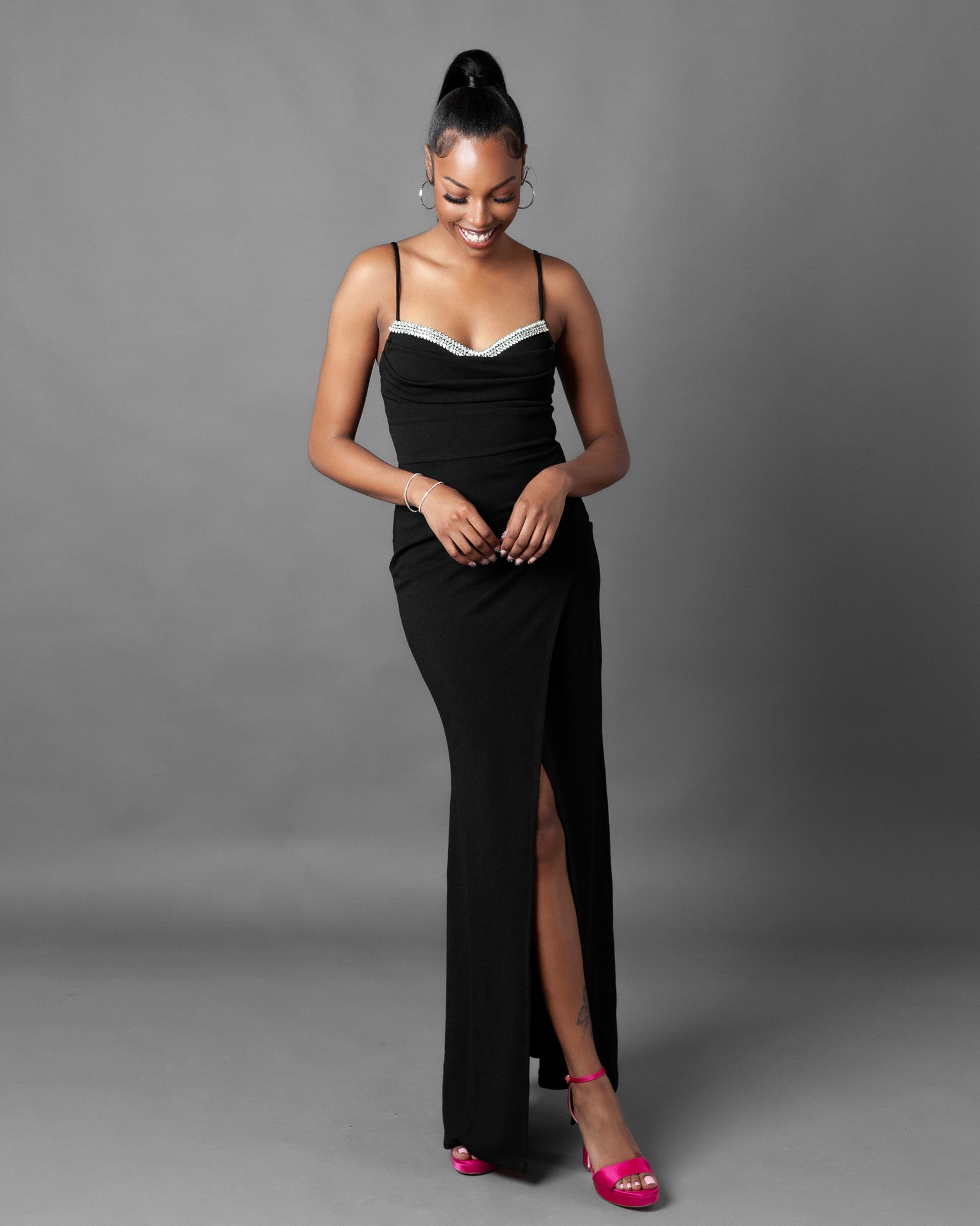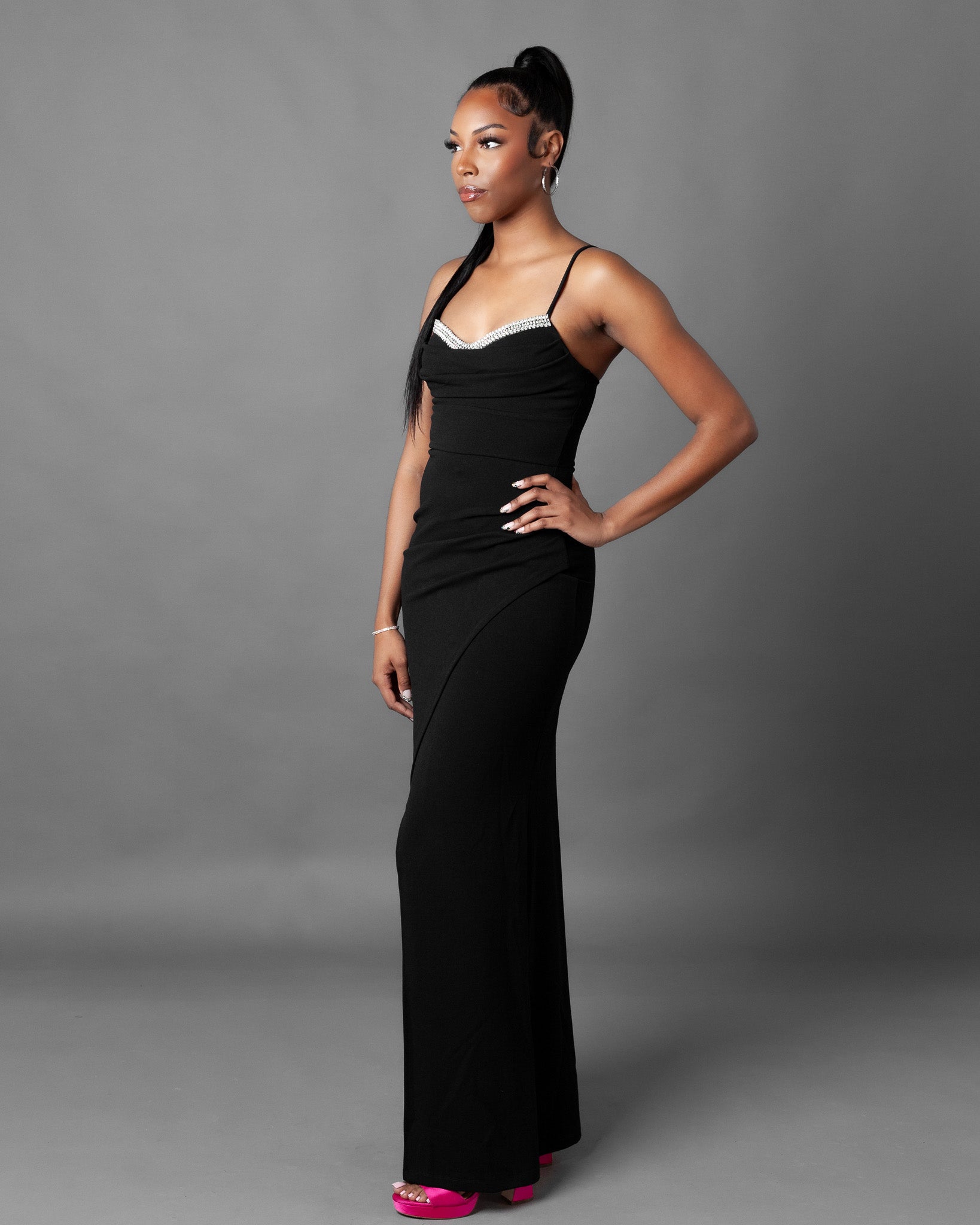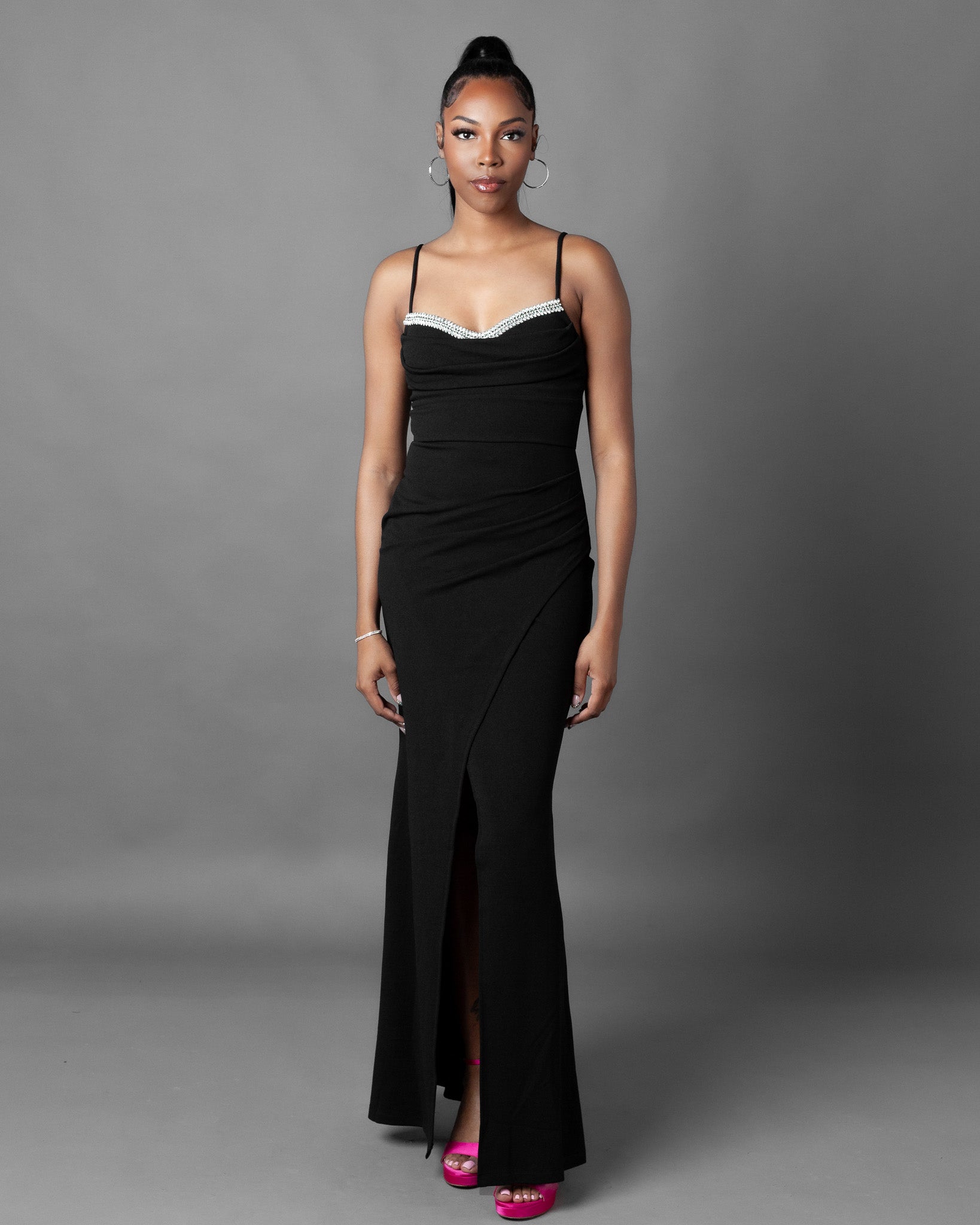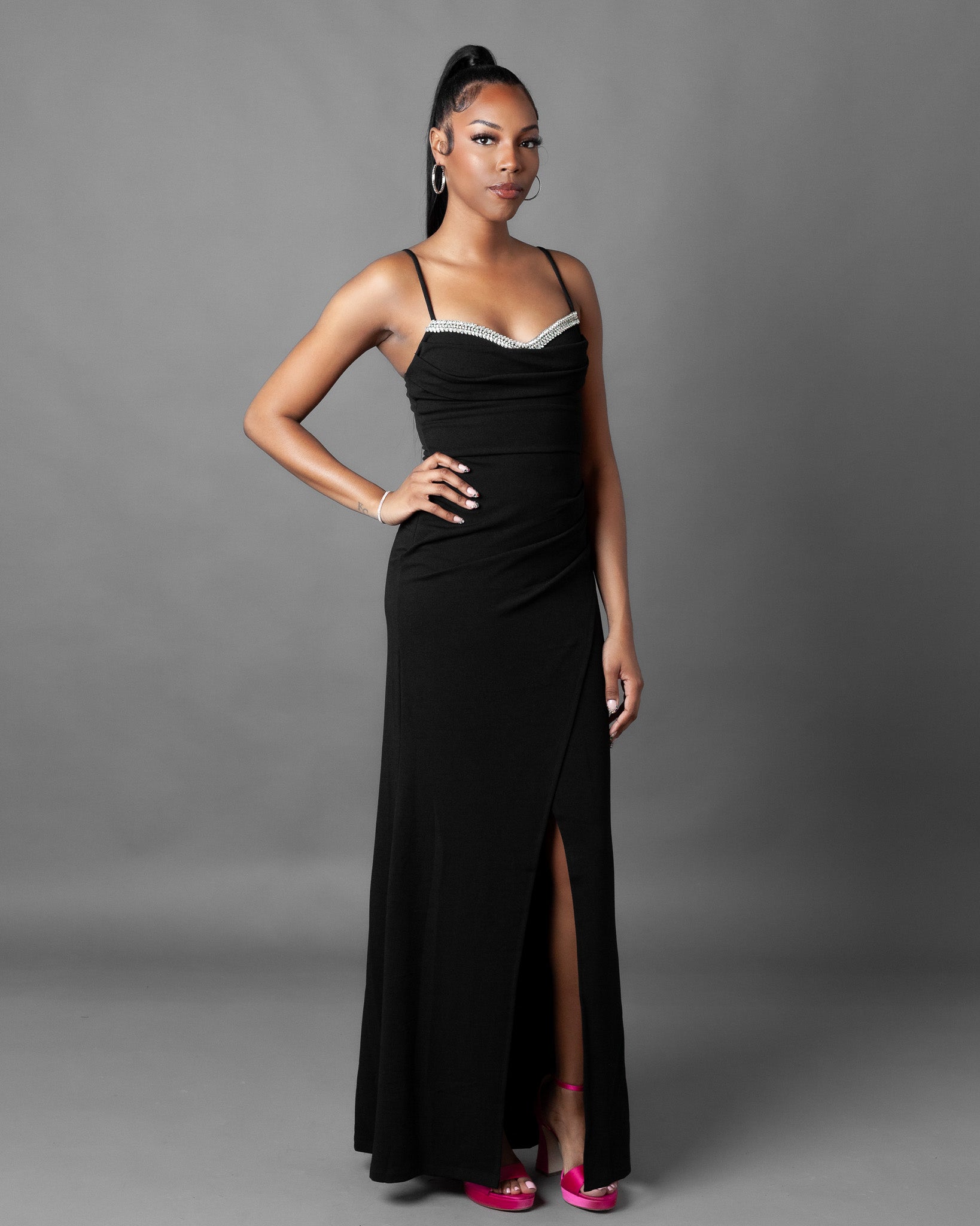 Paris Rhinestone Bust Crossover Slit Maxi Dress