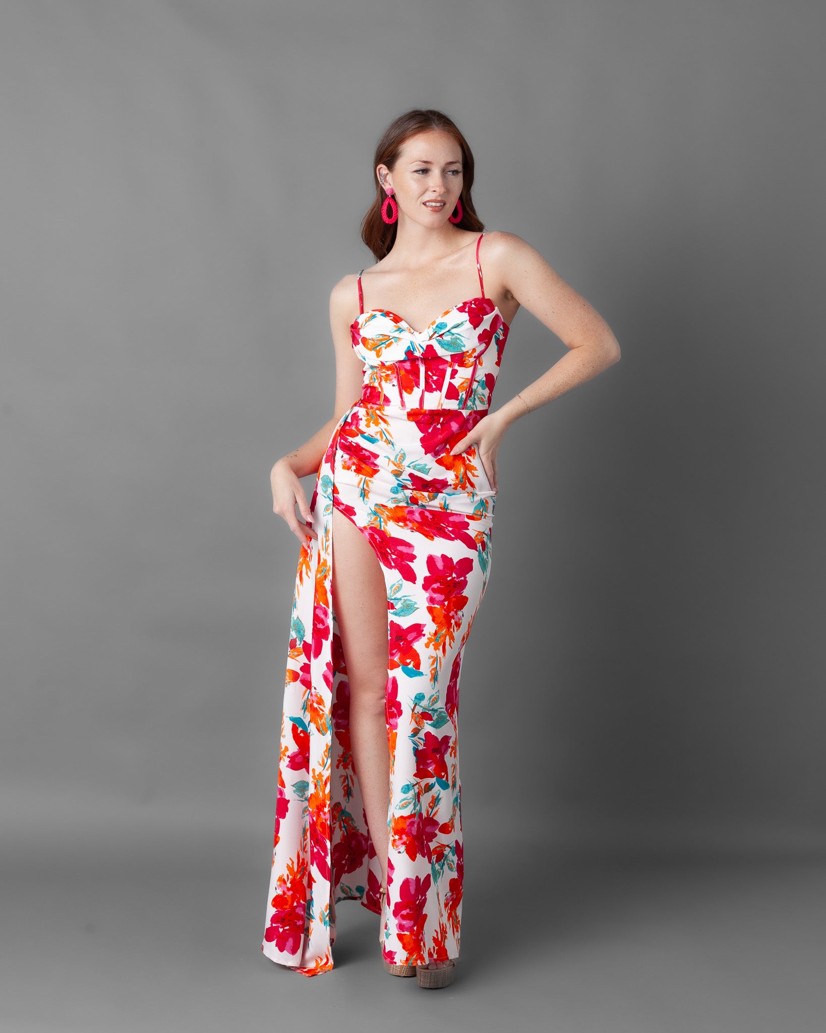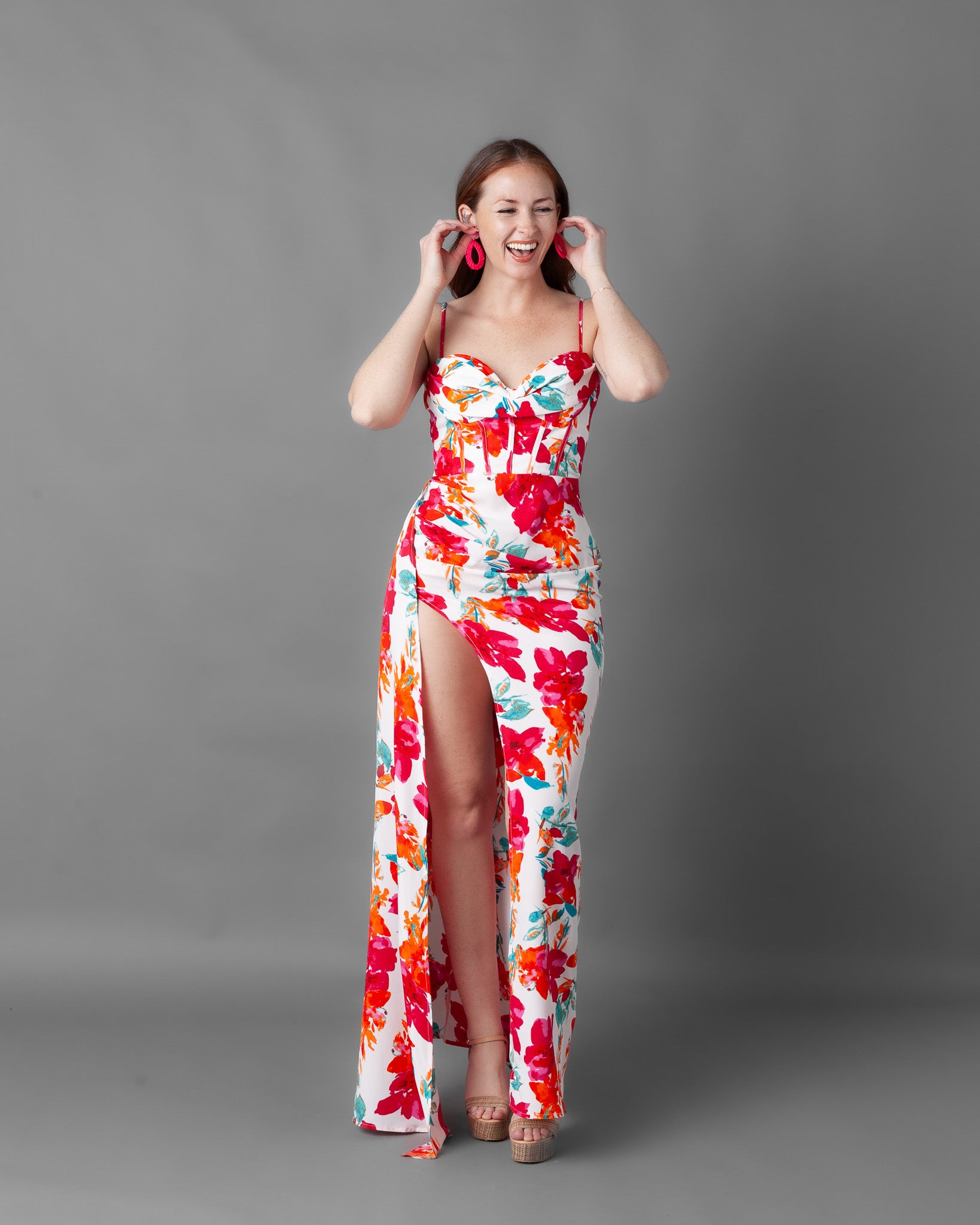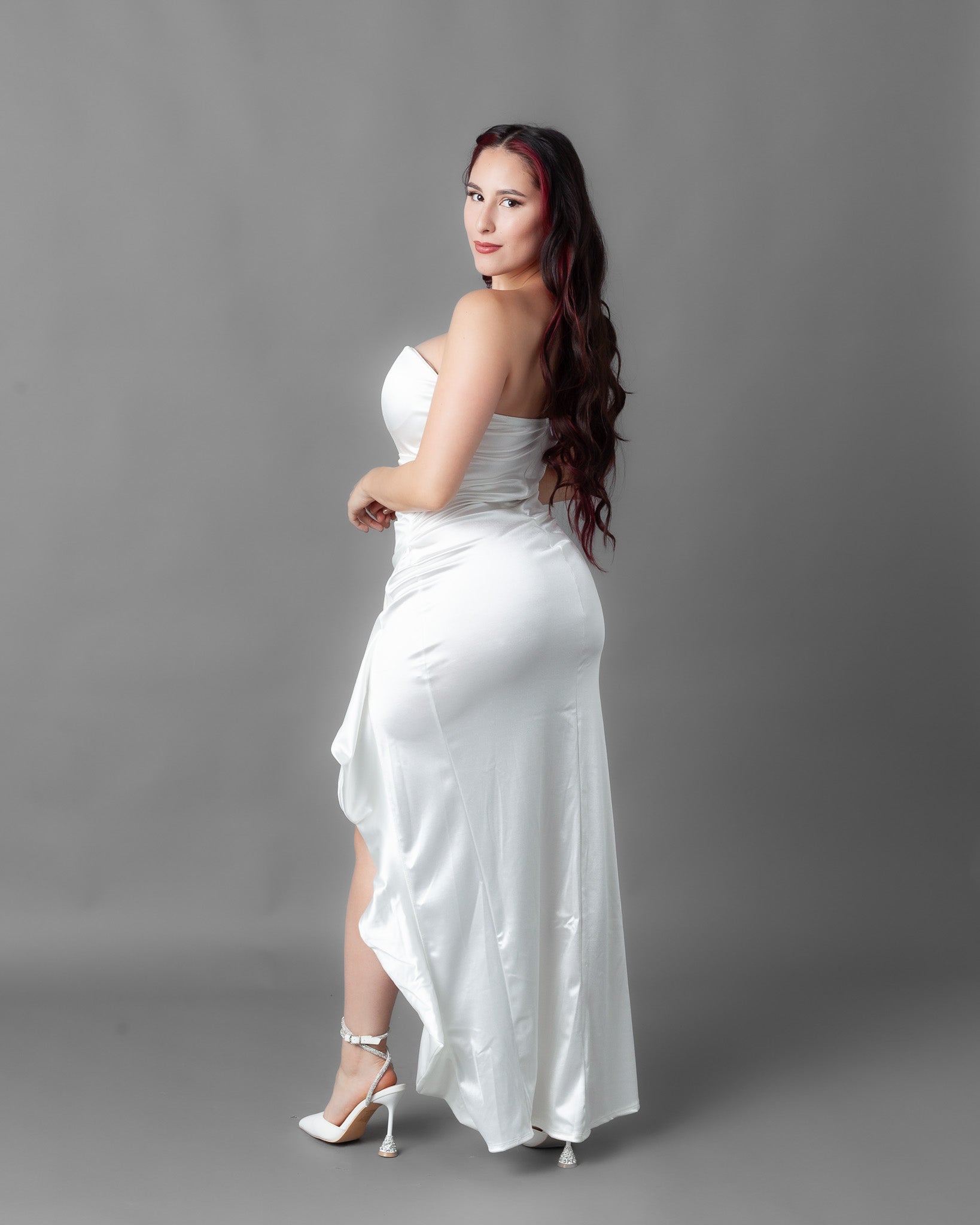 Paris Floor Sweep Spaghetti Strap Gown + Thigh