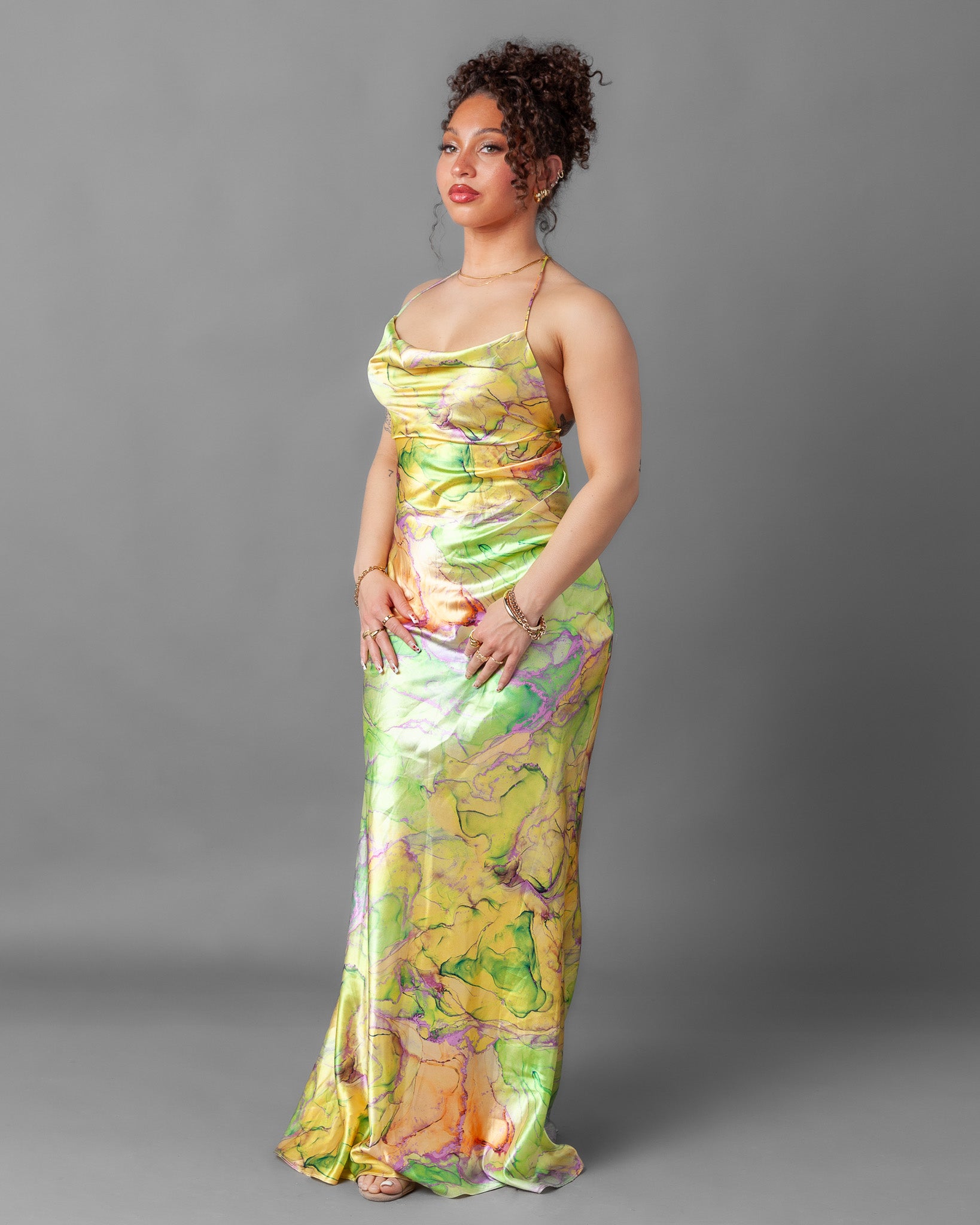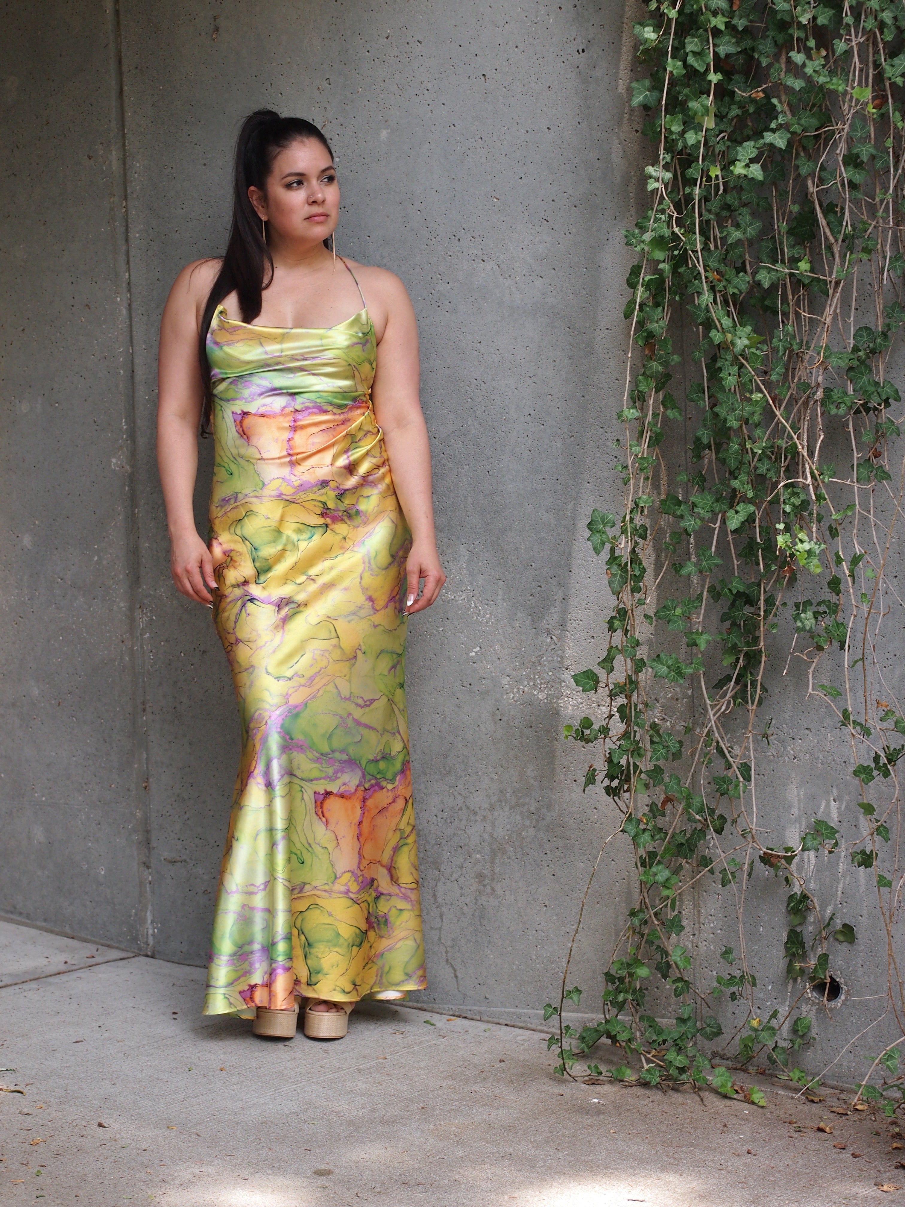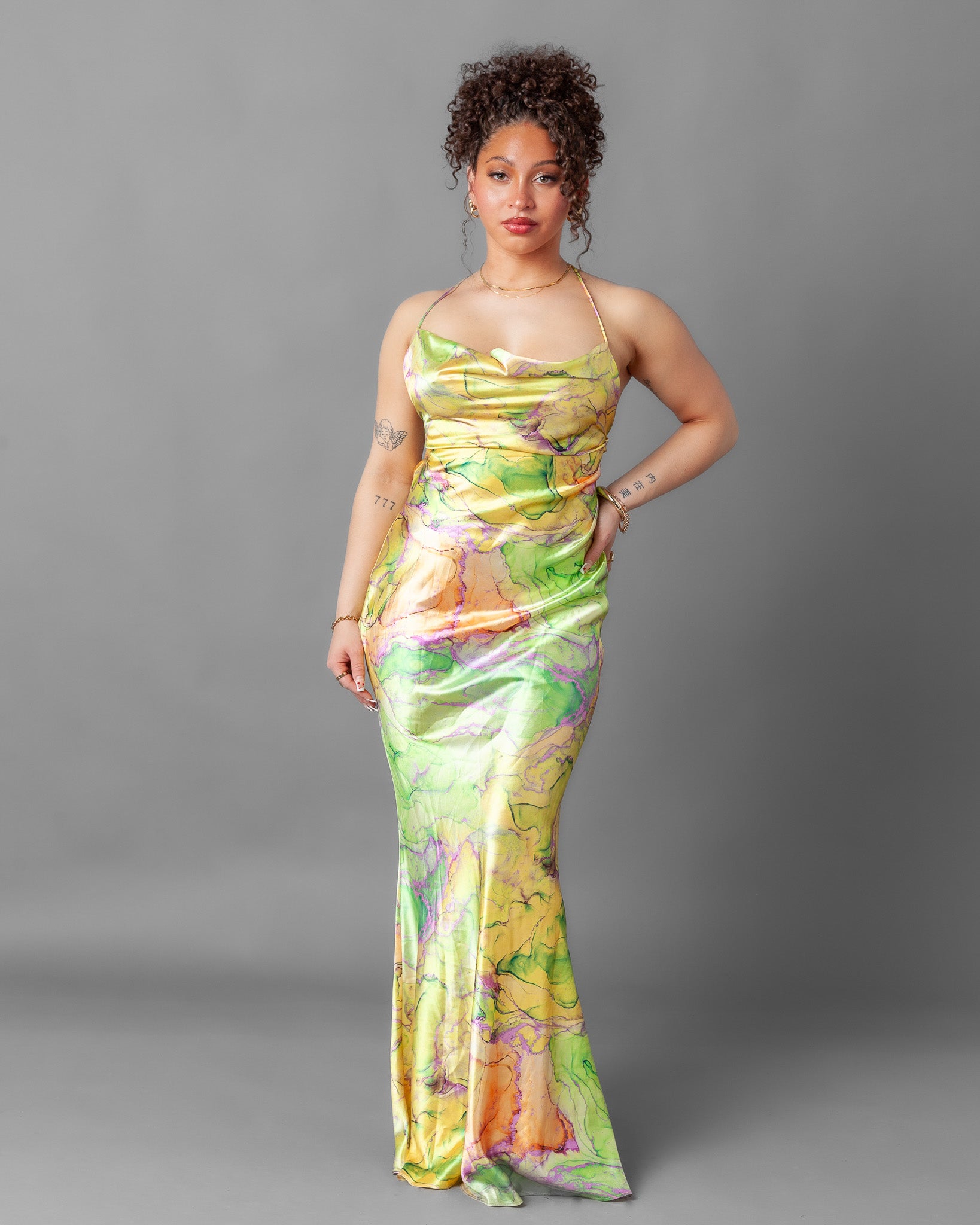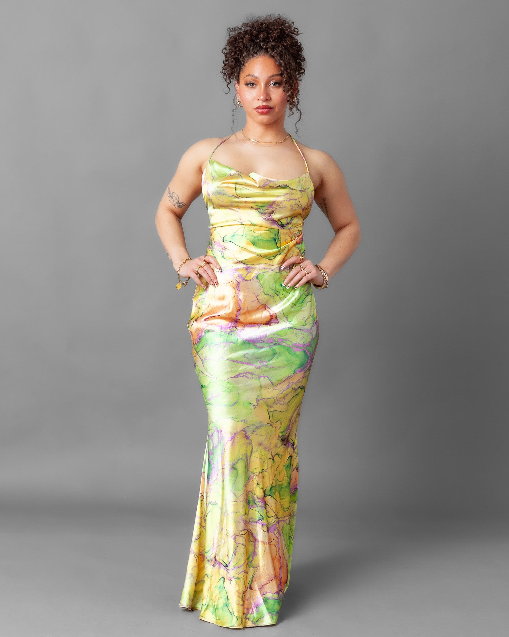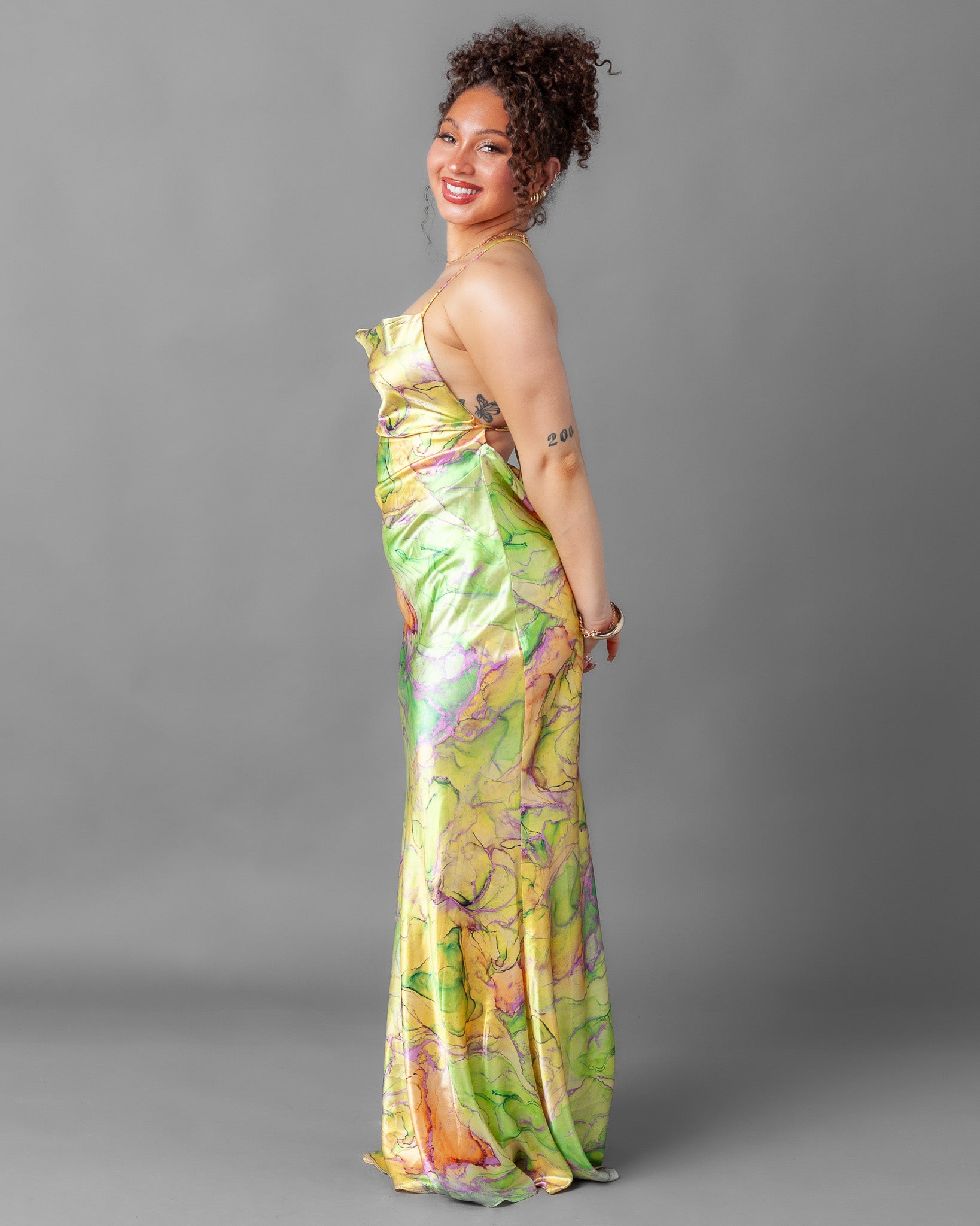 Stockholm Cowl Neck Satin Maxi Dress + Thigh Slit
