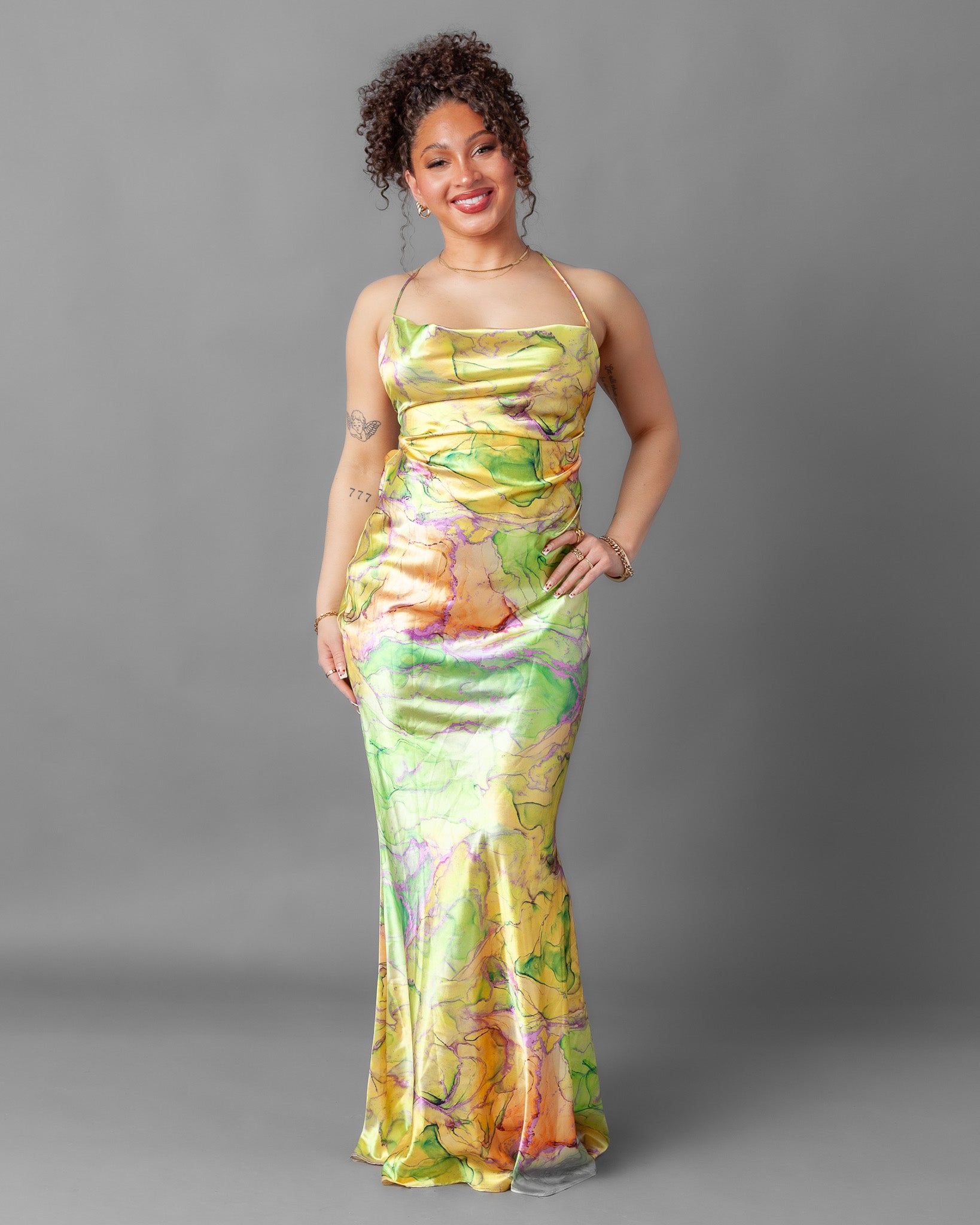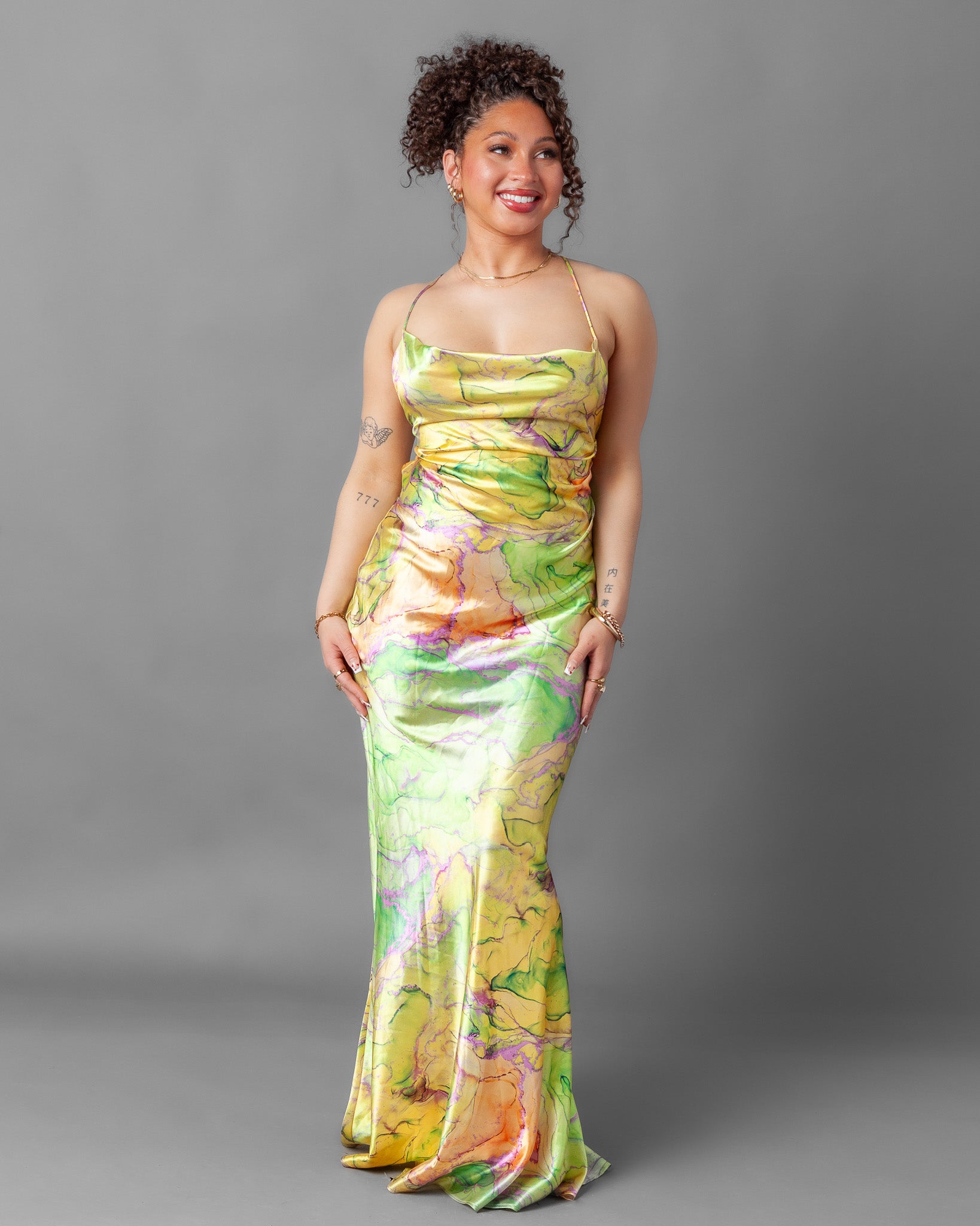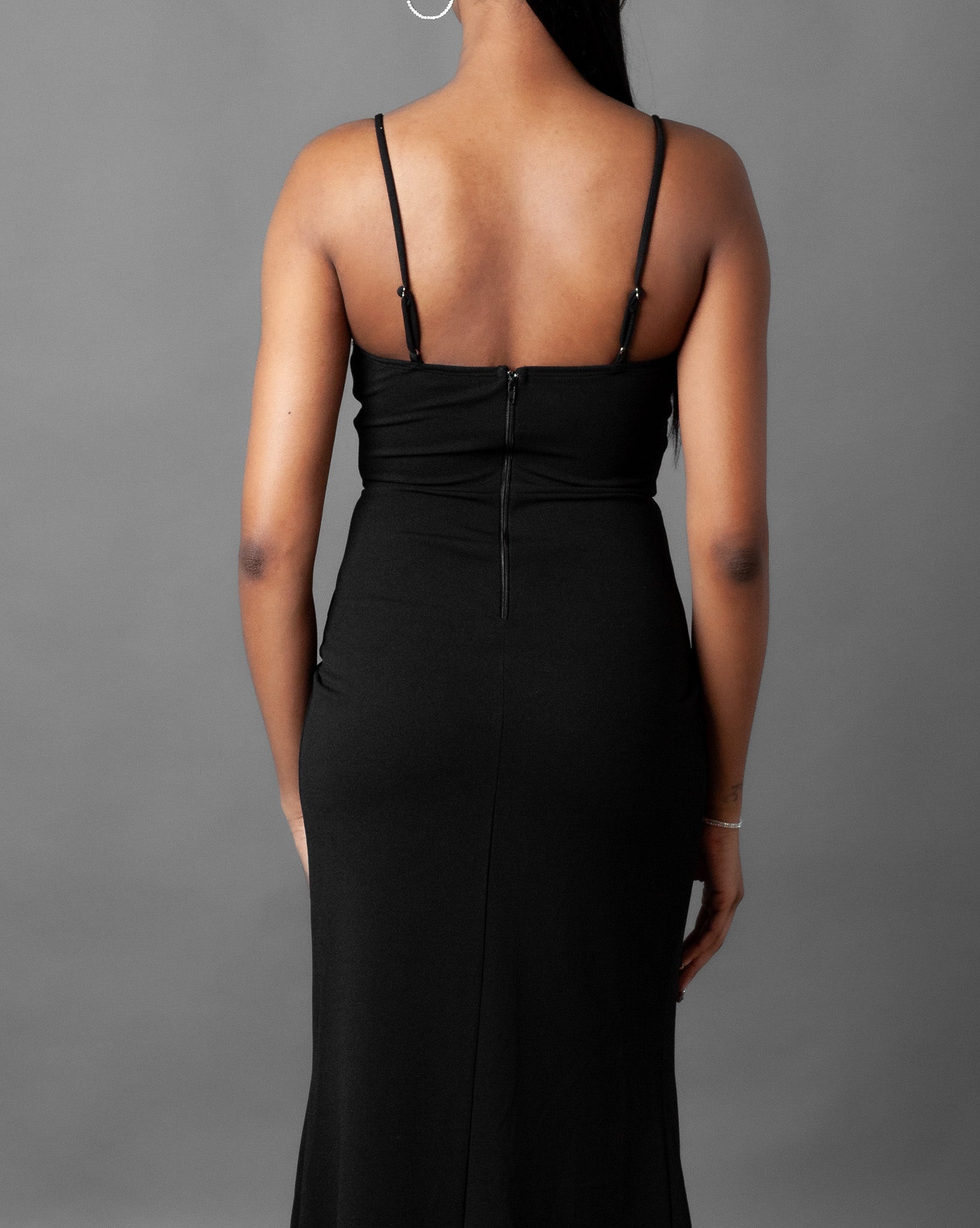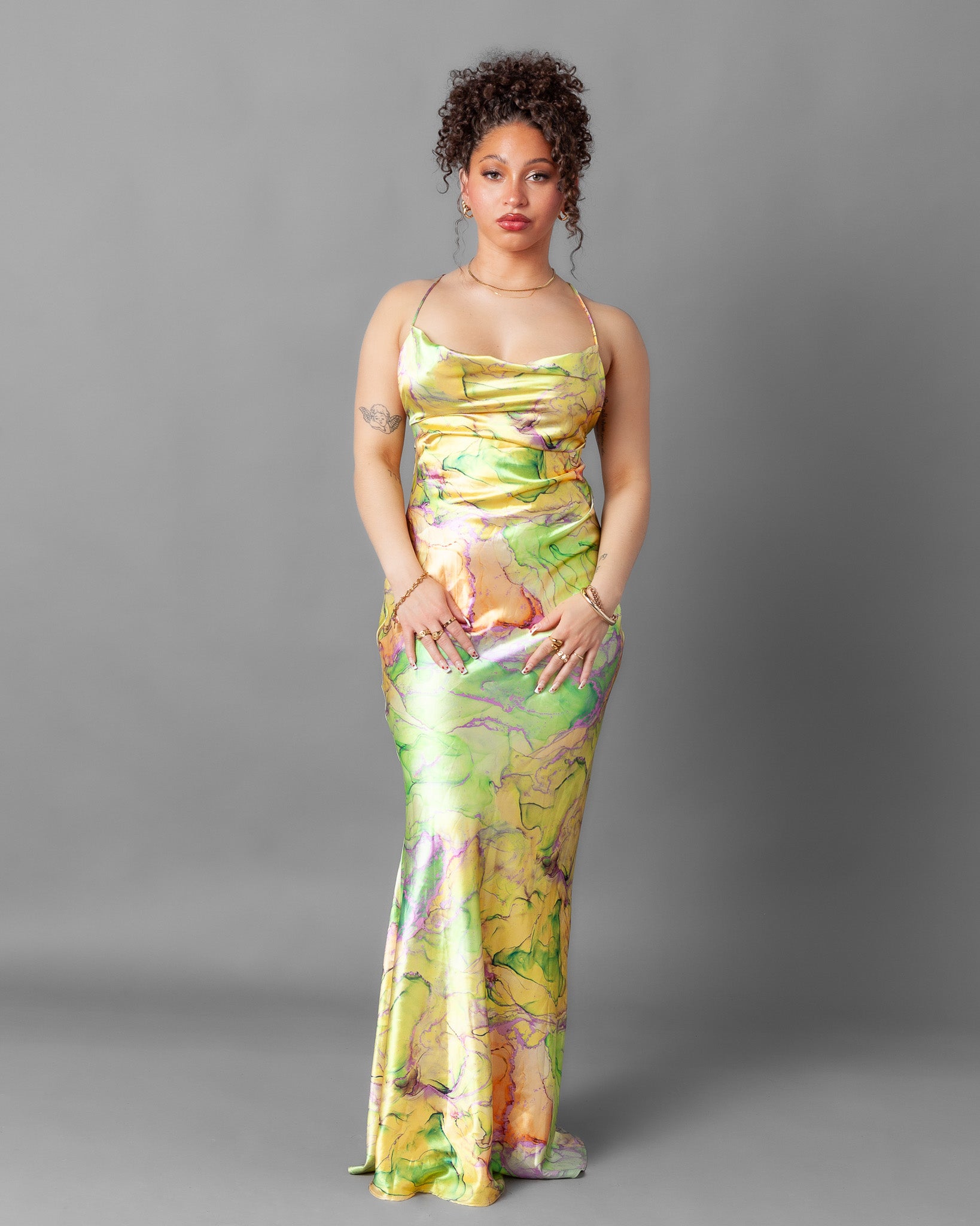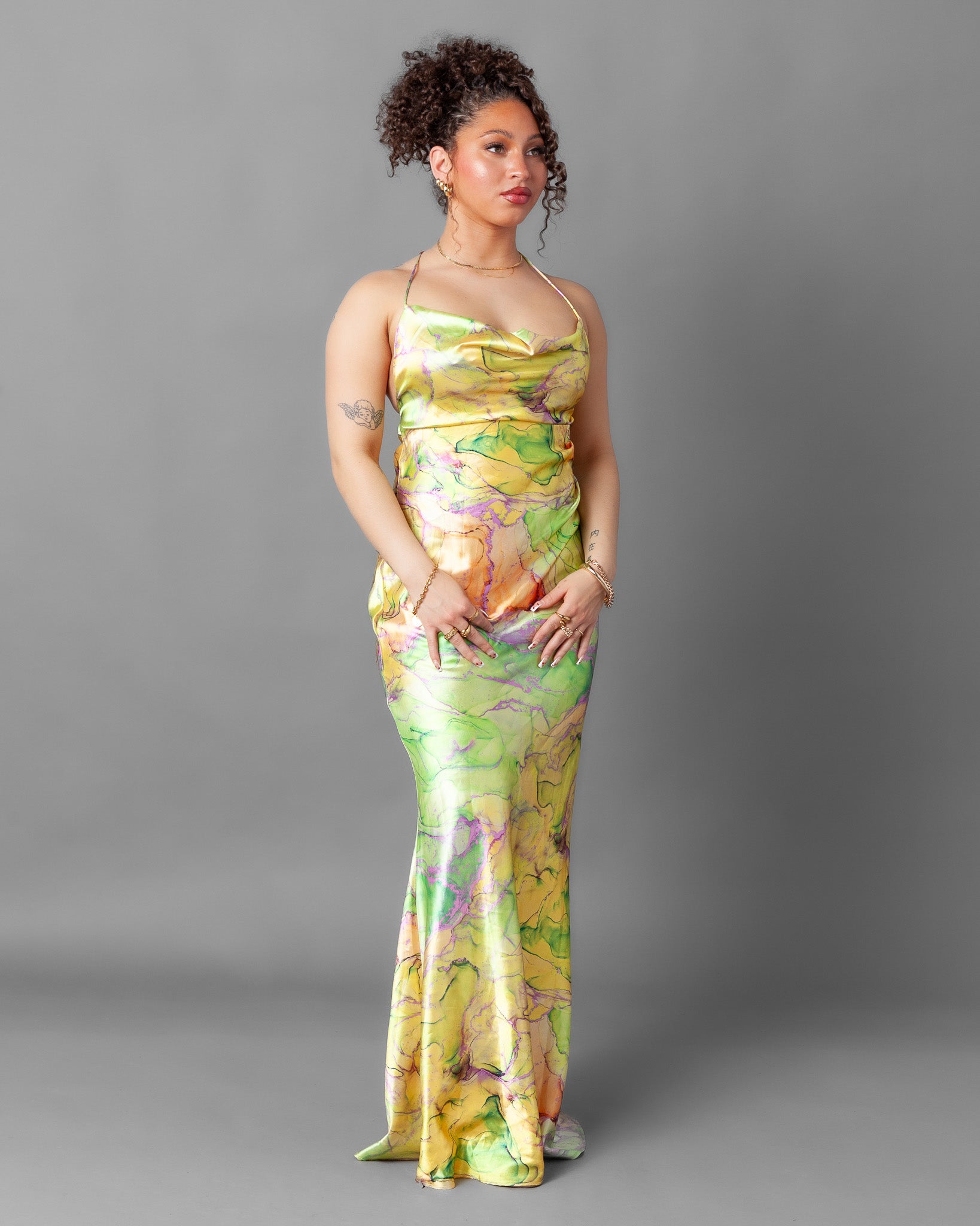 Stockholm Cowl Neck Satin Maxi Dress + Thigh Slit