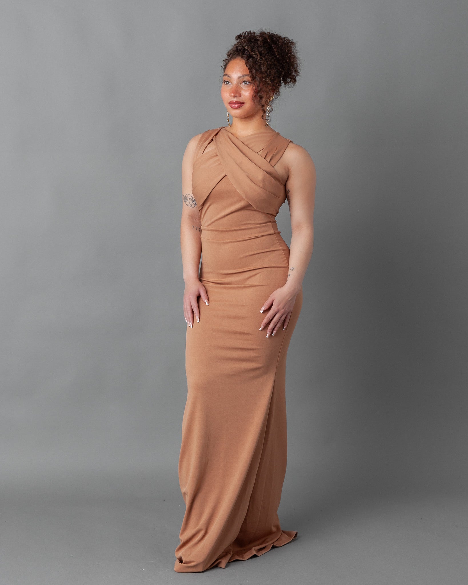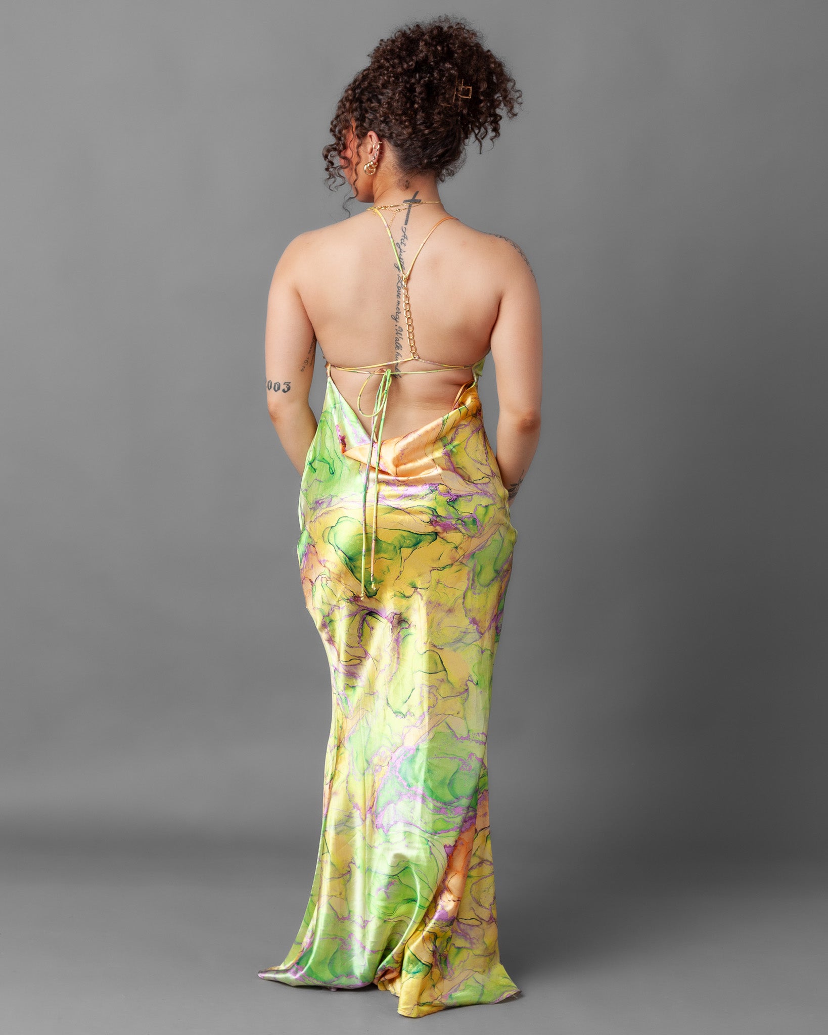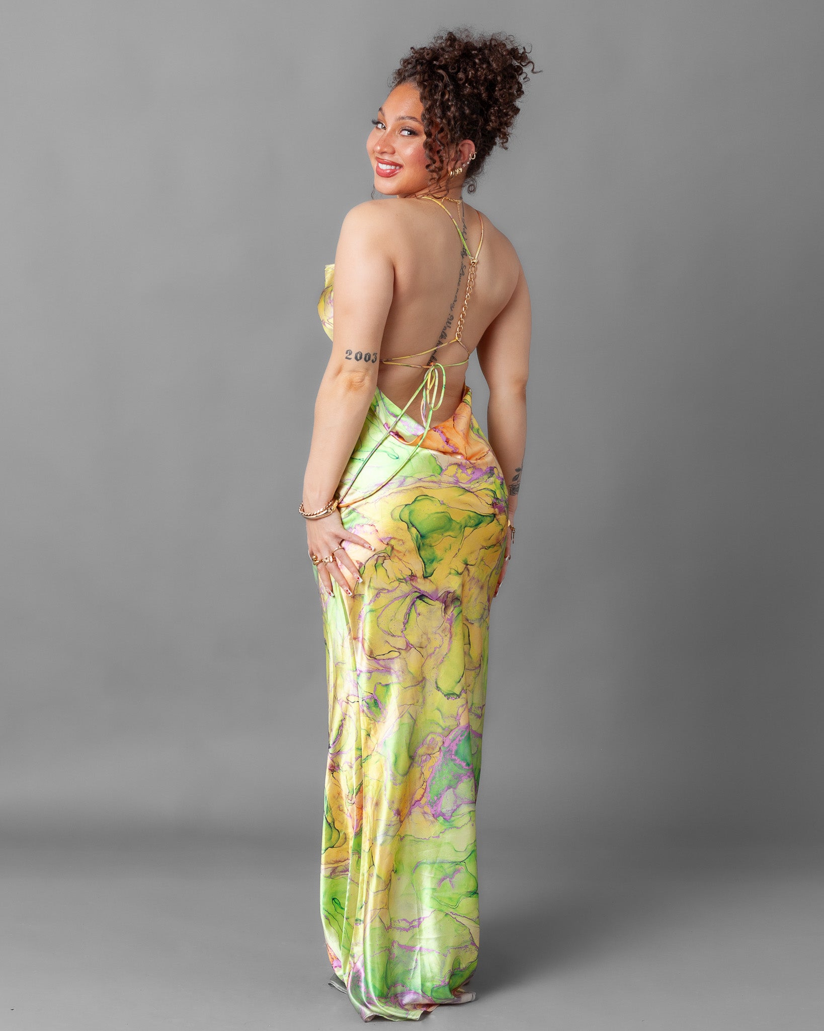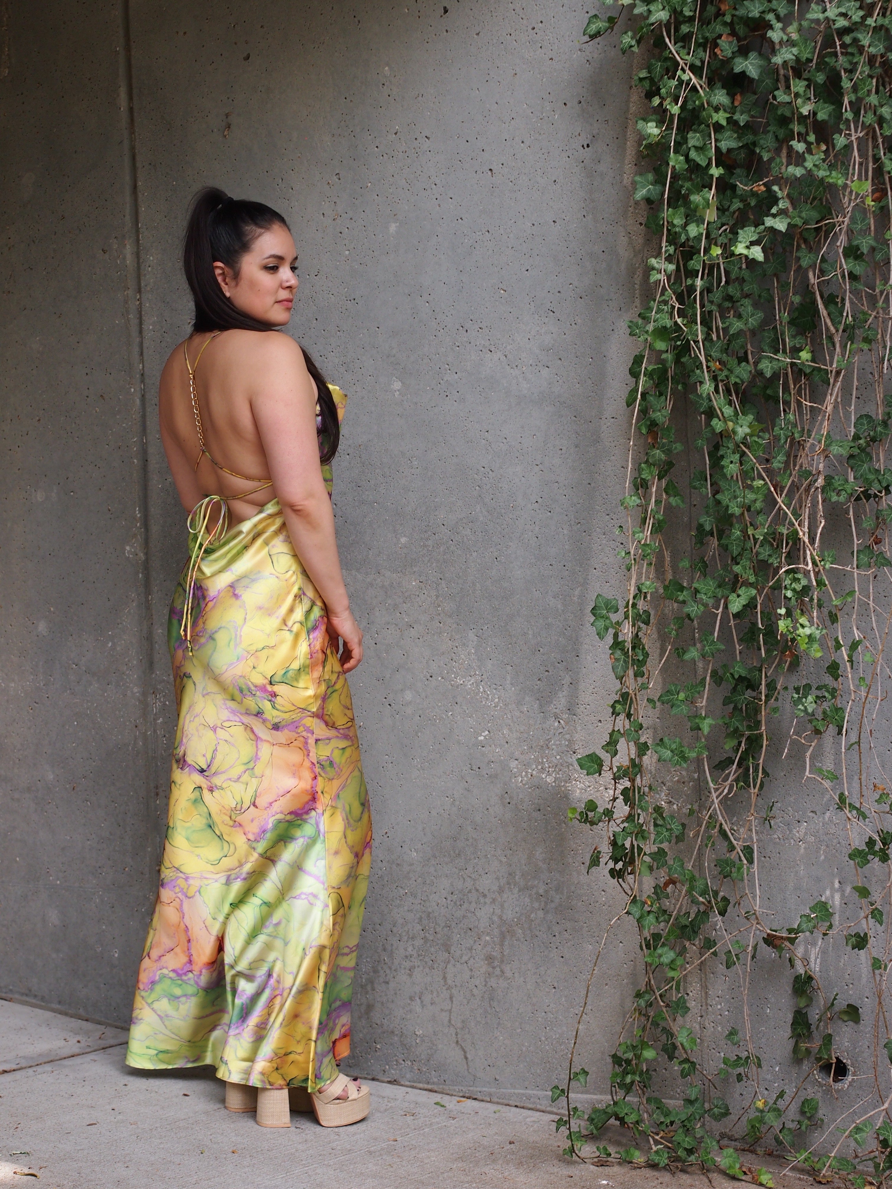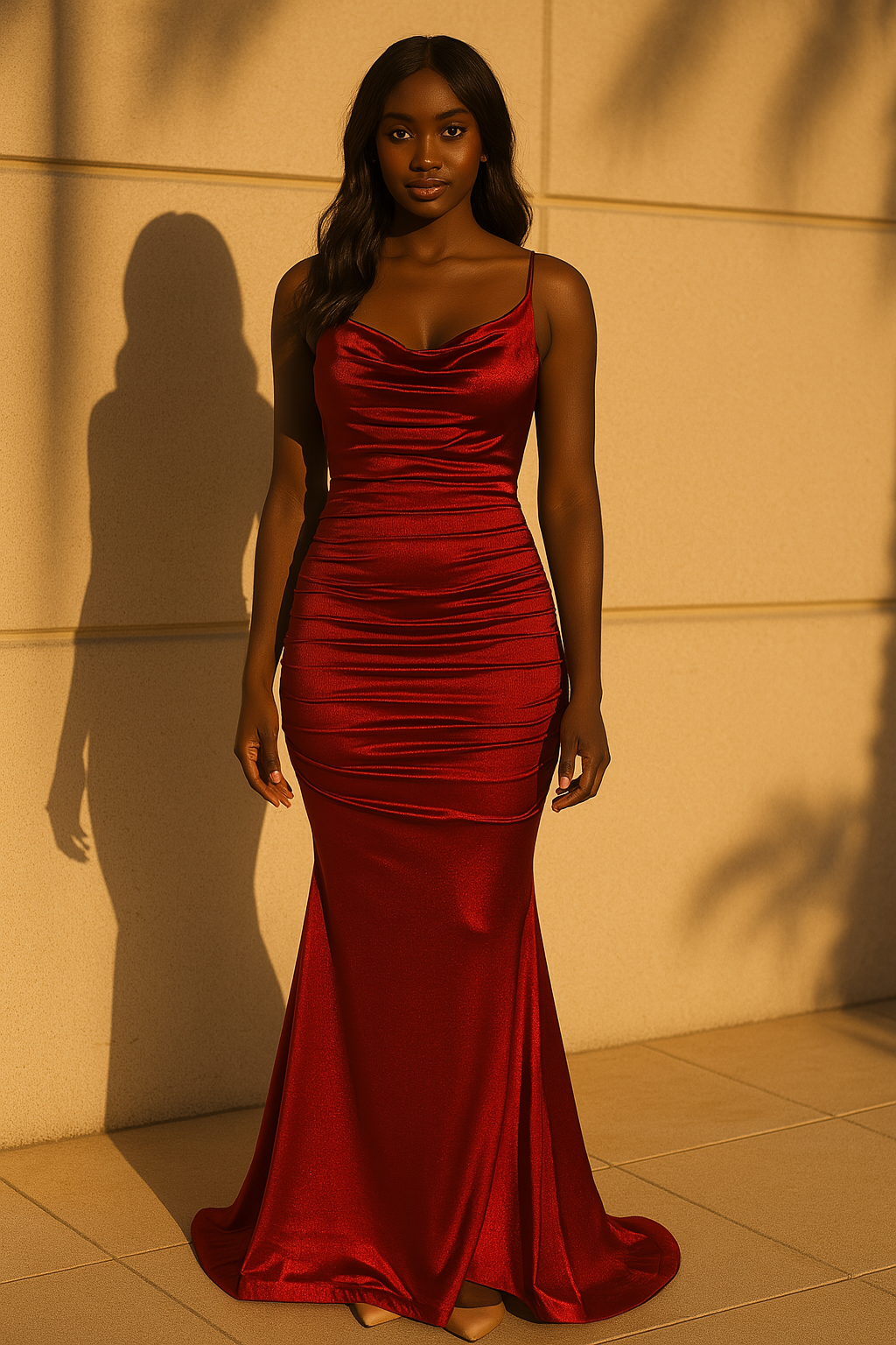 Stockholm Cowl Neck Satin Maxi Dress + Thigh Slit