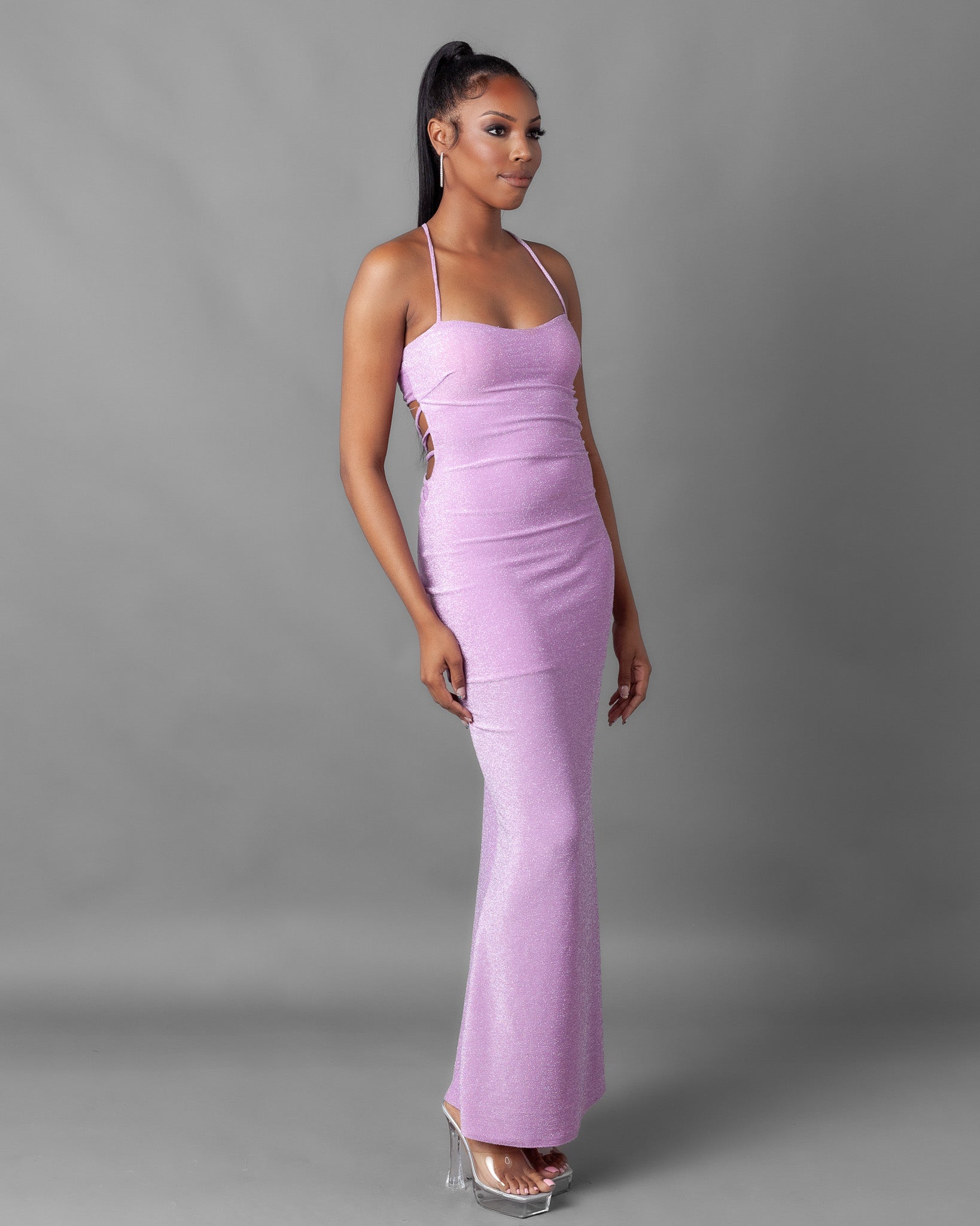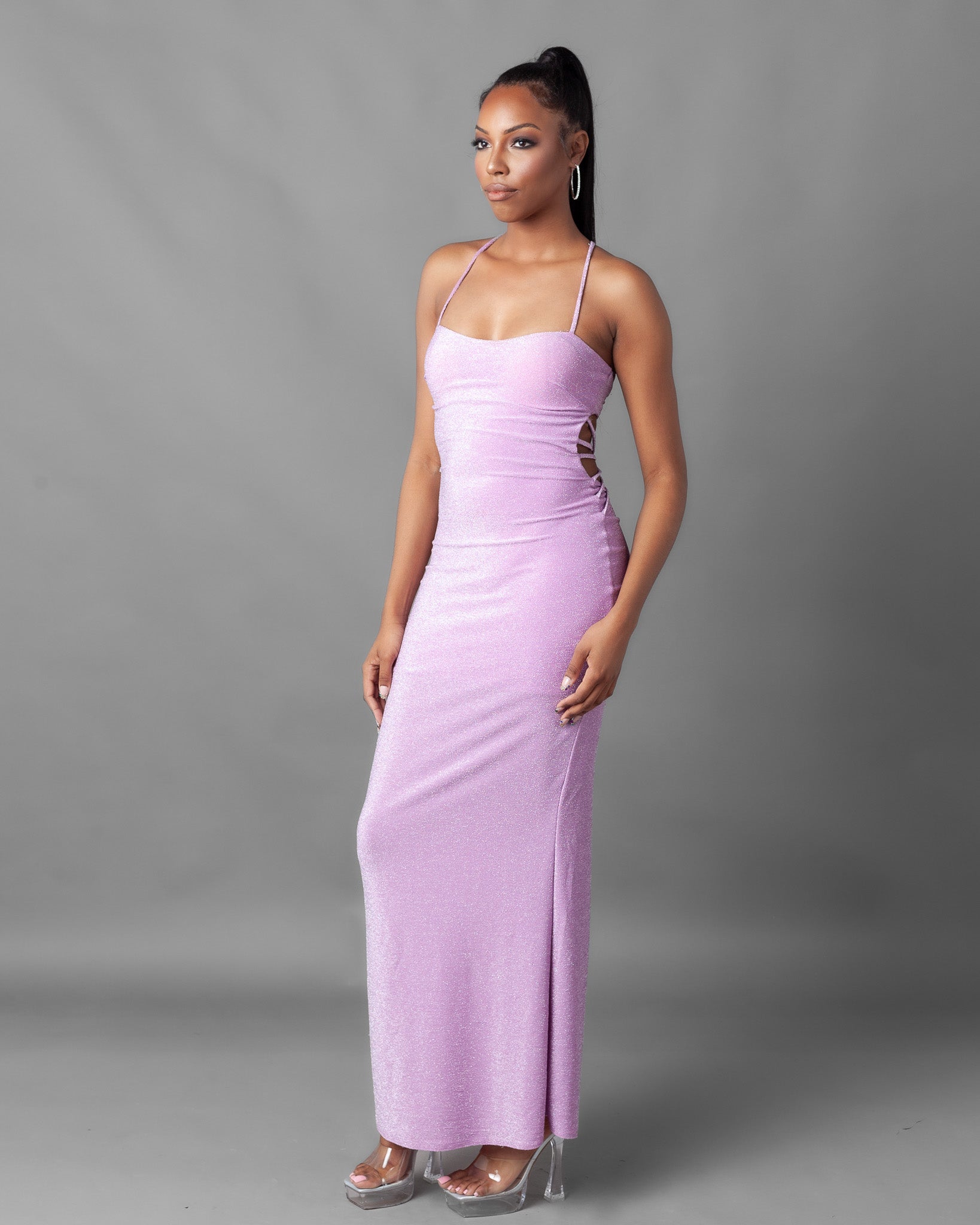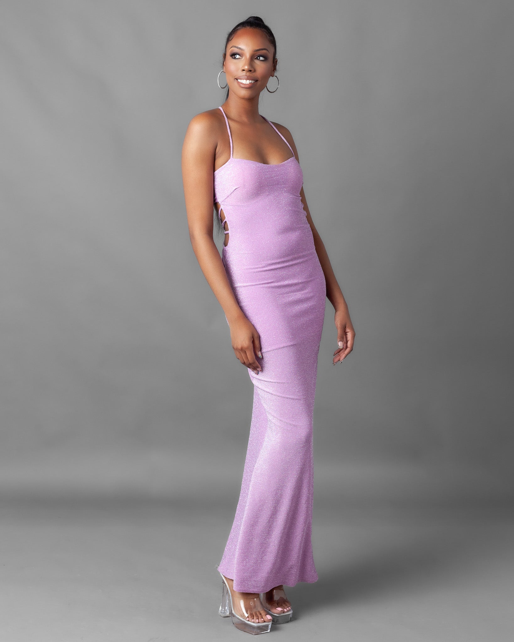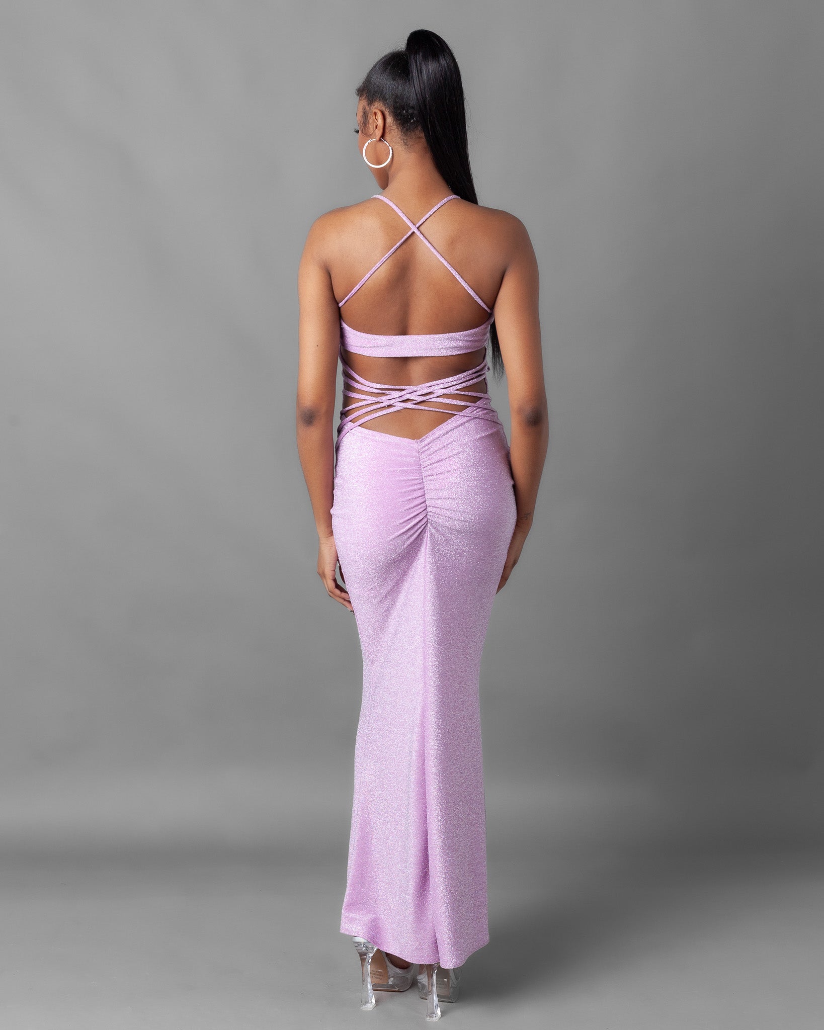 Del Mar Metallic Maxi Dress with Open Back + Crossover Detail