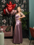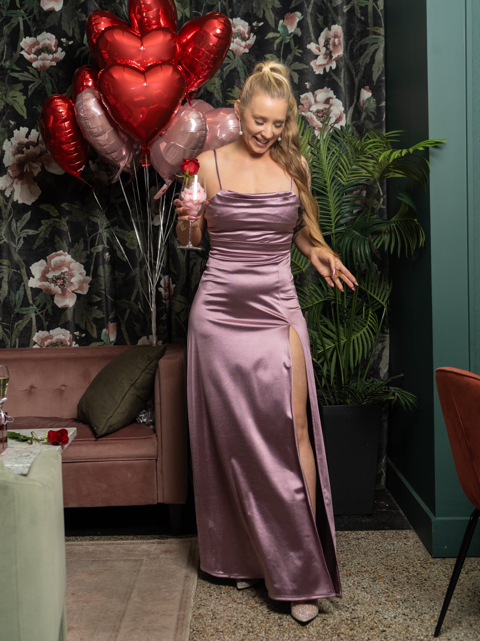 Stockholm Cowl Neck Satin Maxi Dress + Thigh Slit