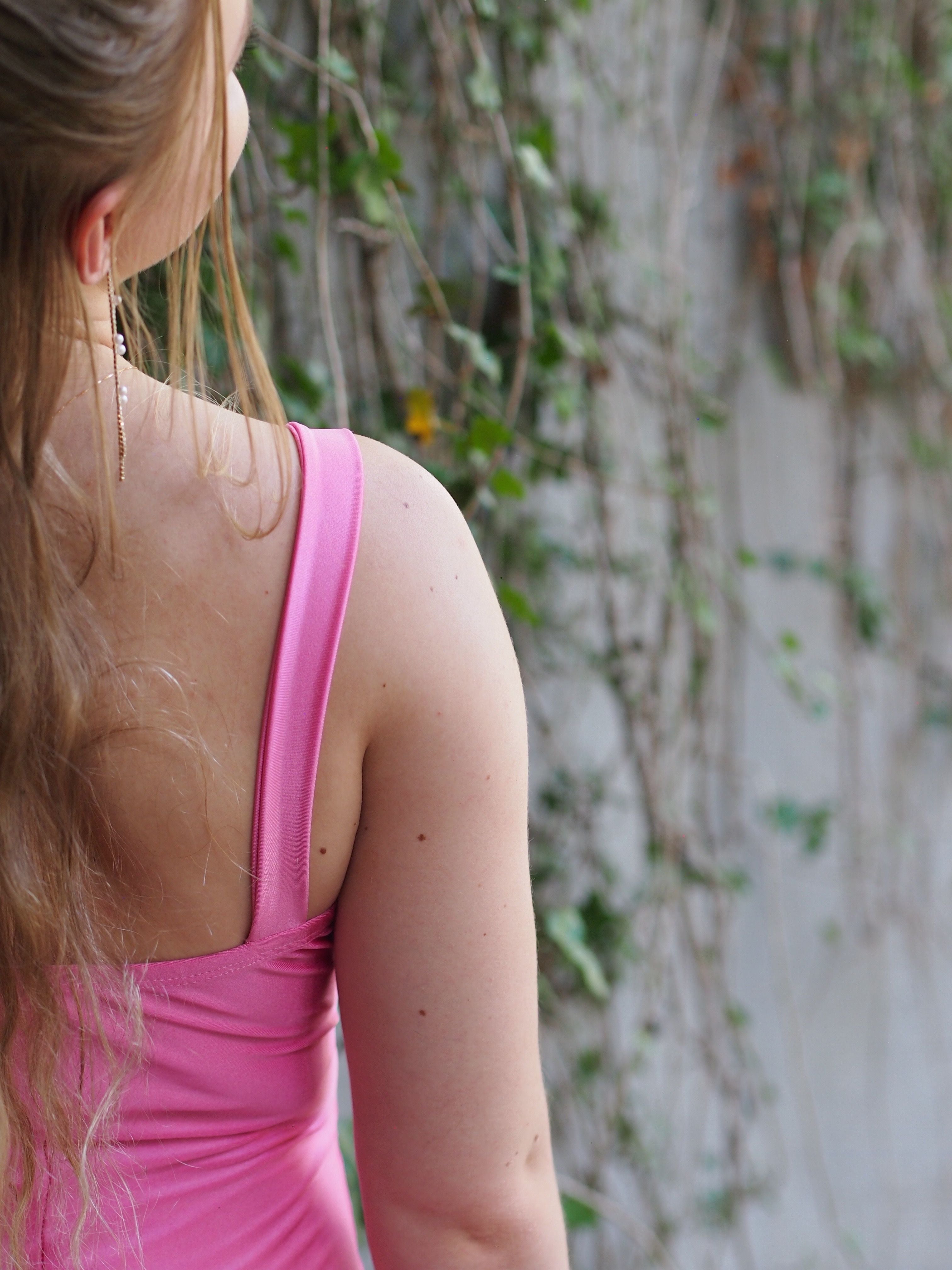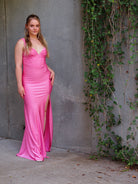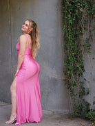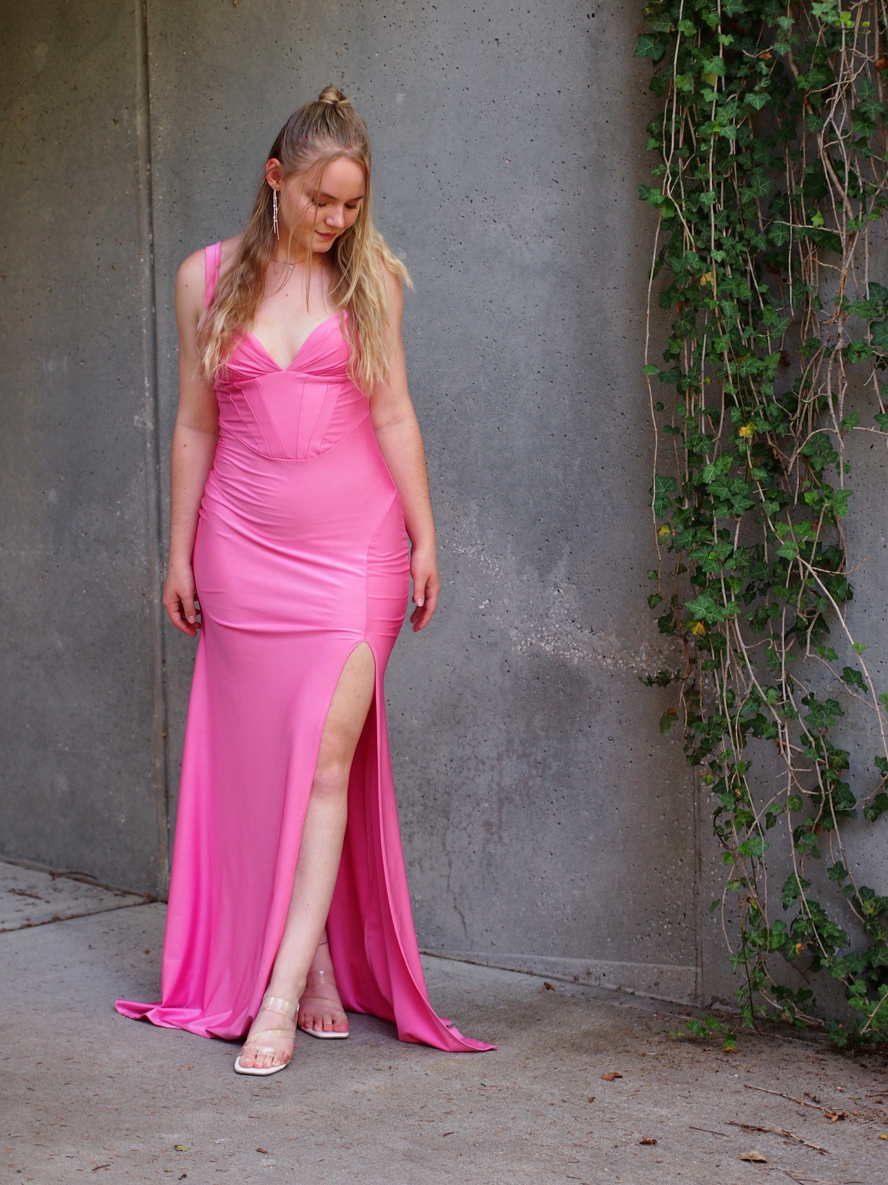 This bubble gum pink maxi dress is such a stunning event dress. With a slight stretch to the material it will fit your silhouette perfectly. There’s a high thigh slit and a soft corset bodice.