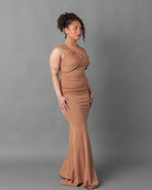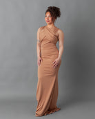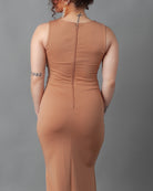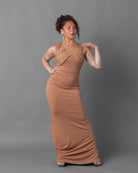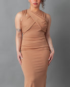Indulge in pure luxury with our mocha wrap bandage top sleeveless maxi dress. This dress features a stunning wrap design that accentuates your curves and a sleeveless cut for a touch of elegance. Perfect for any special occasion, this dress combines sophistication and style for a truly lavish look.