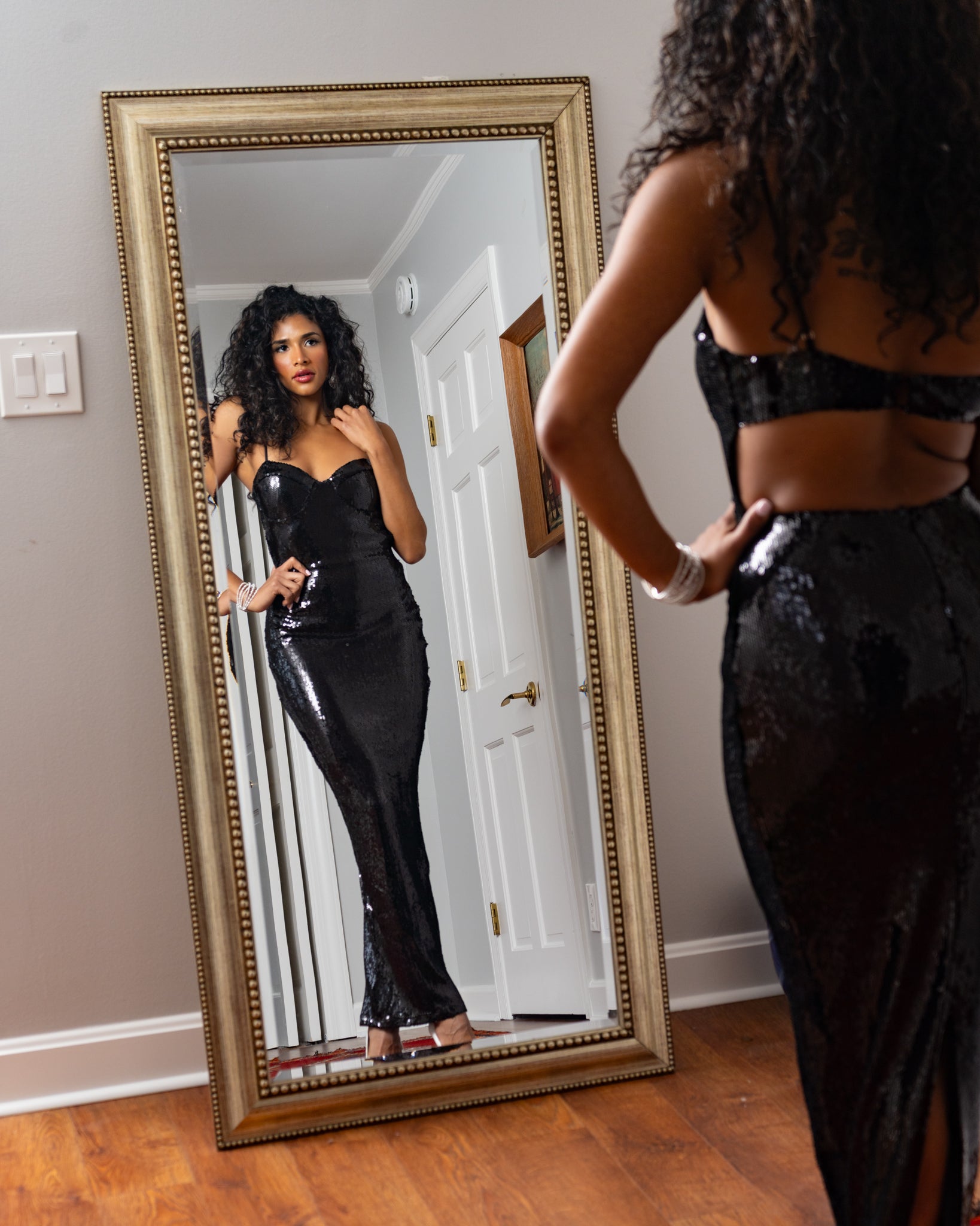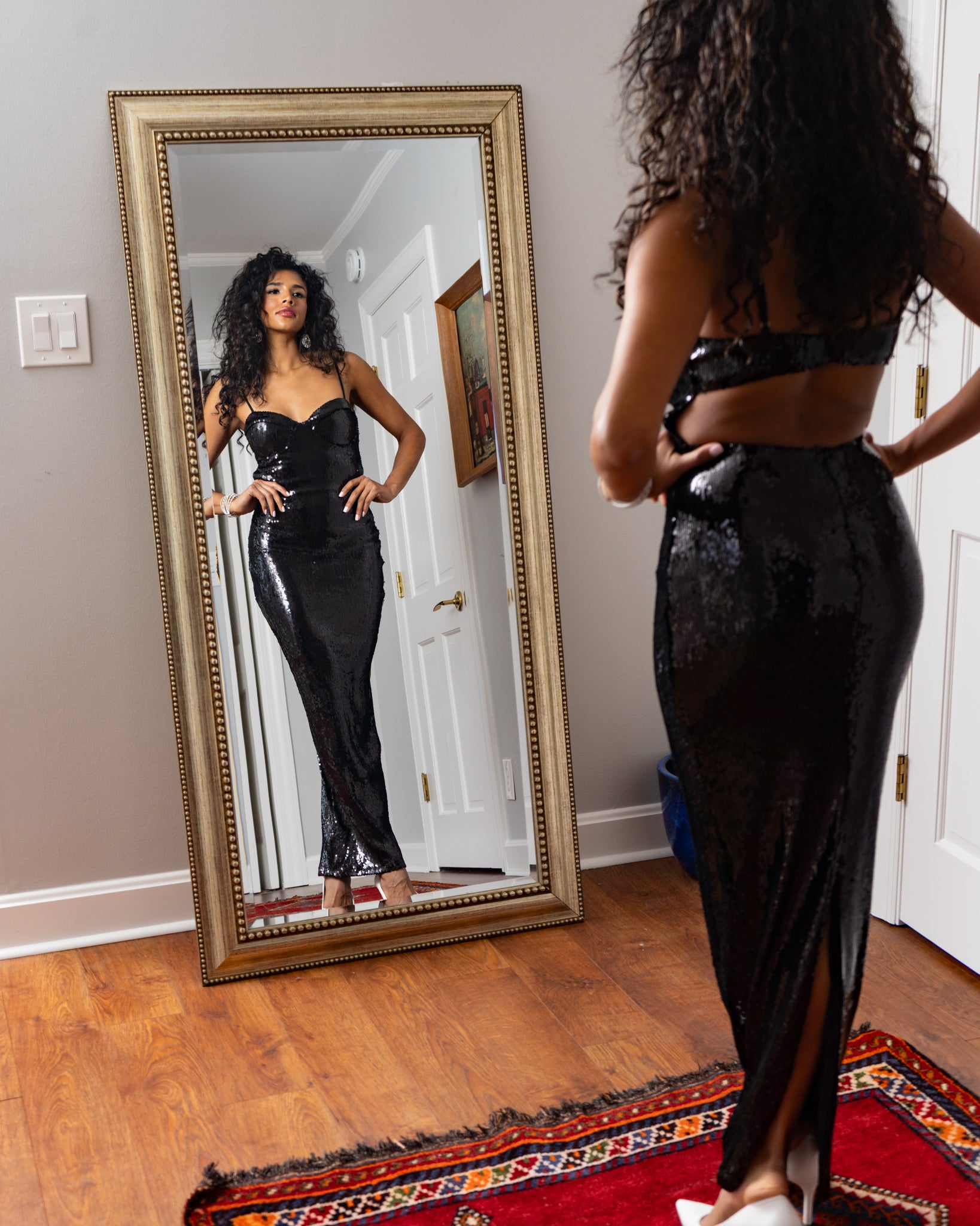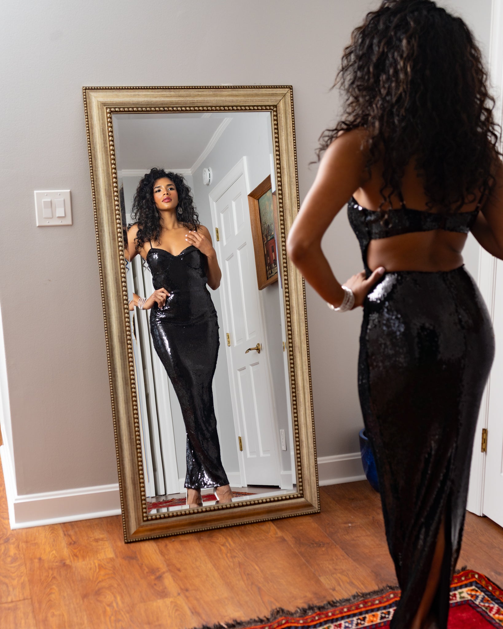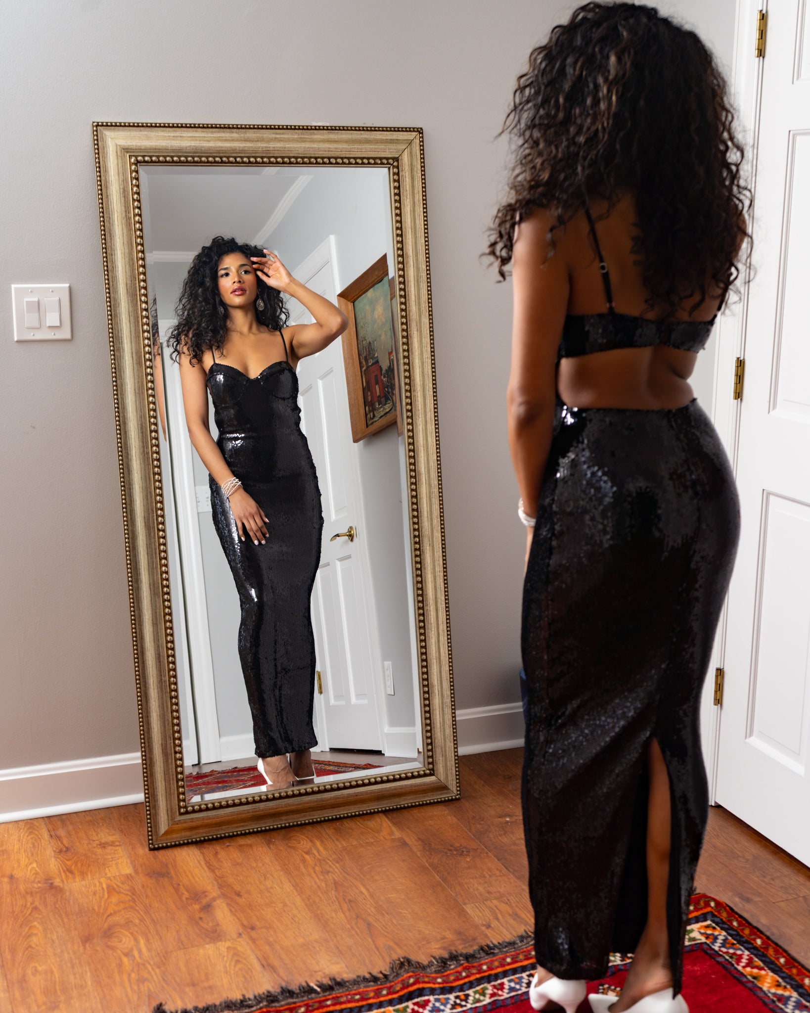 Elevate your style with our Paris Sequin Open Back Maxi Gown! This sleek and sexy black tie evening gown will turn heads and make you feel like a star. The intricate sequin detailing adds the perfect touch of glamour, while the open back design adds a touch of sensuality. Perfect for any formal occasion, this gown is sure to make you stand out and feel confident all night long!