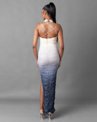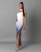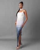 This Ombré Mesh Rouched Maxi Dress features a beautiful blue and cream color scheme that will elevate any beachy date night look. The intricate rouched design adds a touch of sophistication, with a sexy side slit. The perfect occasion dress.