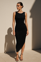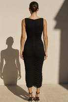 The high bateau neckline balances a form-fitting, ruched silhouette, while the asymmetrical hem adds a modern twist. A thigh-high slit brings a subtle hint of seduction, making this dress ideal for cocktail parties, date nights, or elegant evening soirees. Crafted from a soft, stretchy fabric for a comfortable yet sculpted fit.