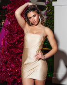 This mini dress features a flattering cross front and spaghetti straps for a fashion-forward look. The straight neckline creates an elegant, timeless silhouette perfect for any occasion. Show off your figure in this stylish and sophisticated dress.