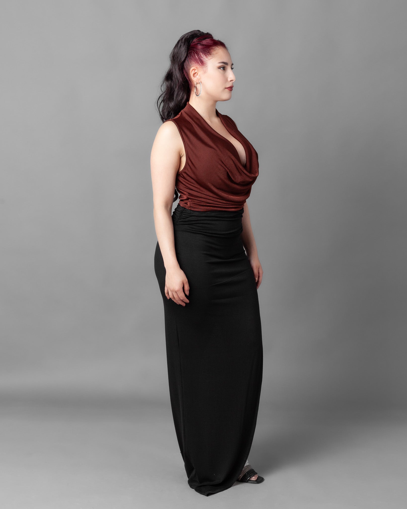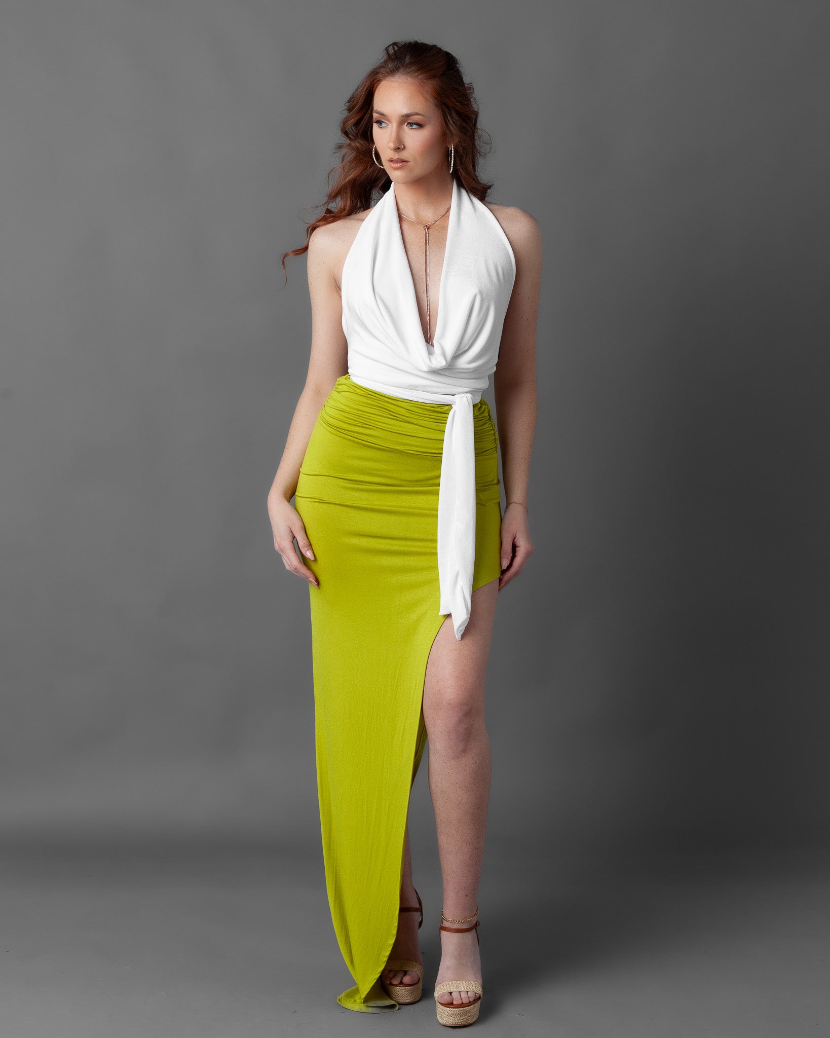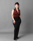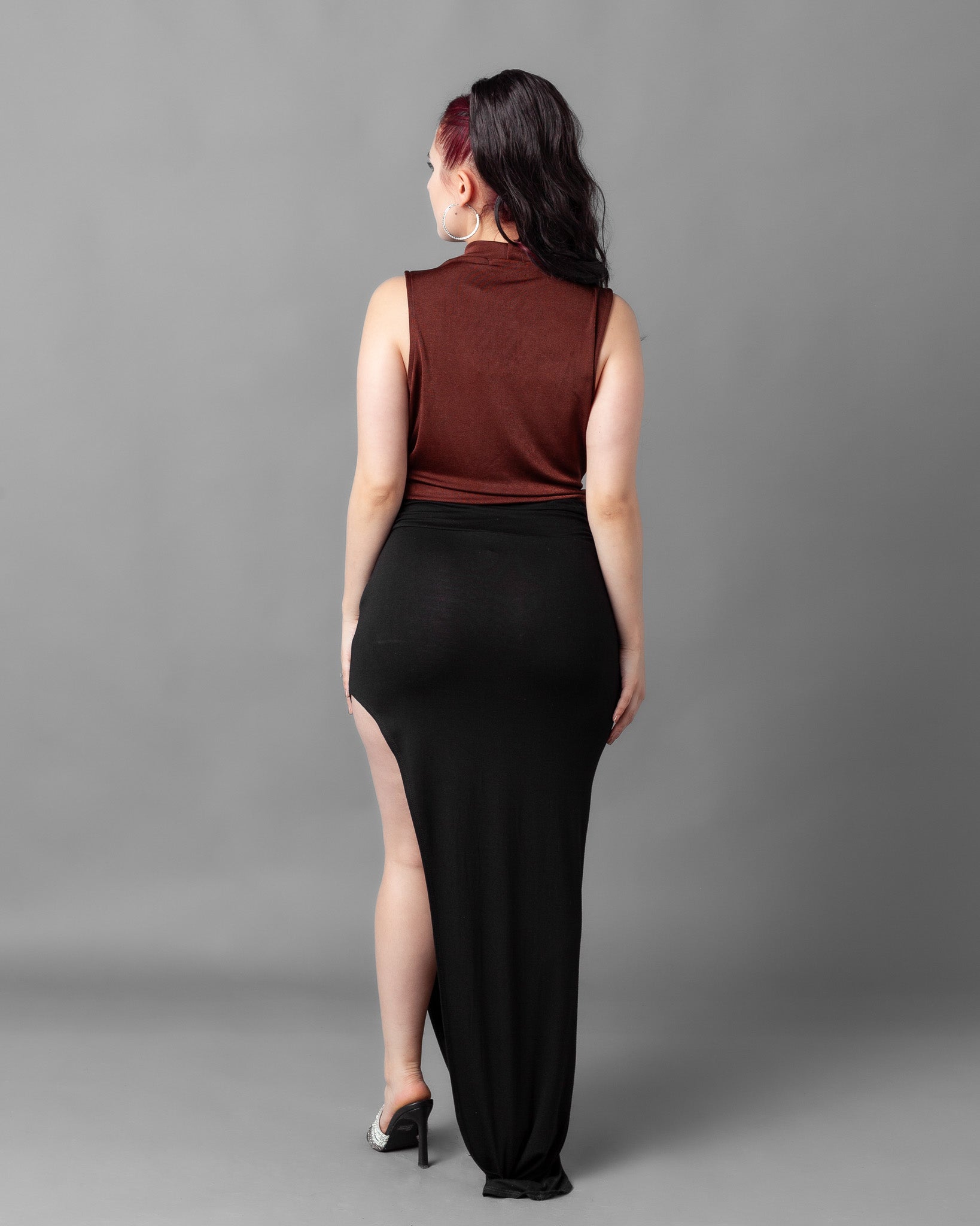The perfect versatile summer piece has arrived. This soft jersey knit cut out high slit skirt is the perfect capsule item. There's stretch to fit your curves this can be worn as a swim cover, on vacation or to a local brunch date. It mixes in with body suits, cropped tops, swimwear or a basic tee. The fold over waistline is elastic but sewn into place so it wont move around on you.