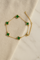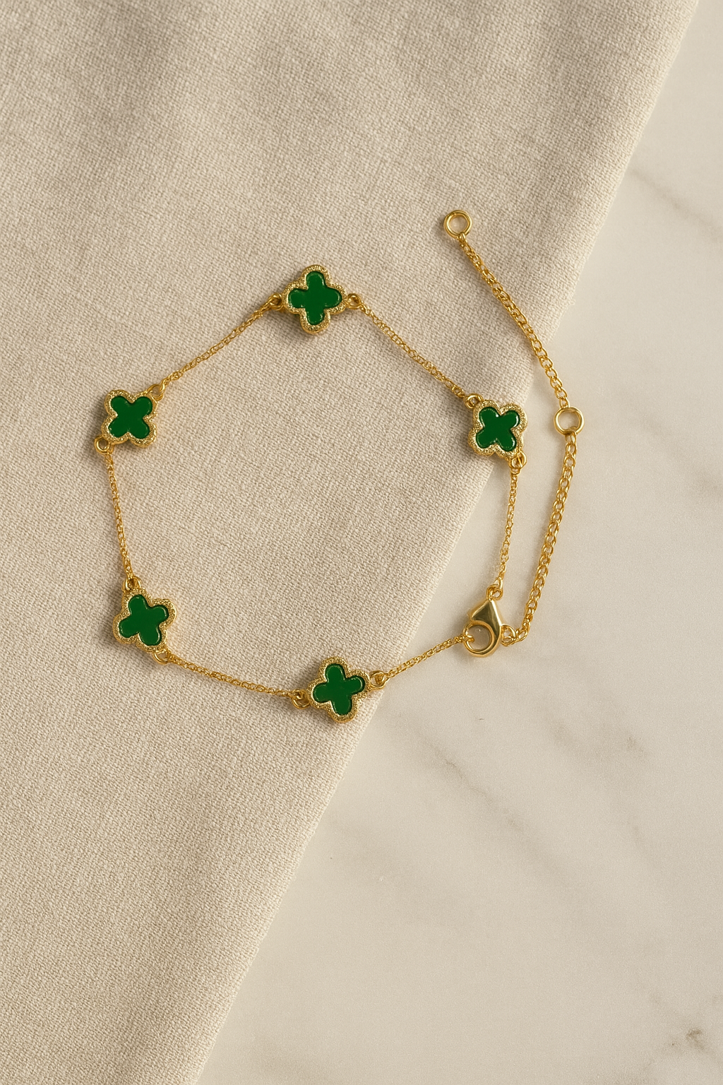 Add a touch of elegance and good fortune to your style with our Emerald Clover Gold Chain Bracelet. Featuring five green enamel four-leaf clover charms, this delicate bracelet is crafted with a high-quality gold-plated chain that shimmers beautifully against your skin. Each clover symbolizes luck and prosperity, making it a meaningful gift or a chic addition to your own jewelry collection.