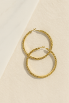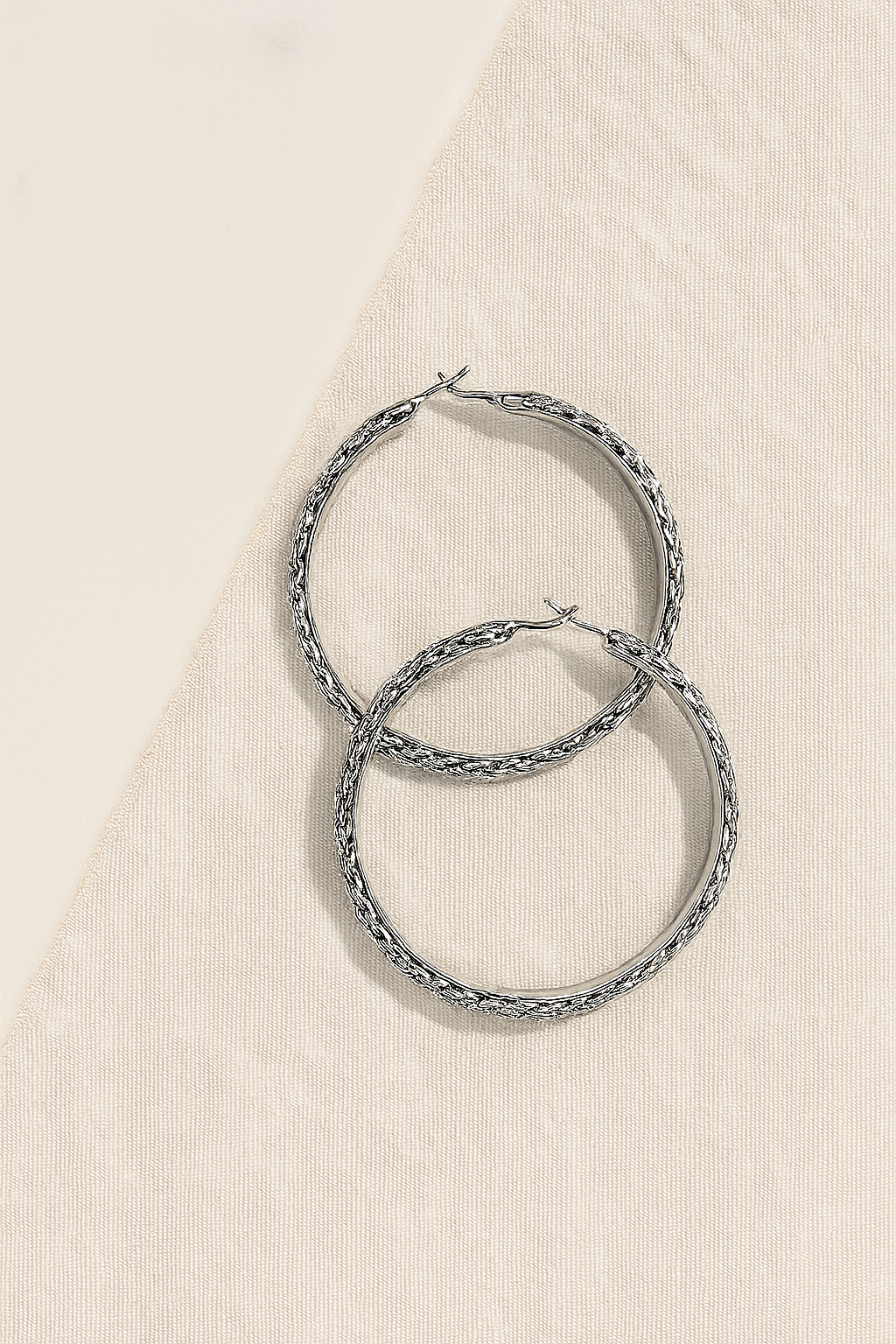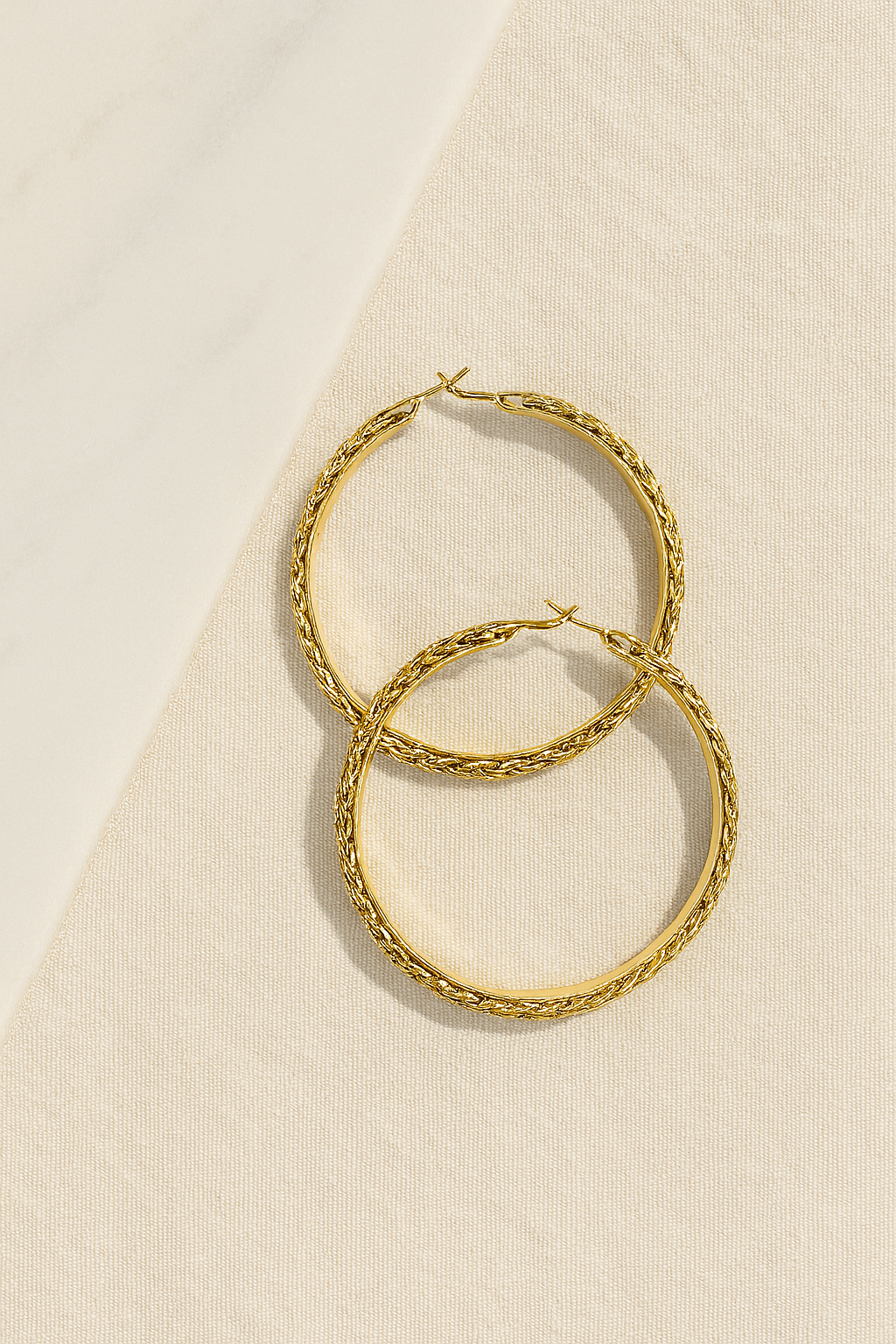 These sculpted hoop earrings feature a refined outer edge etched with a subtle rhombus snake texture—offering a perfect fusion of polish and dimension. Crafted from durable surgical steel, their bold silhouette and sleek finish create an effortlessly striking look. Sophisticated enough for evening, yet versatile enough for daily wear, these hoops bring quiet luxury to any outfit.