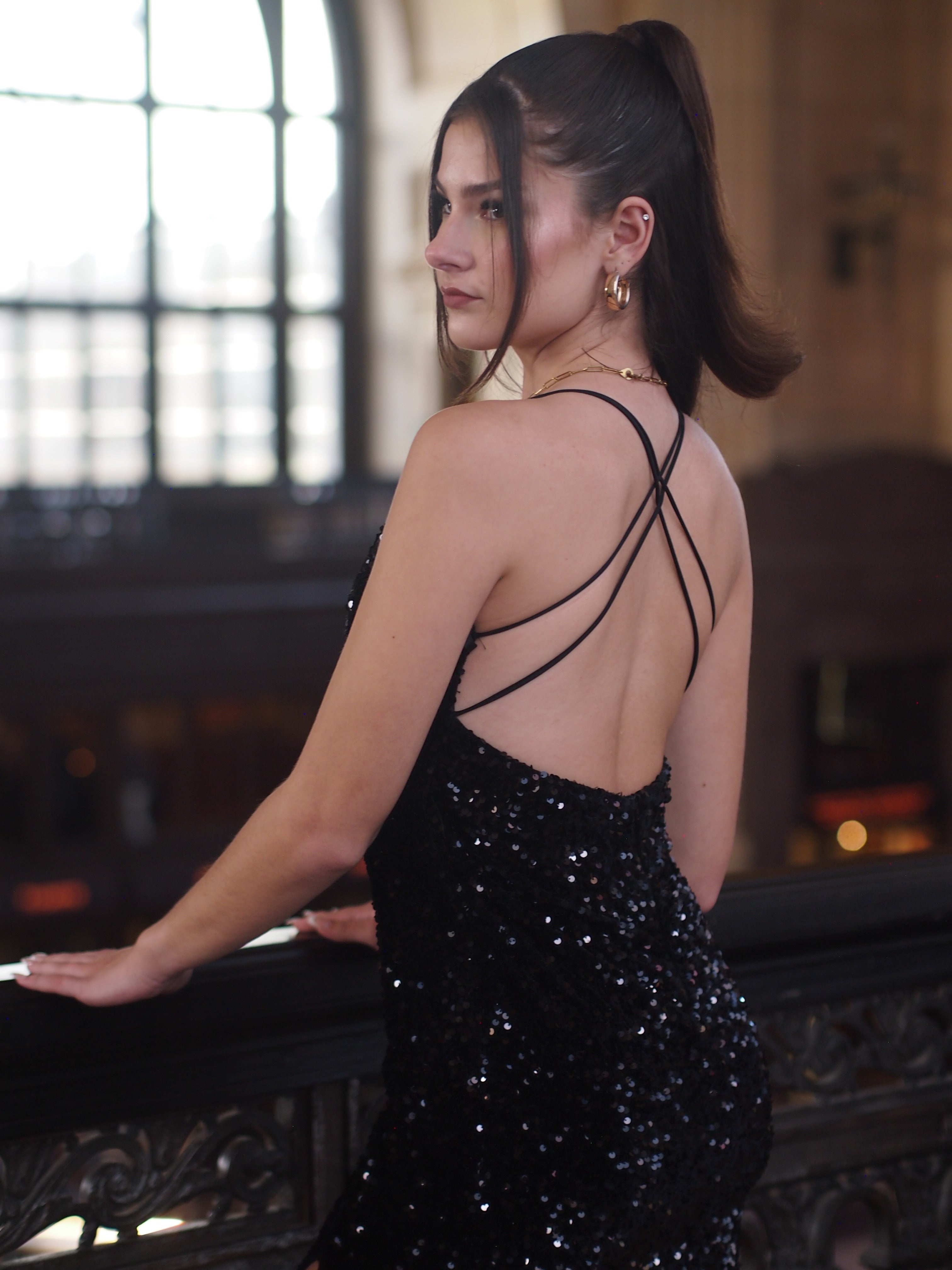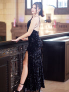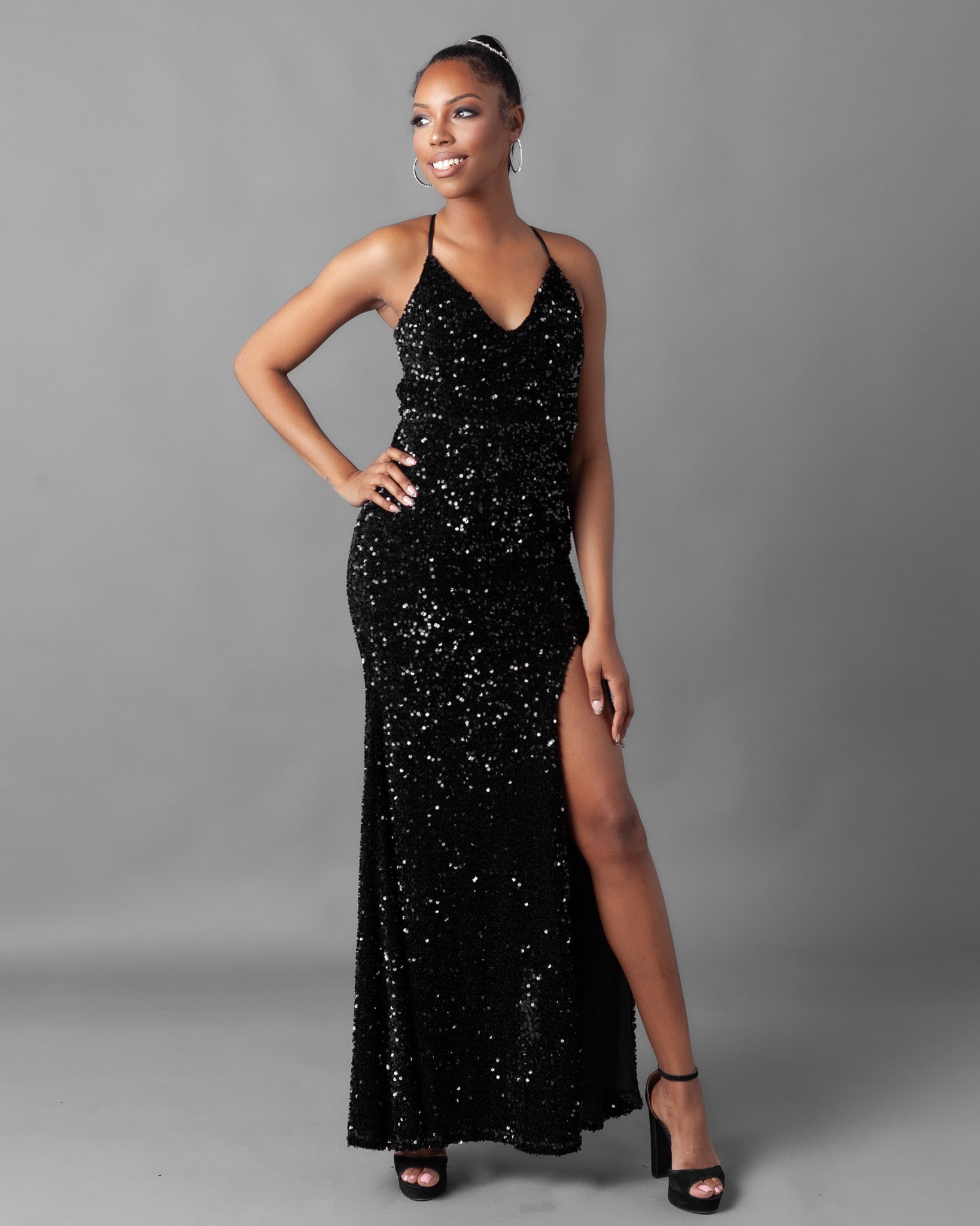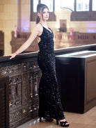 This stunning double spaghetti strap cross back velvet sequin maxi dress is a glamorous choice for formal occasions. Its soft, luxurious velvet fabric and all-over sequin design will ensure you sparkle all night long, while its stylish cross back straps and maxi length make it flattering and comfortable. Finished with a front thigh slit.