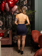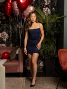 This dress creates such a gorgeous fitted silhouette. Introducing our Madrid Glitter Pencil Mini Dress! With a sexy open back and a figure-hugging fit that stretches to perfectly accentuate your individual curves. Elastic straps and back for a custom fit + lining, you'll feel confident and glamorous in this stunning dress.