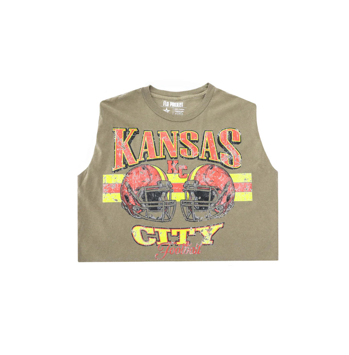 Show your hometown pride in this Kansas City Football sleeveless tee, featuring distressed varsity lettering, bold helmet graphics, and classic red-and-yellow stripes. The vintage-inspired design pairs perfectly with jeans or layered over long sleeves for game day. Soft, breathable, and ready to cheer from kickoff to the final whistle.