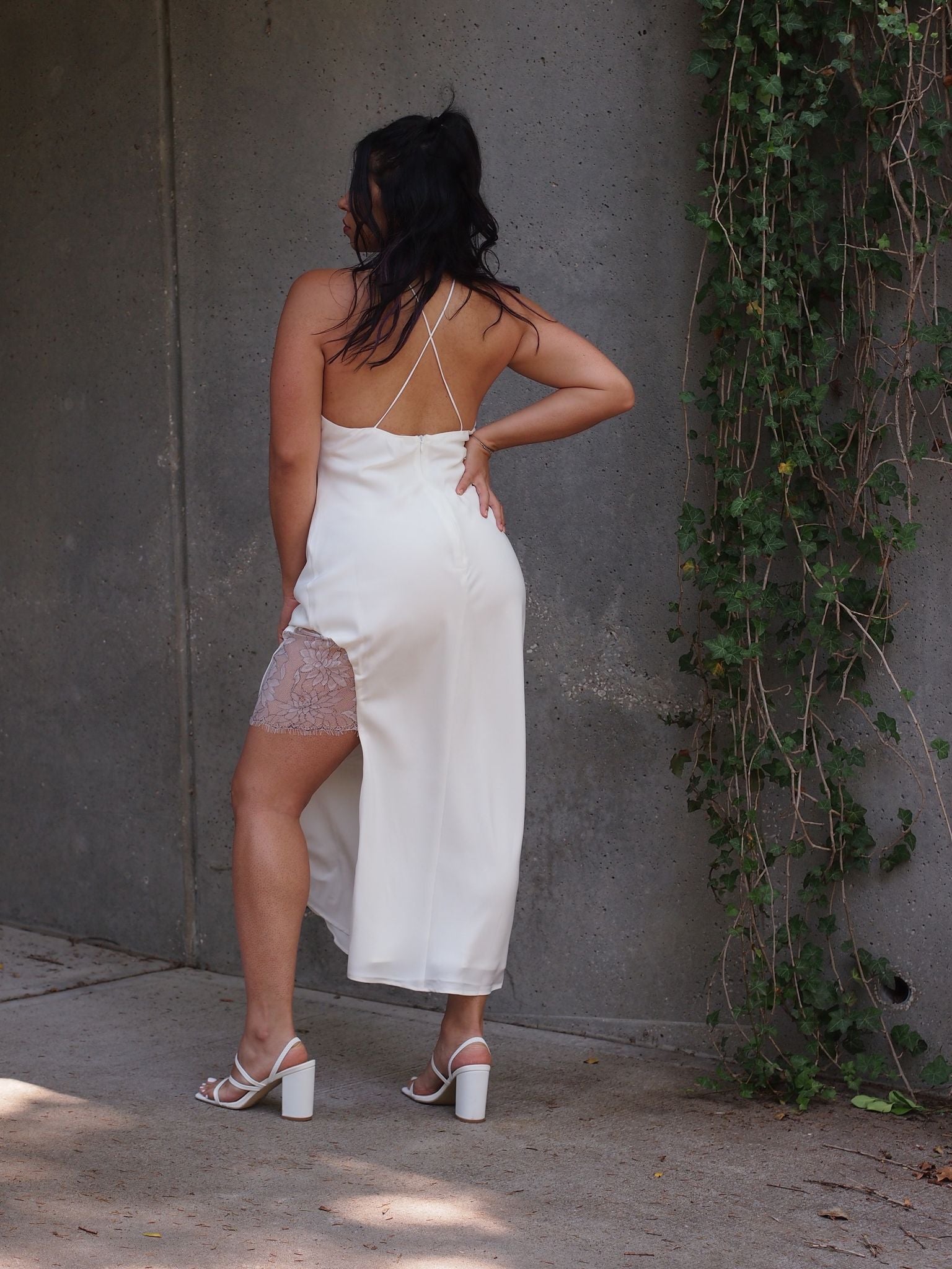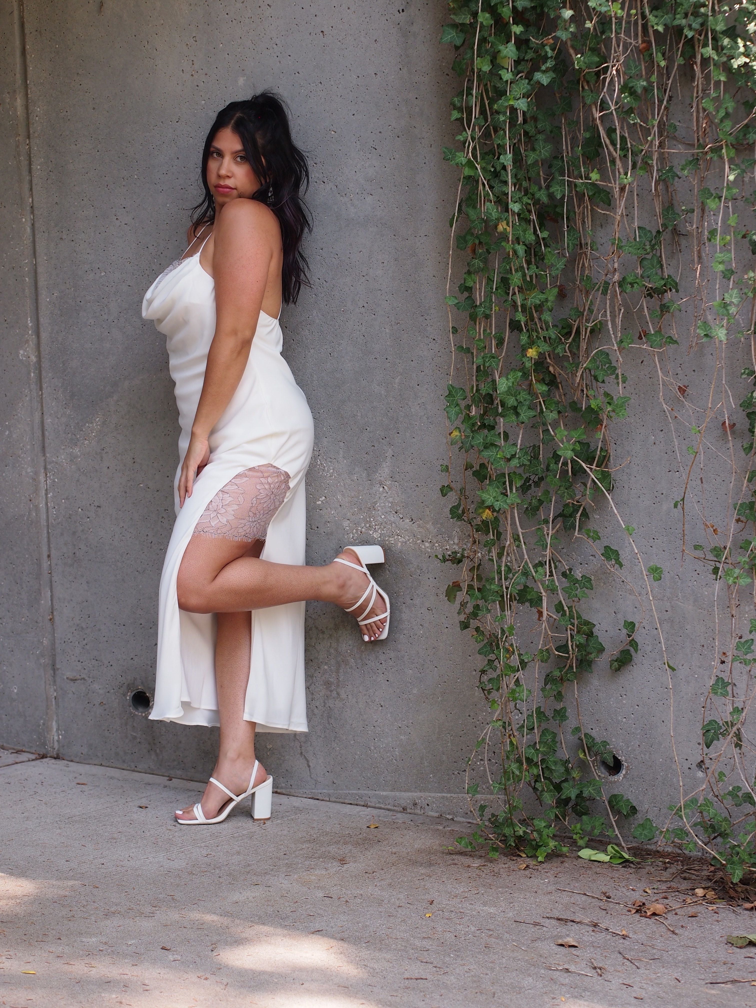 This dress is stunning. The perfect blend of romantic and chic. The bodice has a cowl neckline with a white and black detailed lace feature. The fabric has a beautiful sheen. It’s fully lined with an open side slit adorned with floral lace. Finished with X back spaghetti straps and a back zipper.