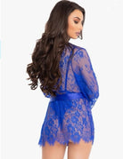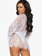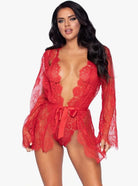 Includes lace teddy, matching robe, and satin tie.