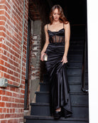 Indulge in luxury with our London Corset Satin Maxi Dress. Perfect for galas, black tie events, and proms, this dress features a mesh sheer corset and an adjustable tie-up back for the perfect fit. Complete with a lower back to floor train, this dress will make you feel elegant and sophisticated at any occasion.