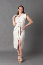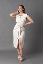 Expertly crafted from oatmeal linen, this Madrid Tie Front Midi Button Down is the perfect addition to your summer wardrobe. Featuring a button-down front and tie front detail, this dress is versatile and on-trend. The collared, sleeveless design with shoulder pads adds a touch of sophistication. Perfect for a day at the beach or a casual outing.