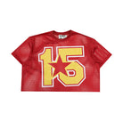 Rep your favorite player in bold style with this Mahomes Number 15 game day mesh tee. Featuring oversized varsity-style numbers with a star accent in bright team colors, this breathable mesh top is perfect for layering over a tank or bralette. Ideal for tailgates, stadium seats, and showing your pride wherever game day takes you.