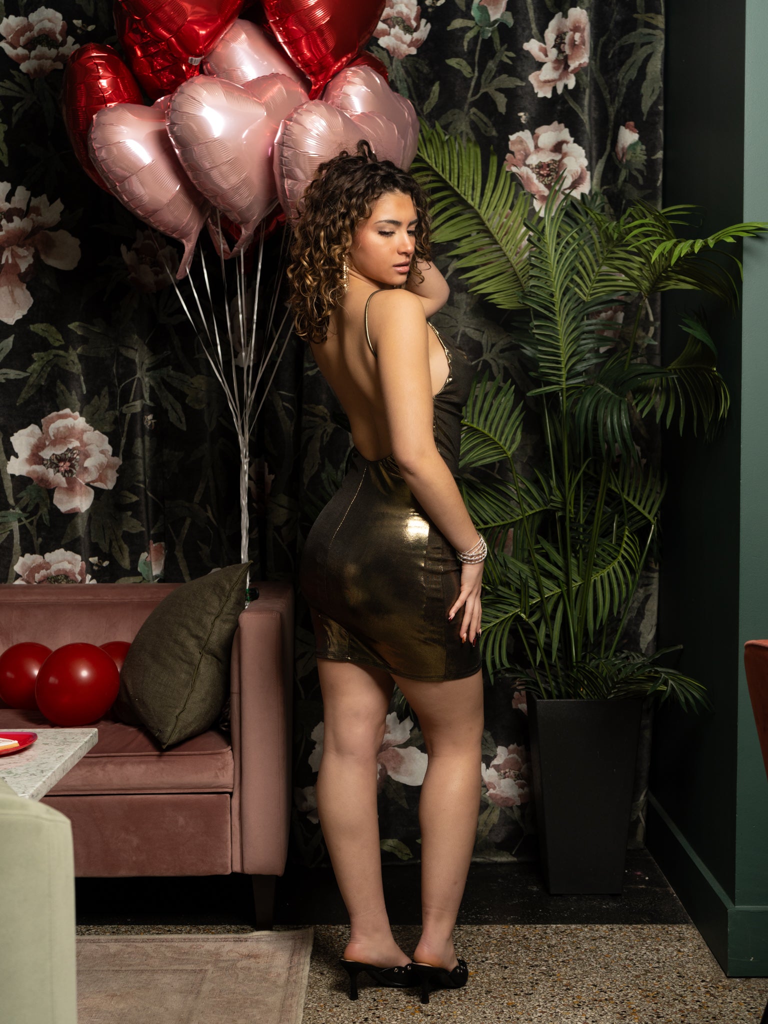 Have the perfect date coming up but need the perfect dress to match? You are going to love our Metallic Pencil Open Back Mini Dress. The gold metallic shimmers captures the perfect amount of attention, while the open back and spaghetti straps add a hint of seduction. It finishes with a lined pencil skirt perfect to accentuate any curves.