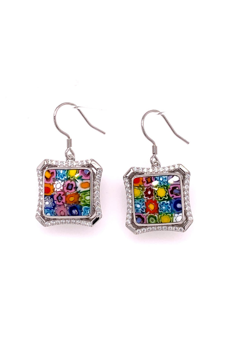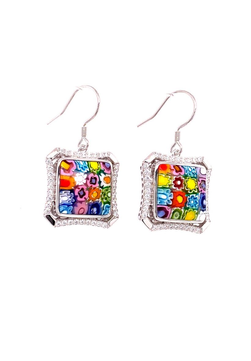 MURANO MILLEFIORI CUSHION CUT GLASS, SEMI HALO CUBIC ZIRCONIA DROP EARRINGS.