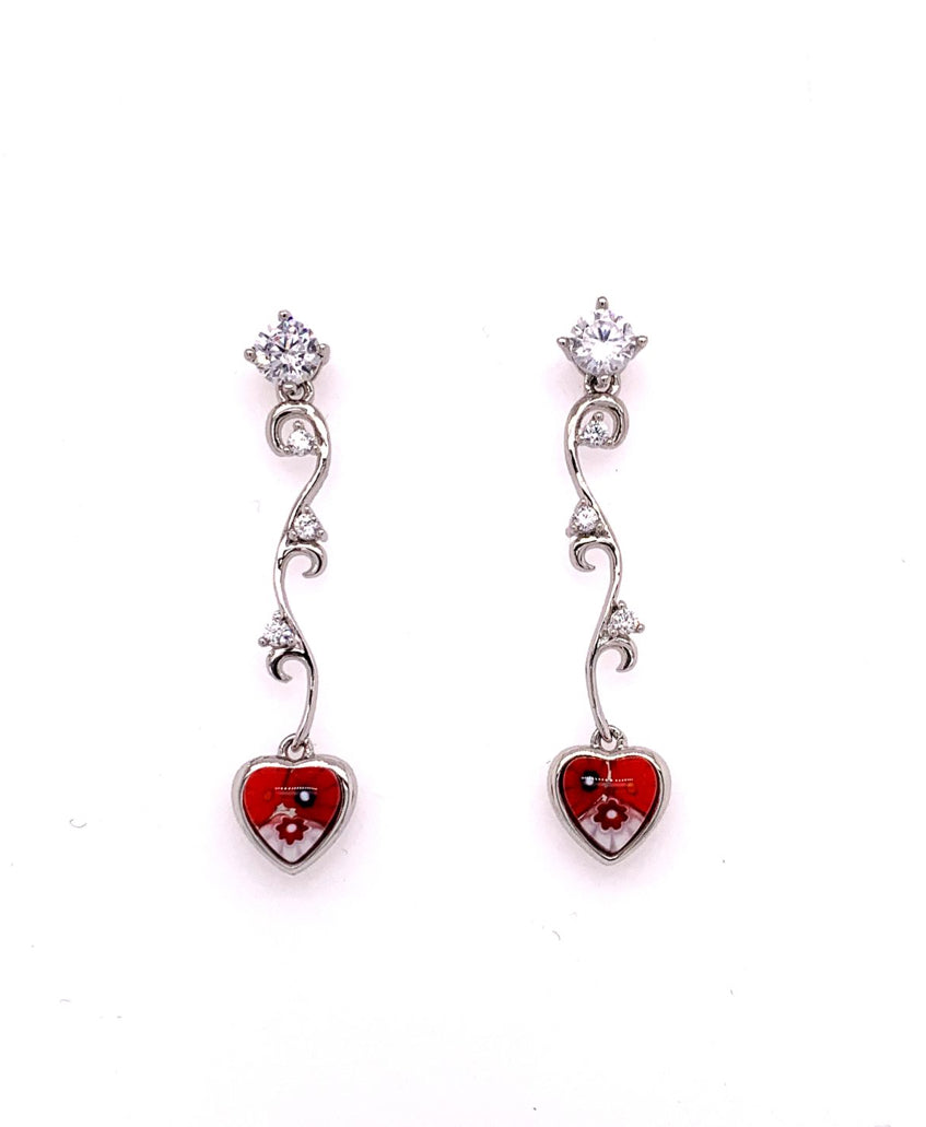 MURANO MILLEFIORI HEART SHAPE GLASS AND CUBIC ZIRCONIA VINE BRANCH DROP EARRINGS