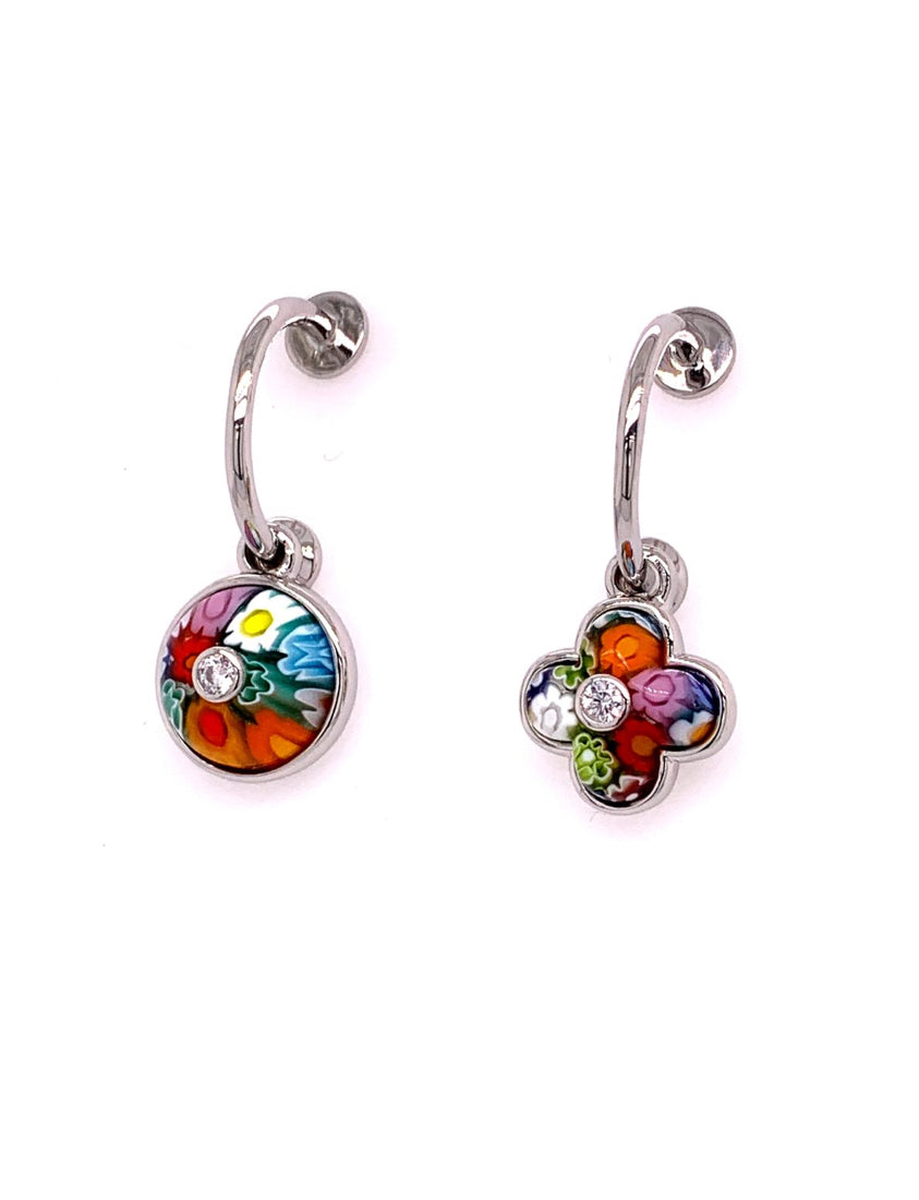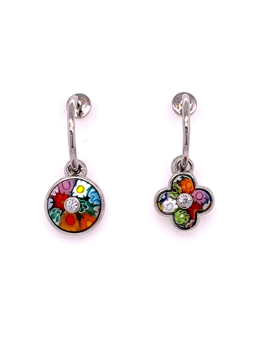 MURANO MILLEFIORI ROUND AND CLOVER CUT GLASS CHARM, SEMI HOOP EARRINGS.