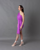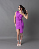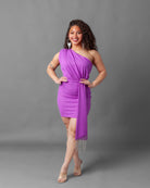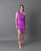 Obsessed with our Lagos One Shoulder Orchid Glitter Pleated Mini Dress! This party dress features a playful one shoulder design, stunning purple color, and eye-catching glitter detailing. The fringe waist tie adds a touch of fun to this flirty and stylish dress.