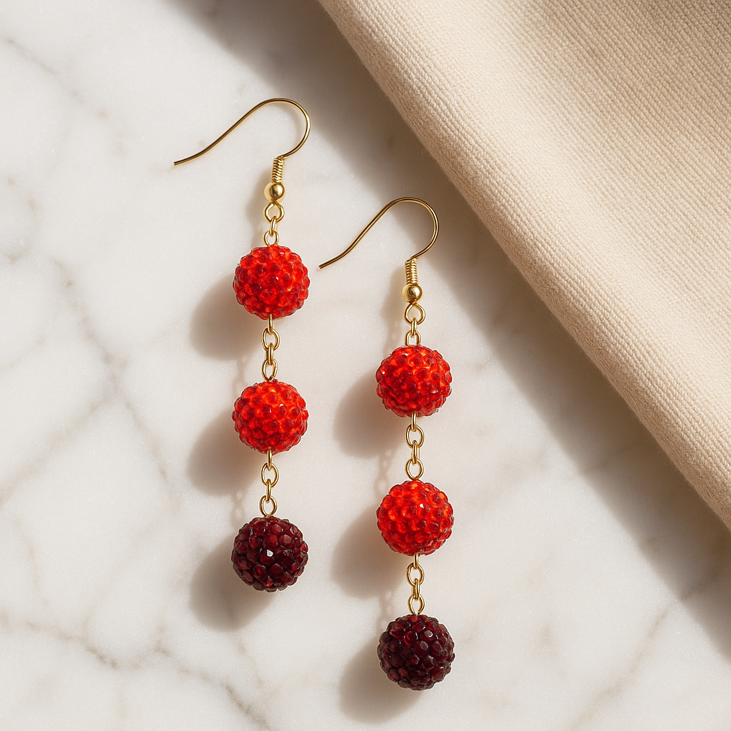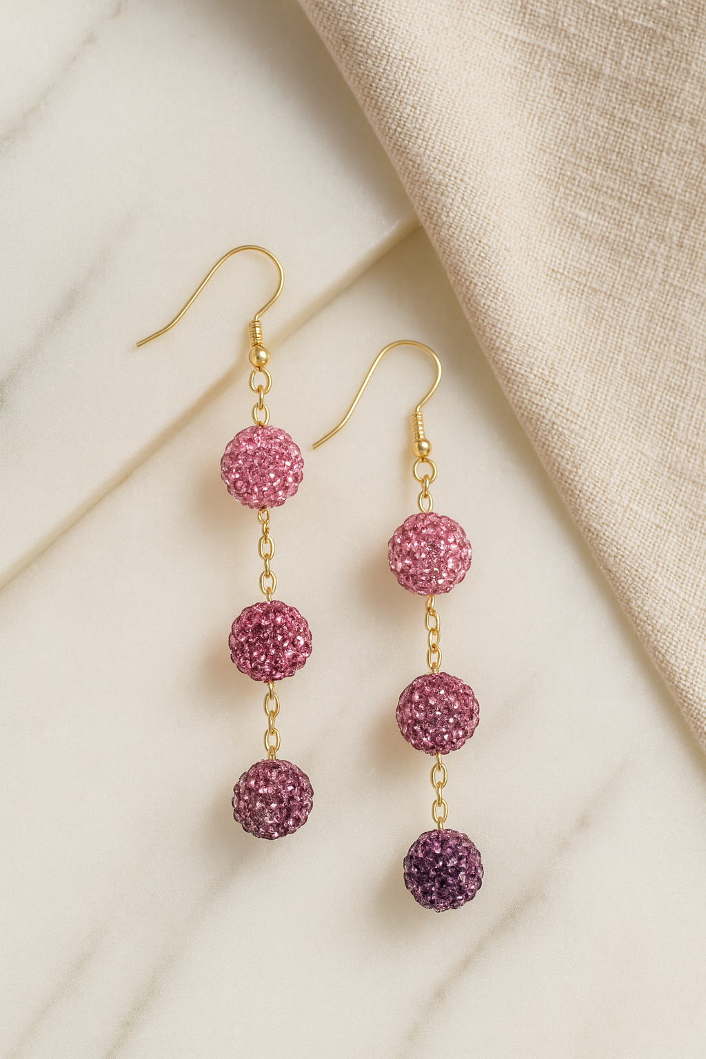Bring bold texture and vibrant movement to your look with these Triple Beaded Drop Earrings. Featuring three shimmering rhinestone-studded beads arranged vertically on delicate gold-tone chains, these earrings offer eye-catching sparkle and playful charm—perfect for day-to-night transitions.