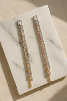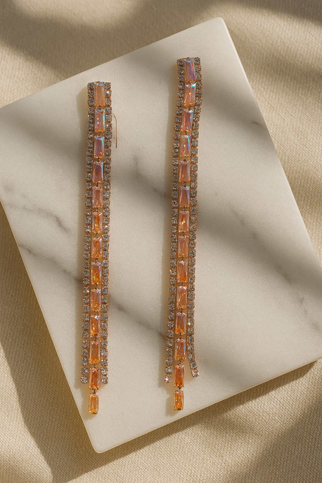 Add instant glamour with these long rhinestone fringe earrings. Designed with dual vertical rows of faceted stones, they offer bold sparkle and a sleek silhouette. Perfect for dressing up any evening look, special occasion, or night out. Lightweight and easy to wear with a secure post-back closure.