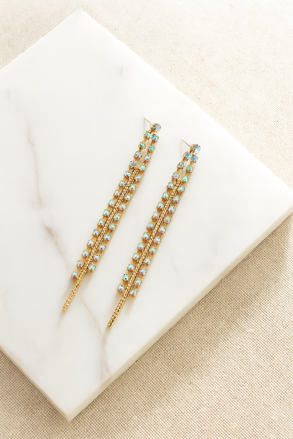 Turn heads with these dazzling crystal drop earrings, crafted to add show-stopping sparkle to any look. Featuring a sleek linear silhouette and intricate crystal details, they’re the perfect accessory for nights out, weddings, or elevating your everyday style