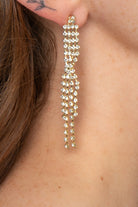 These stunning Rhinestone Gold 4 Strand Twist Drop Earrings feature four strands of rhinestones twined together in a graceful twist pattern, adorned with a diamond-cut gold setting. Perfect for any occasion, these earrings will add the perfect amount of sparkle to your look.
