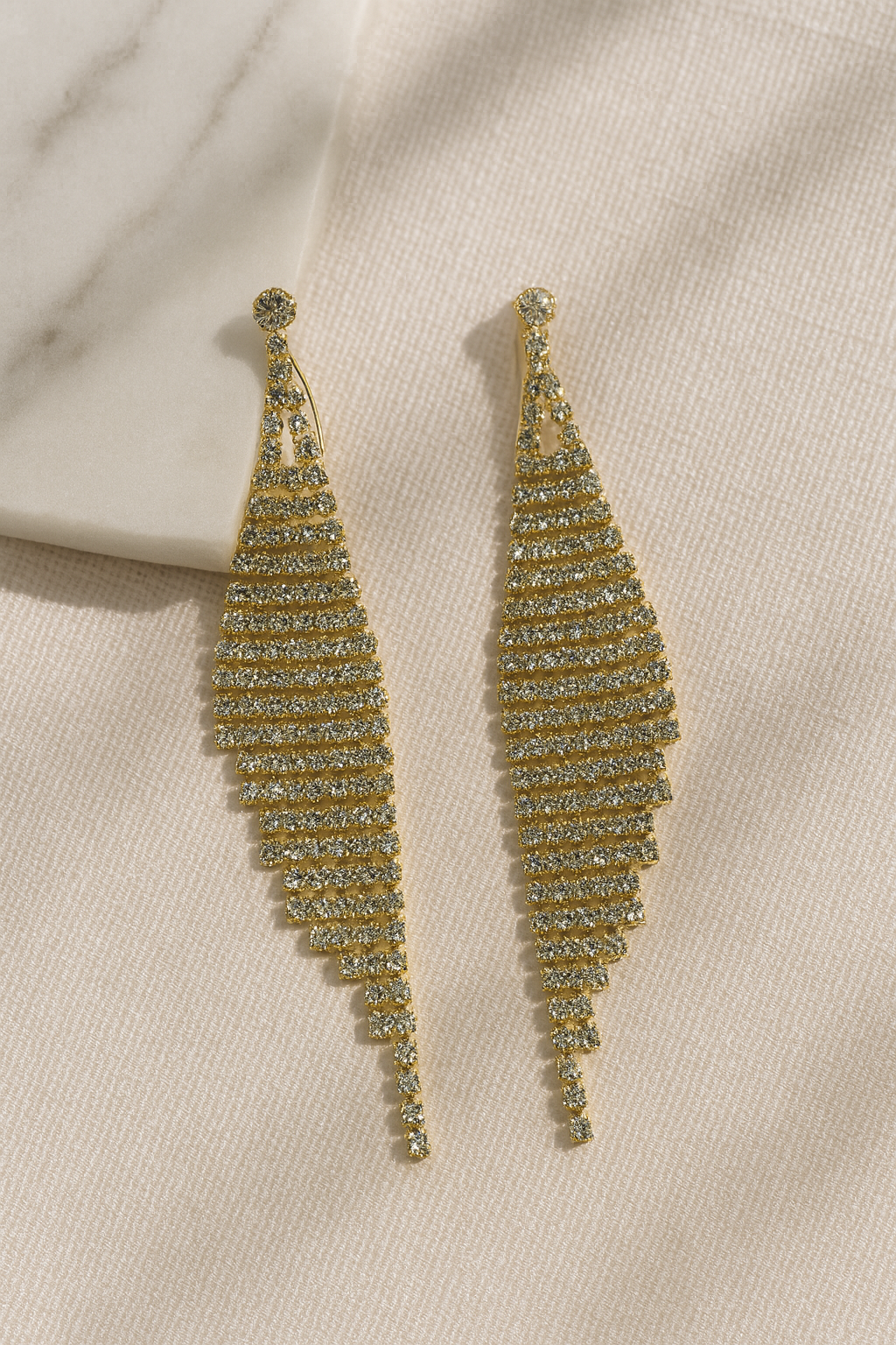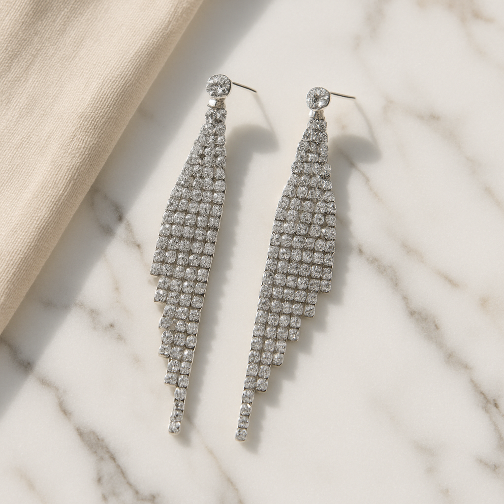 Designed to captivate, these asymmetric rhinestone drop earrings feature a dramatic cascade of precision-cut stones that taper into an elegant diagonal silhouette. Light-catching and architectural, they bring fluid movement and sophisticated shimmer to eveningwear, formal ensembles, or editorial-inspired looks. Thoughtfully weighted for comfort, these earrings make an impression without compromise.
