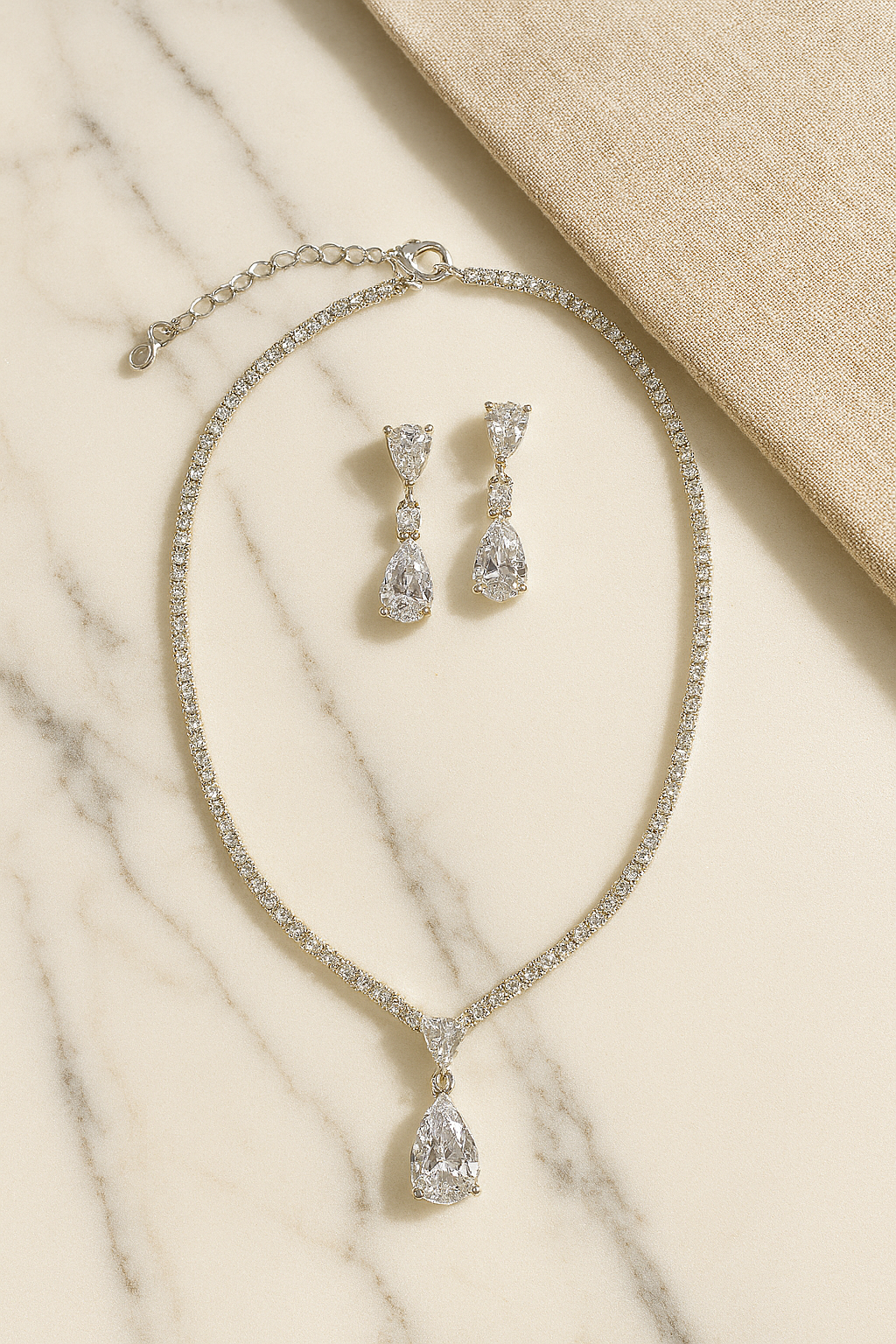 Timeless and refined, this teardrop crystal jewelry set features a pavé-lined necklace with a dramatic pear-cut centerpiece, paired with elegant drop earrings that mirror the design. The set delivers balanced brilliance and graceful symmetry, ideal for formal occasions, bridal styling, or black-tie events.